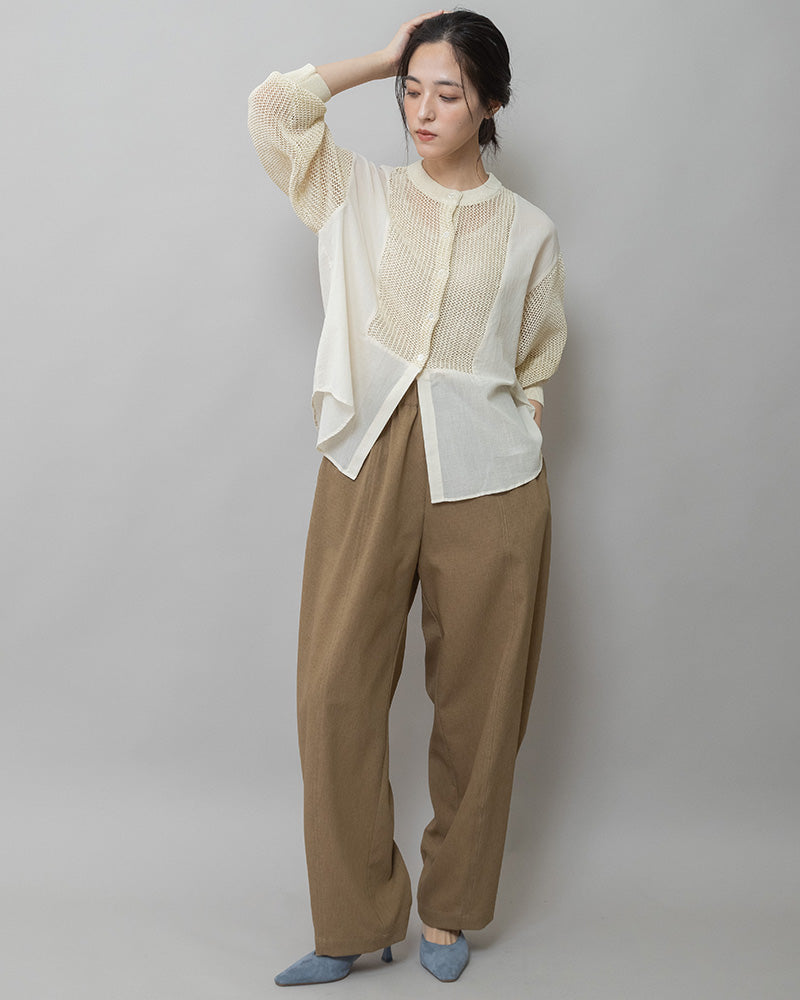 繊細なスカシ編みニットと、ふんわりと空気を含むコットンボイル素材を組み合わせたドッキングシャツ。ニット部分は程よい透け感で、肌見せを抑えつつ、春らしい軽やかさを演出。