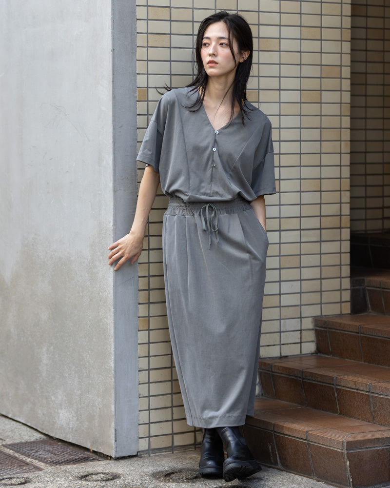 なめらかな艶感が特徴のサテンジャージ素材を使用した、トップスとスカートのセットアップシリーズ。サテンの上品な光沢と、ジャージ素材ならではの伸びやかさを併せ持ち、見た目の美しさと快適な着心地を両立しました。トップスは程よくゆとりのあるシルエットに、首元をすっきり見せるVネックデザイン。