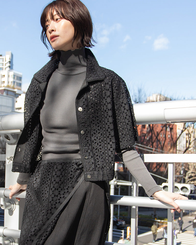 首元の高さや袖口の長さなど、細部まで計算されたシルエットが上品な印象に。