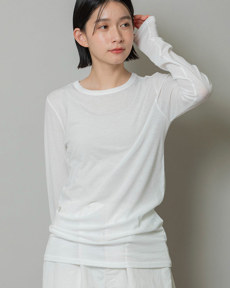 透け感のある軽やかな素材が魅力のカットソー。肌に馴染むソフトなタッチで、着心地も抜群。シャツやニットのインナーとしてはもちろん、一枚で着てもニュアンスのある表情を演出します。シンプルながら、レイヤードスタイルを上品に仕上げる名脇役です。