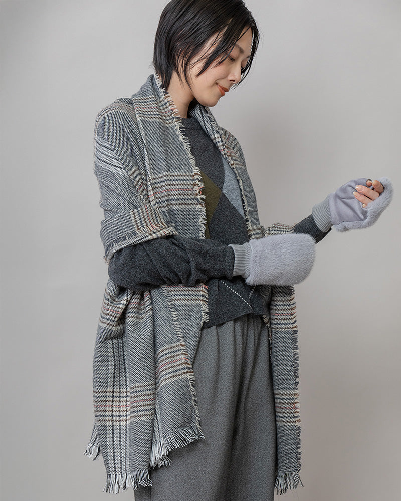 ほどよいフリンジが動きのある表情をプラスし、シンプルなコーディネートのアクセントとして重宝します。ニュアンスのあるカラーリングは、グレー系やダークトーンの冬服との相性も抜群。防寒とおしゃれ見えを両立する、これからの季節に欠かせない万能アイテムです。