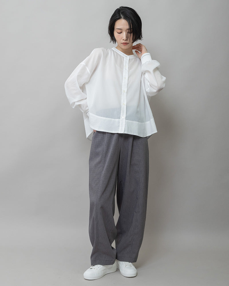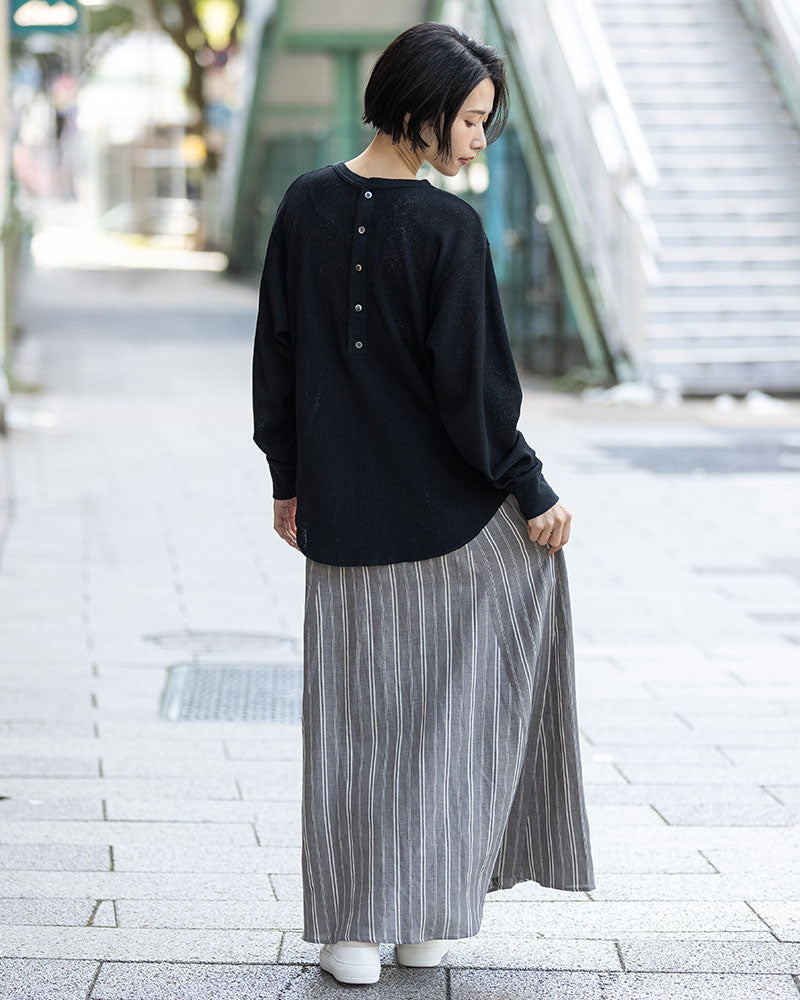 ゆったりとしたシルエットなので、ロングスカートやワイドパンツと合わせたリラックス感のあるスタイリングがおすすめです。バックヘンリーデザインが後ろ姿のアクセントになり、シンプルなコーディネートでもさりげないポイントに。