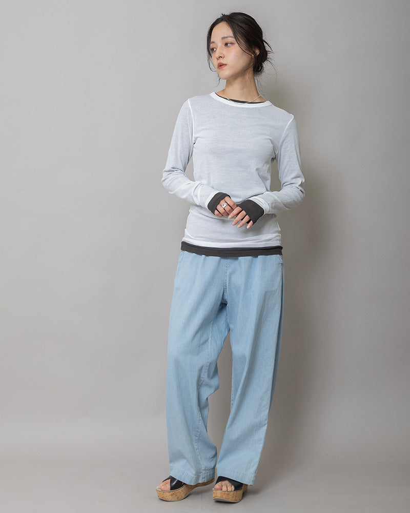一枚で軽やかに着るのはもちろん、ジャケットやシャツのインナーとしても活躍する、着回し力の高いアイテムです。※着用写真は色違いをレイヤードしたスタイリングです。