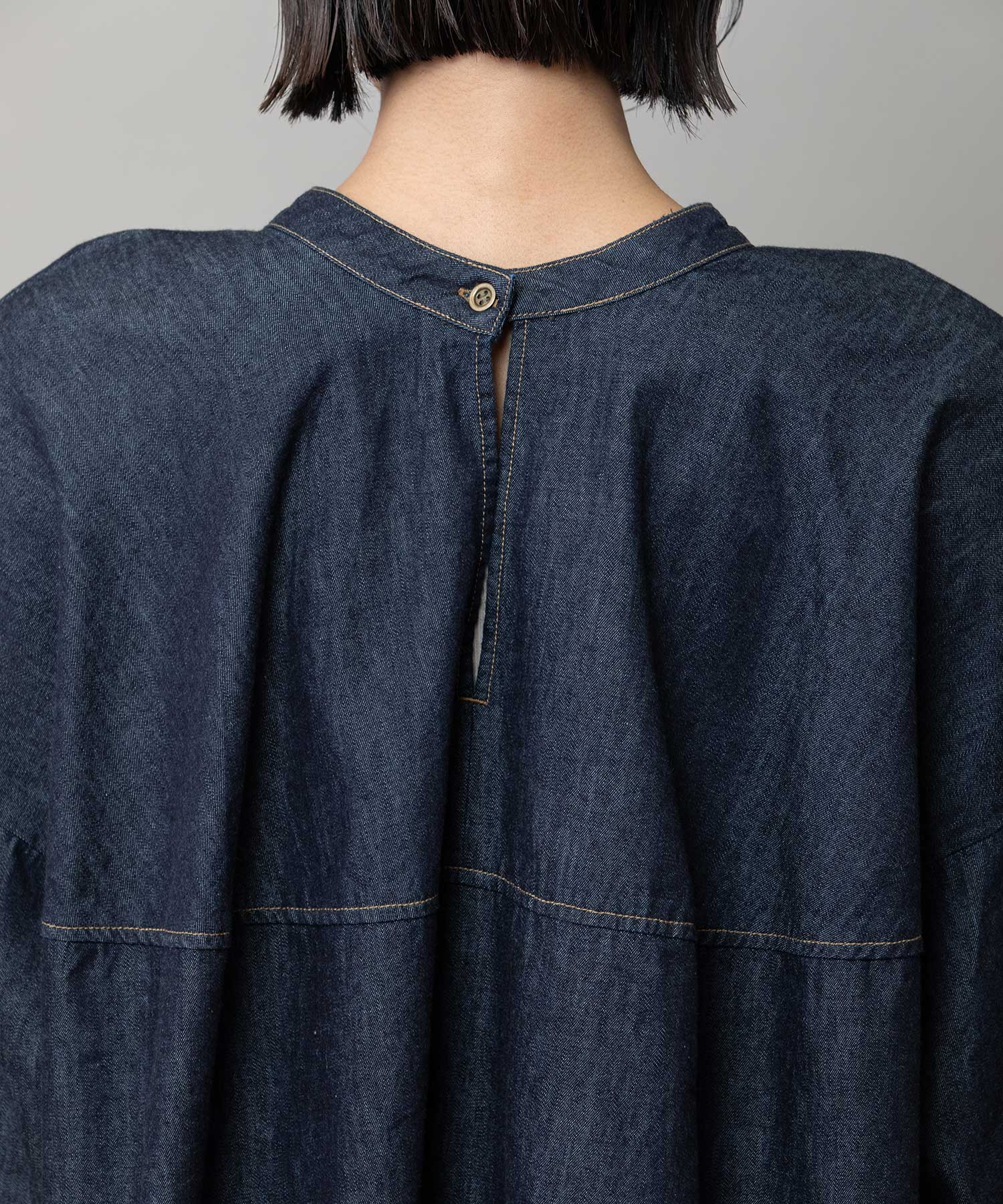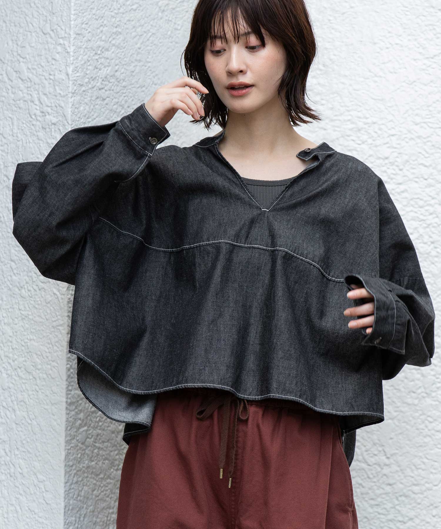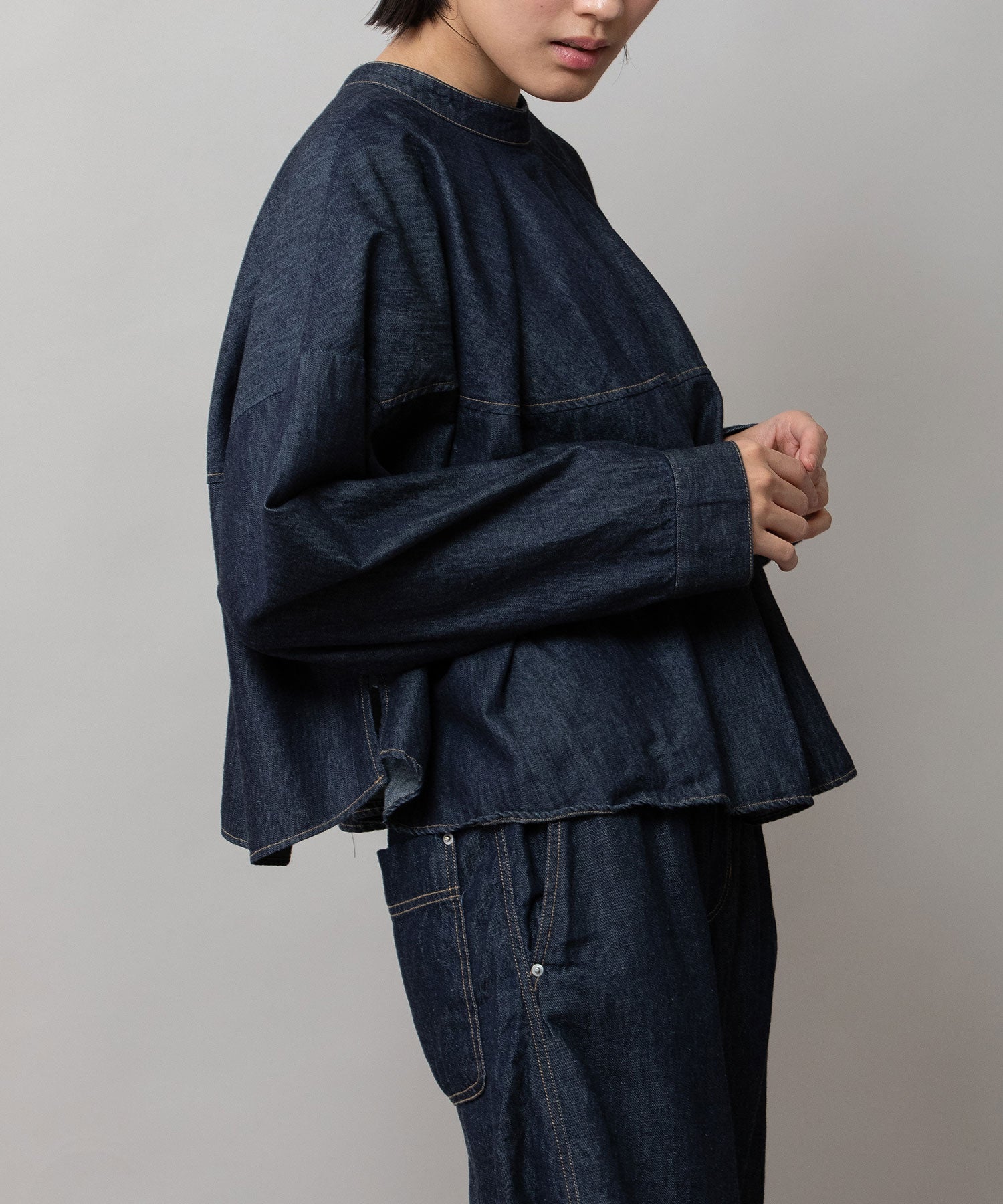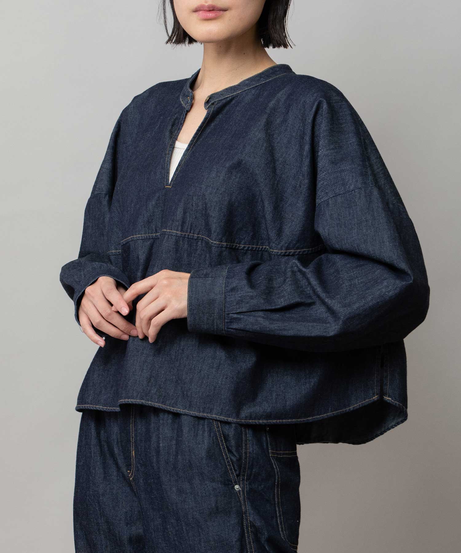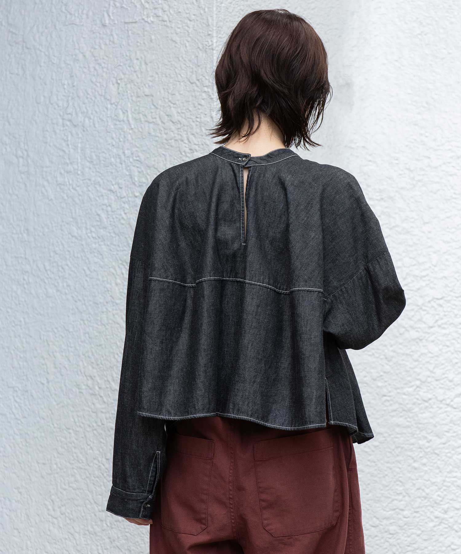 ◆前後着用可能な2way仕様。ライトオンスデニムのショート丈デザインブラウス◆