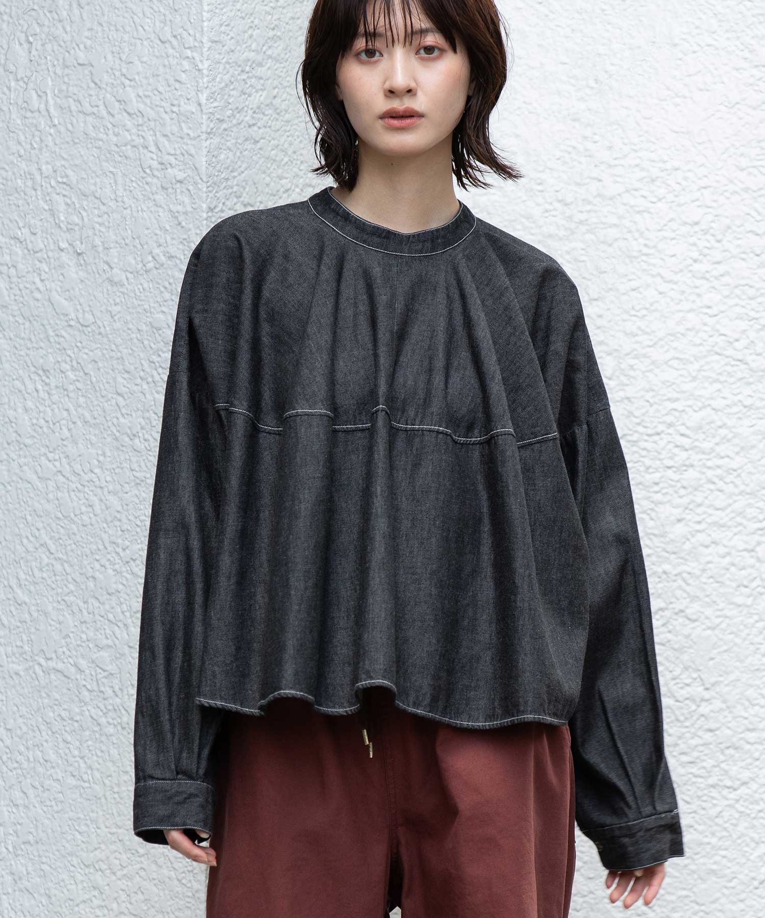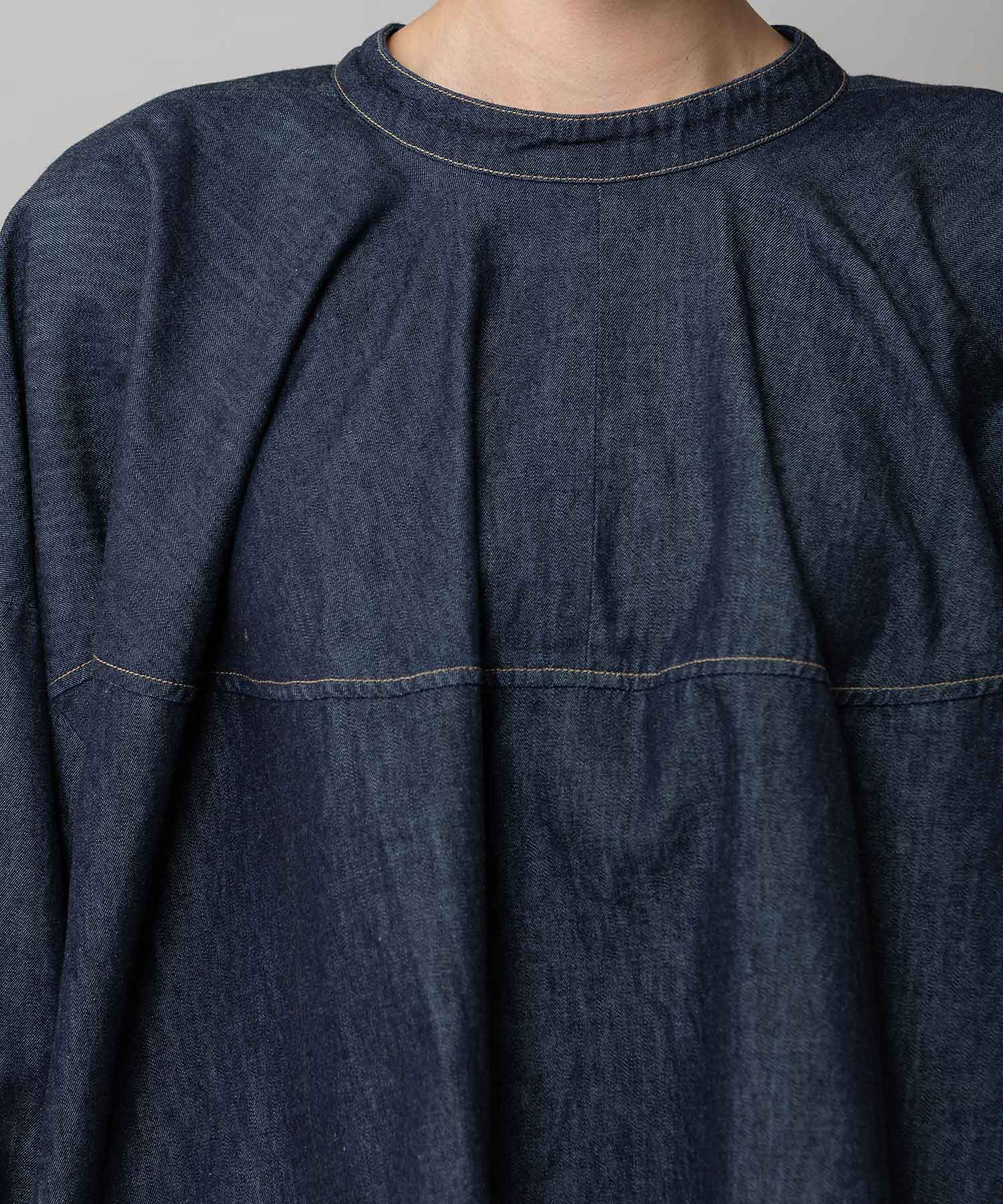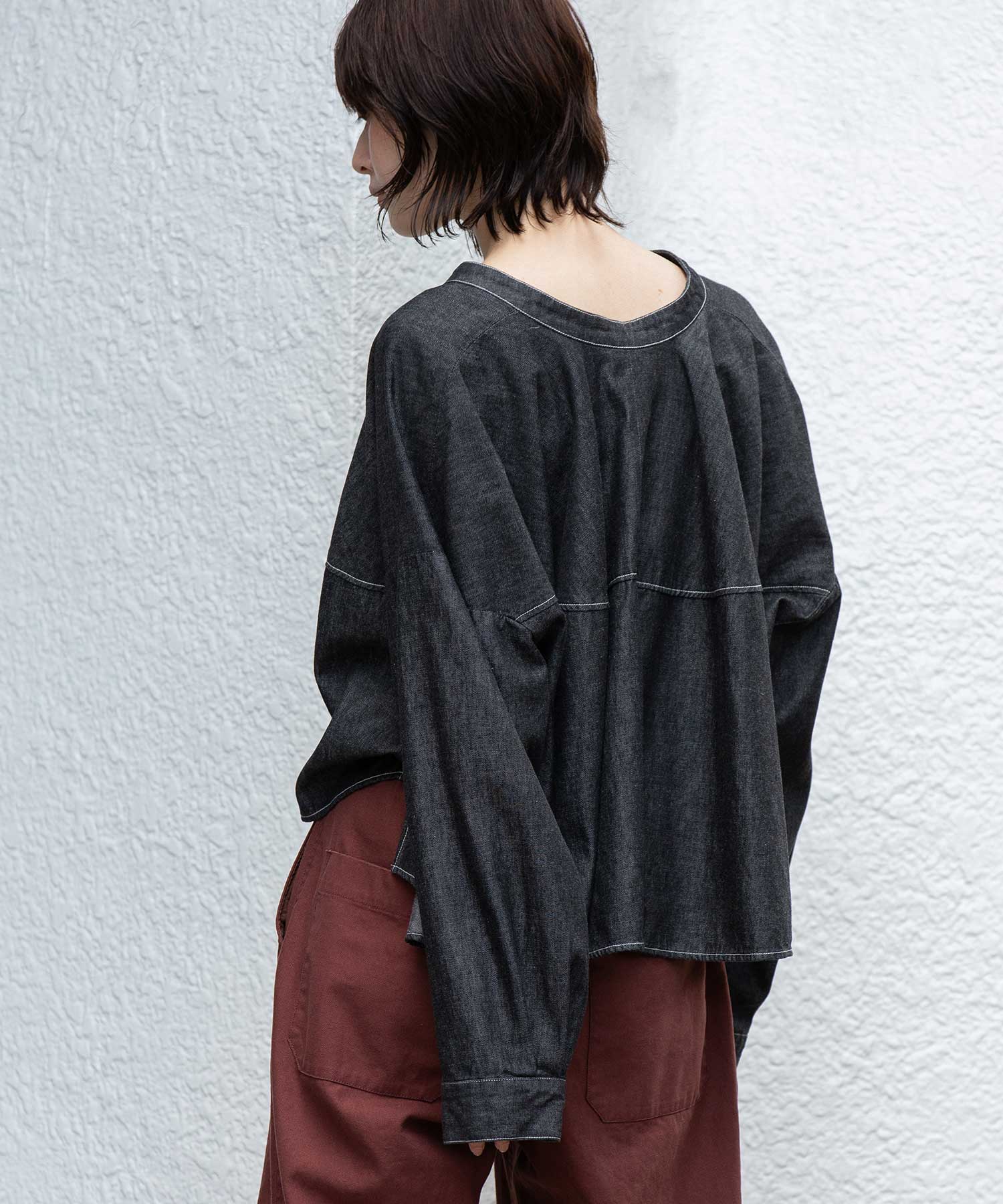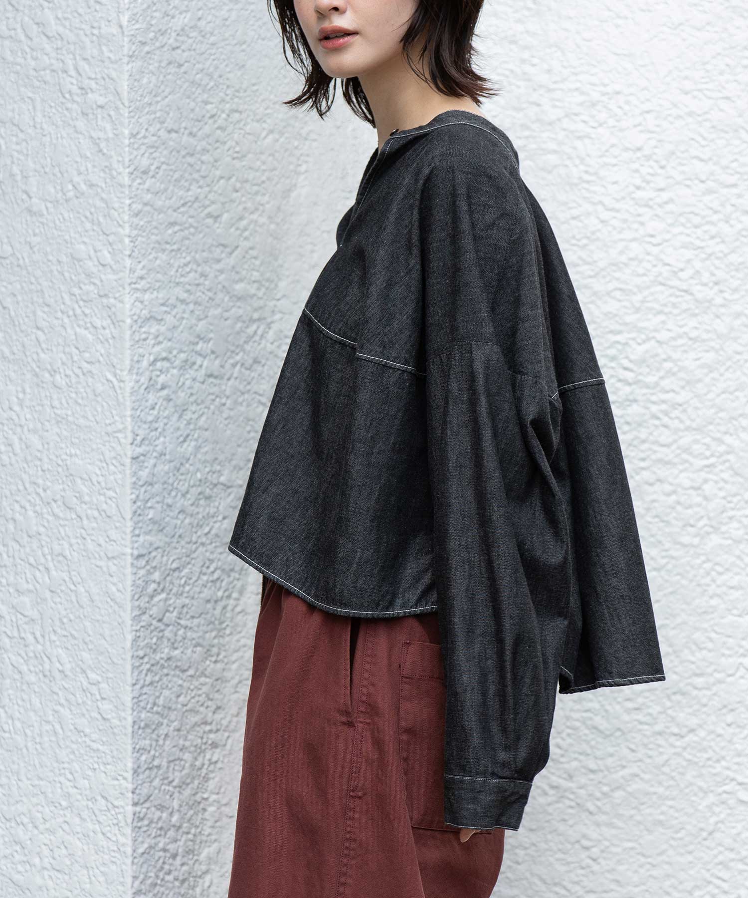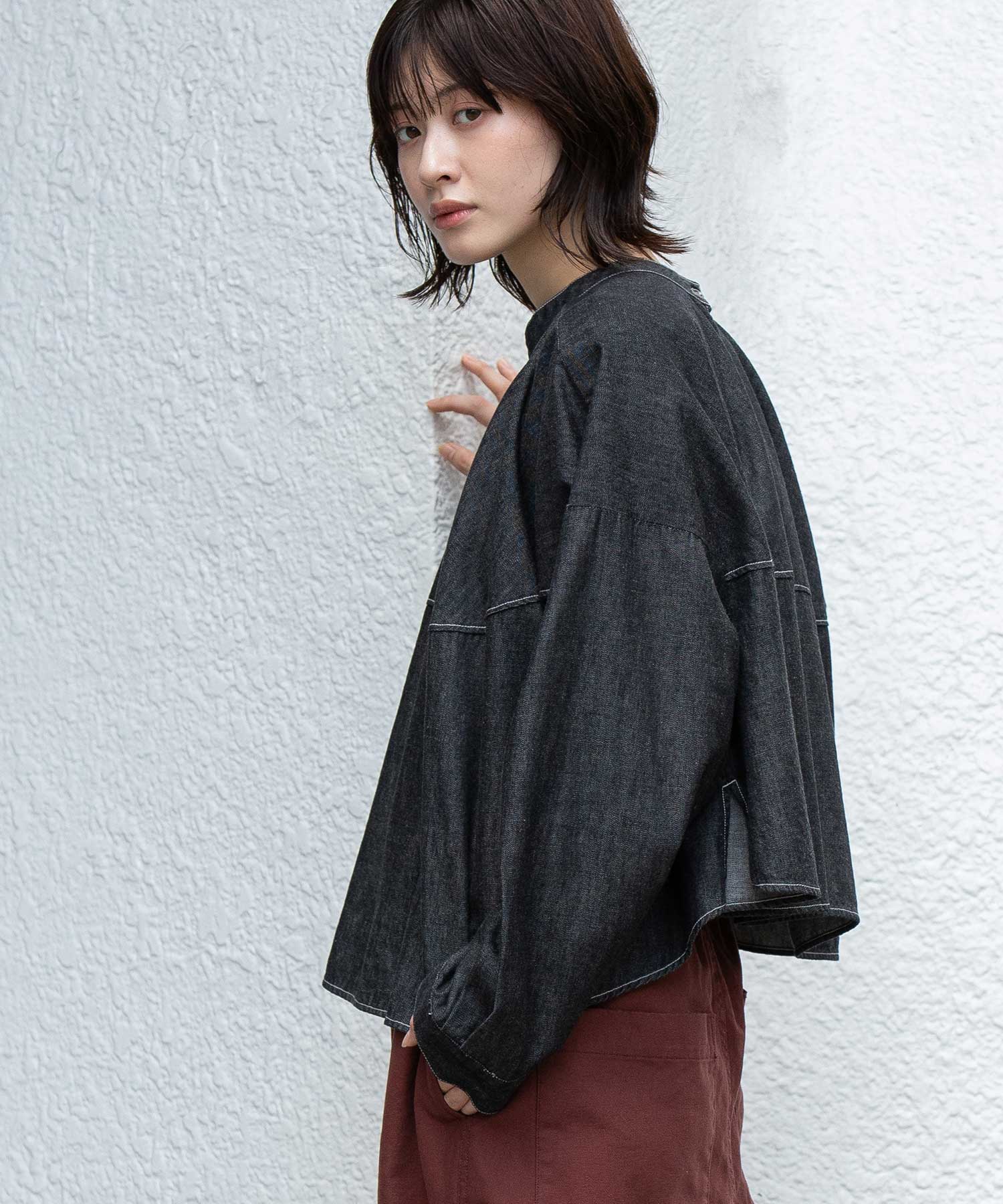 ◆前後着用可能な2way仕様。ライトオンスデニムのショート丈デザインブラウス◆