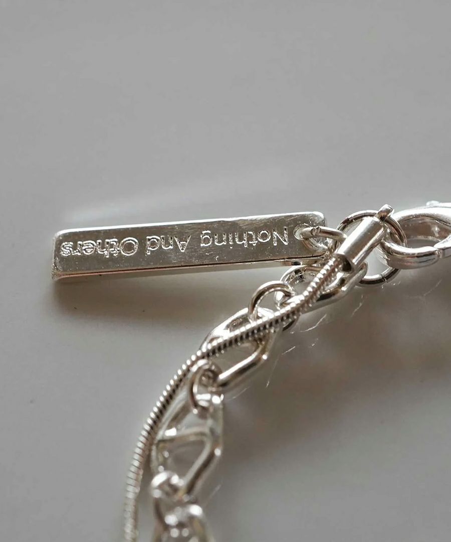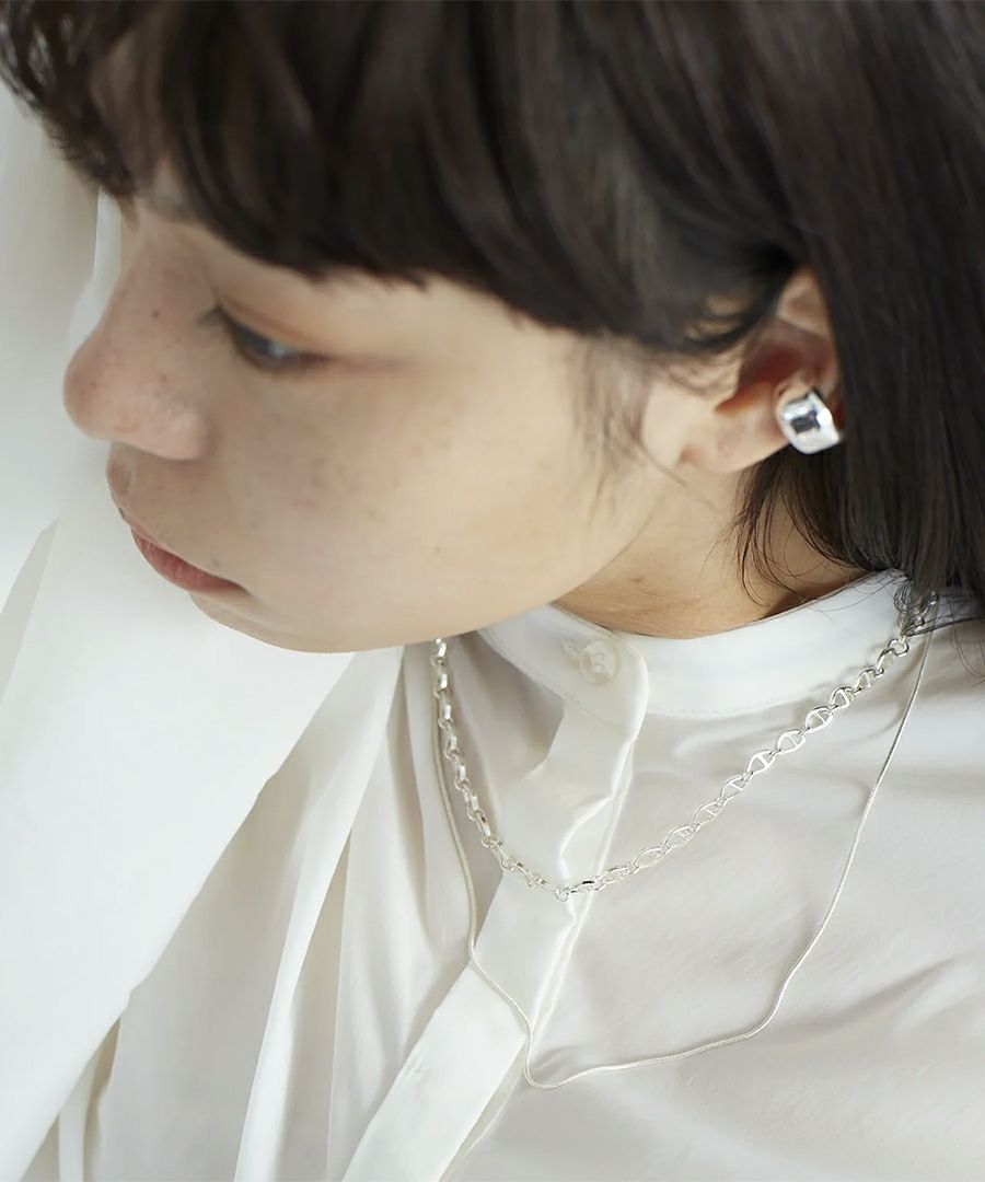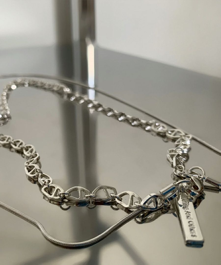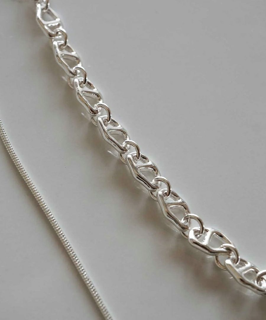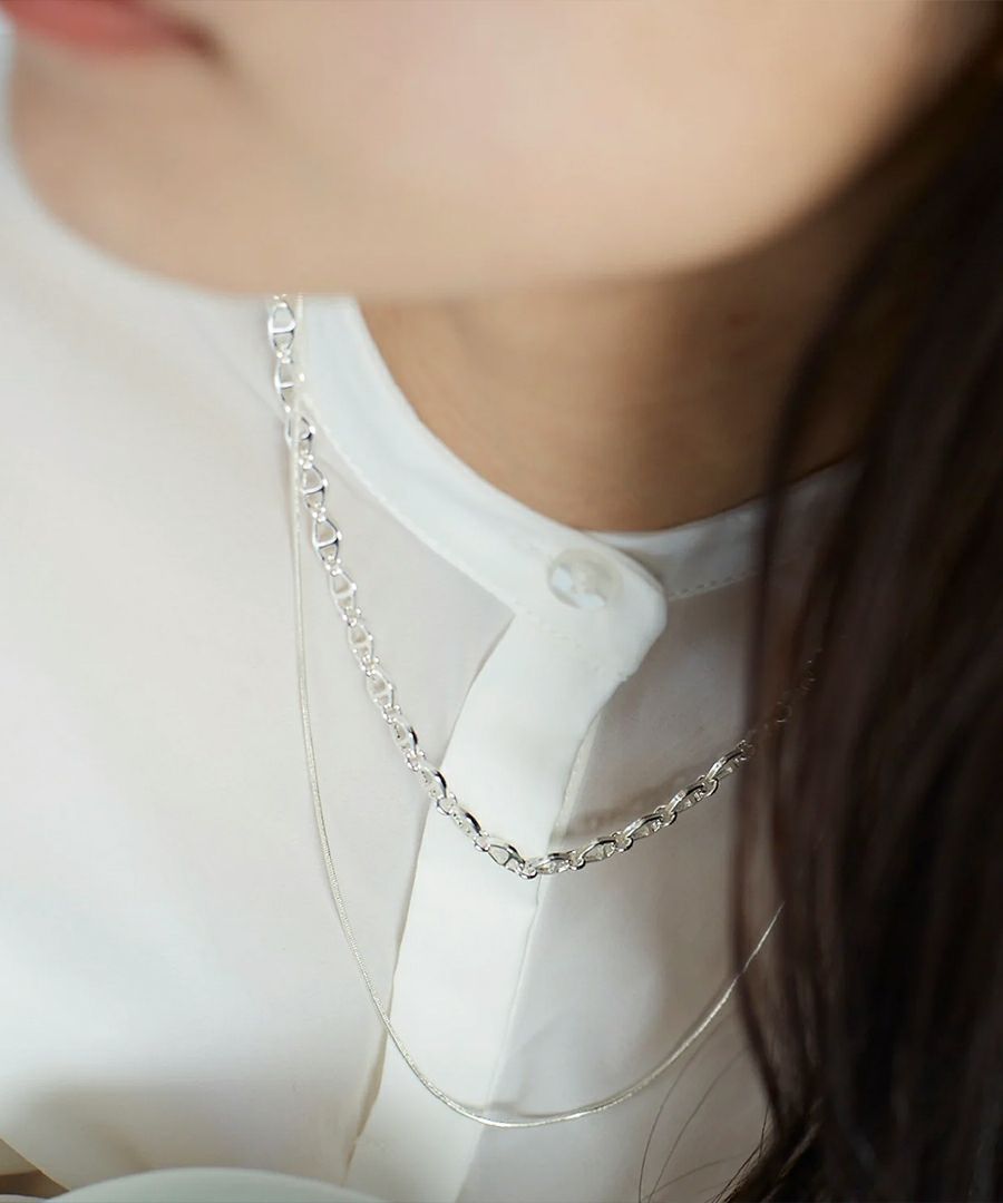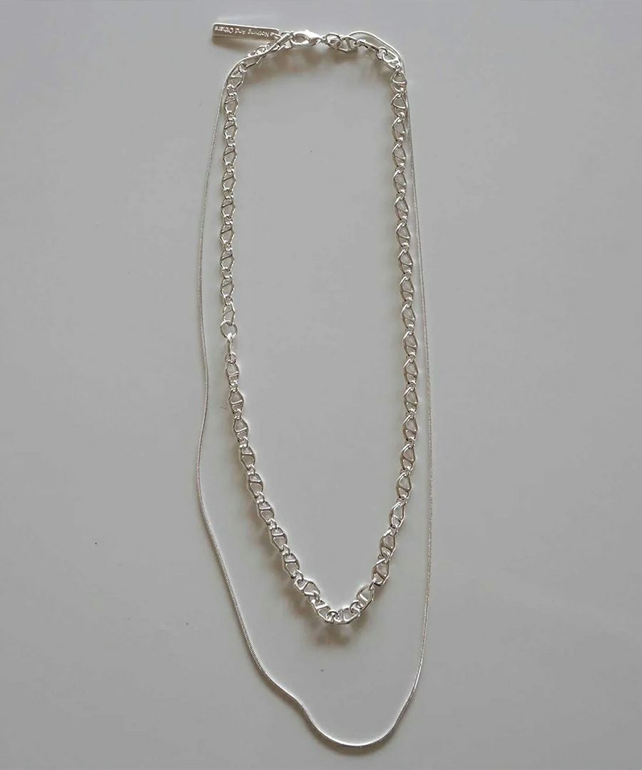 中細サイズのニュアンスパーツを繋いだデザインチェーンと、丸線の華奢なスネイクチェーンを2連にしたネックレス。