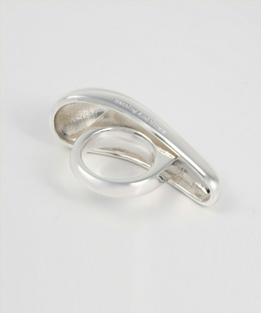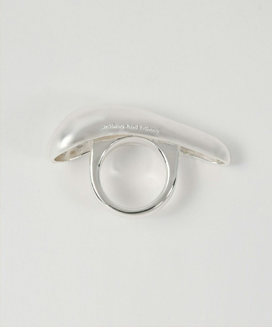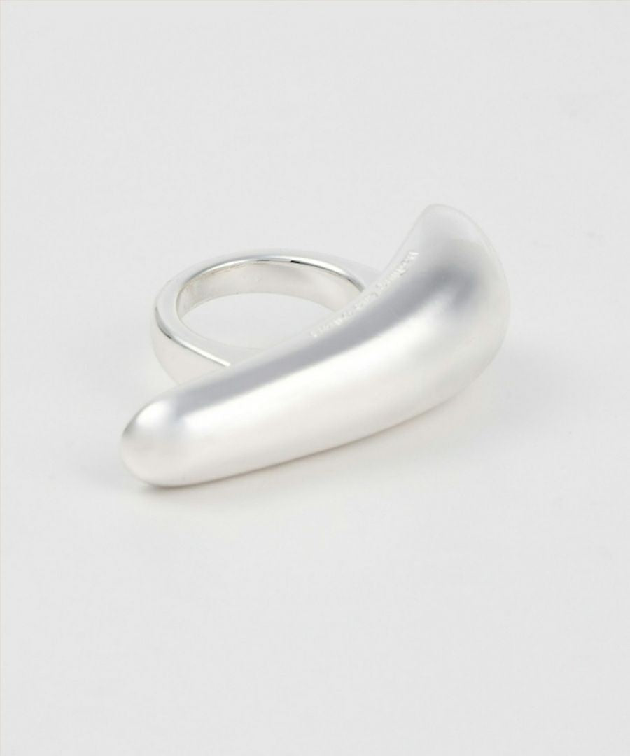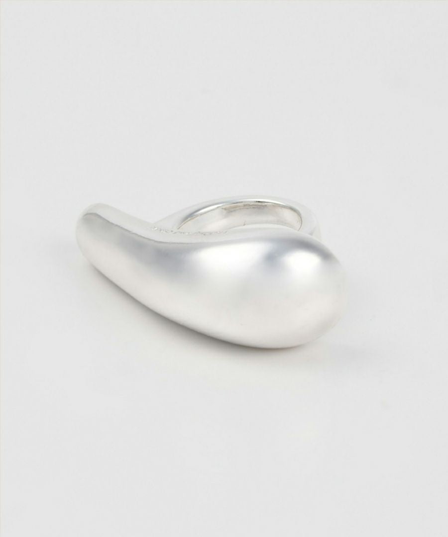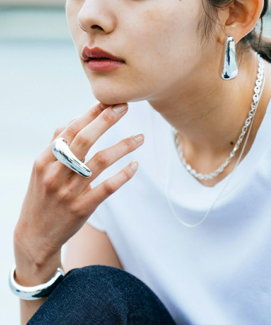 インパクトのあるドロップモチーフは2本の指にかかる大ぶりなサイズ感ながら、指に沿うようなゆるやかなカーブラインでやわらかく女性らしい雰囲気。