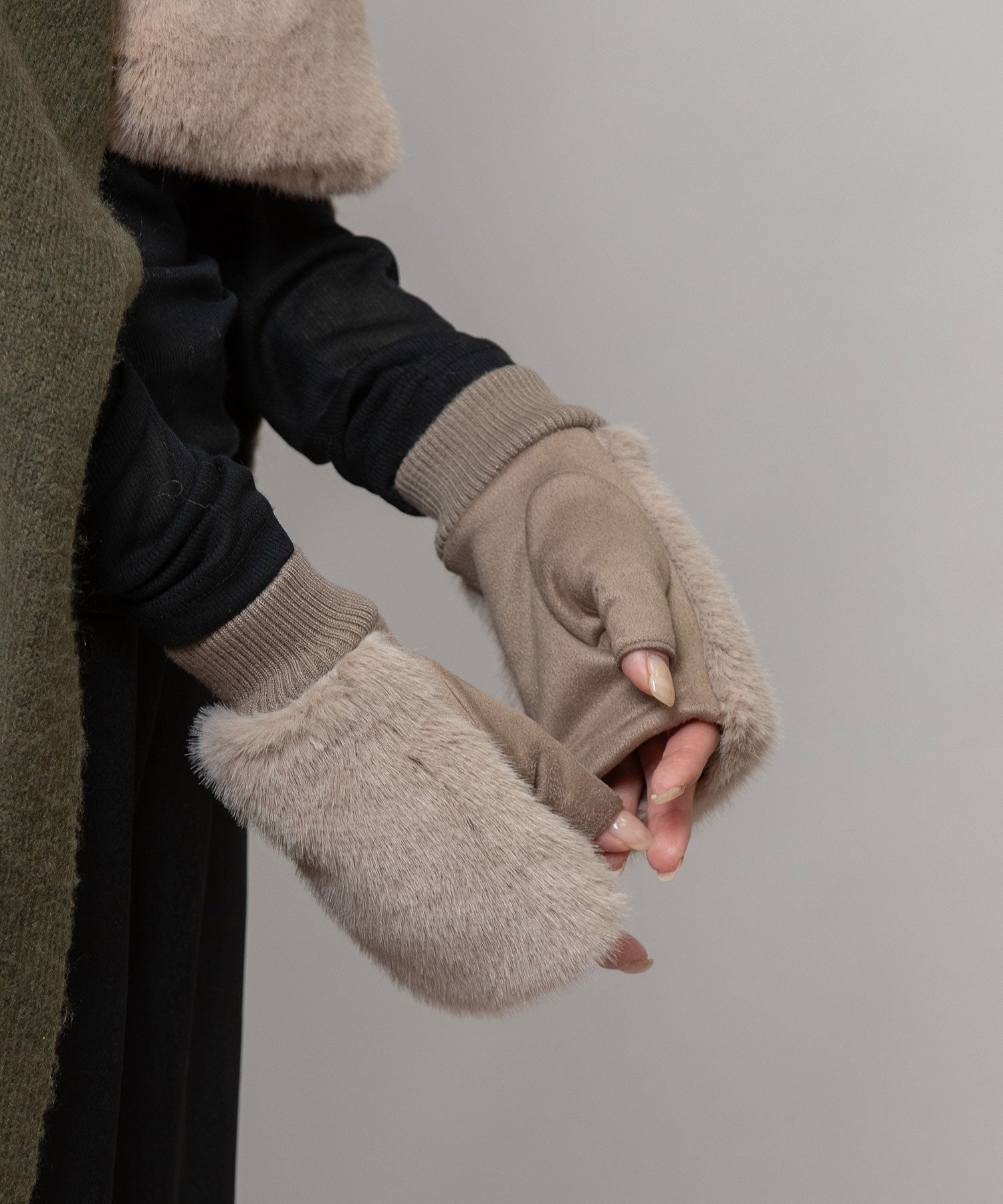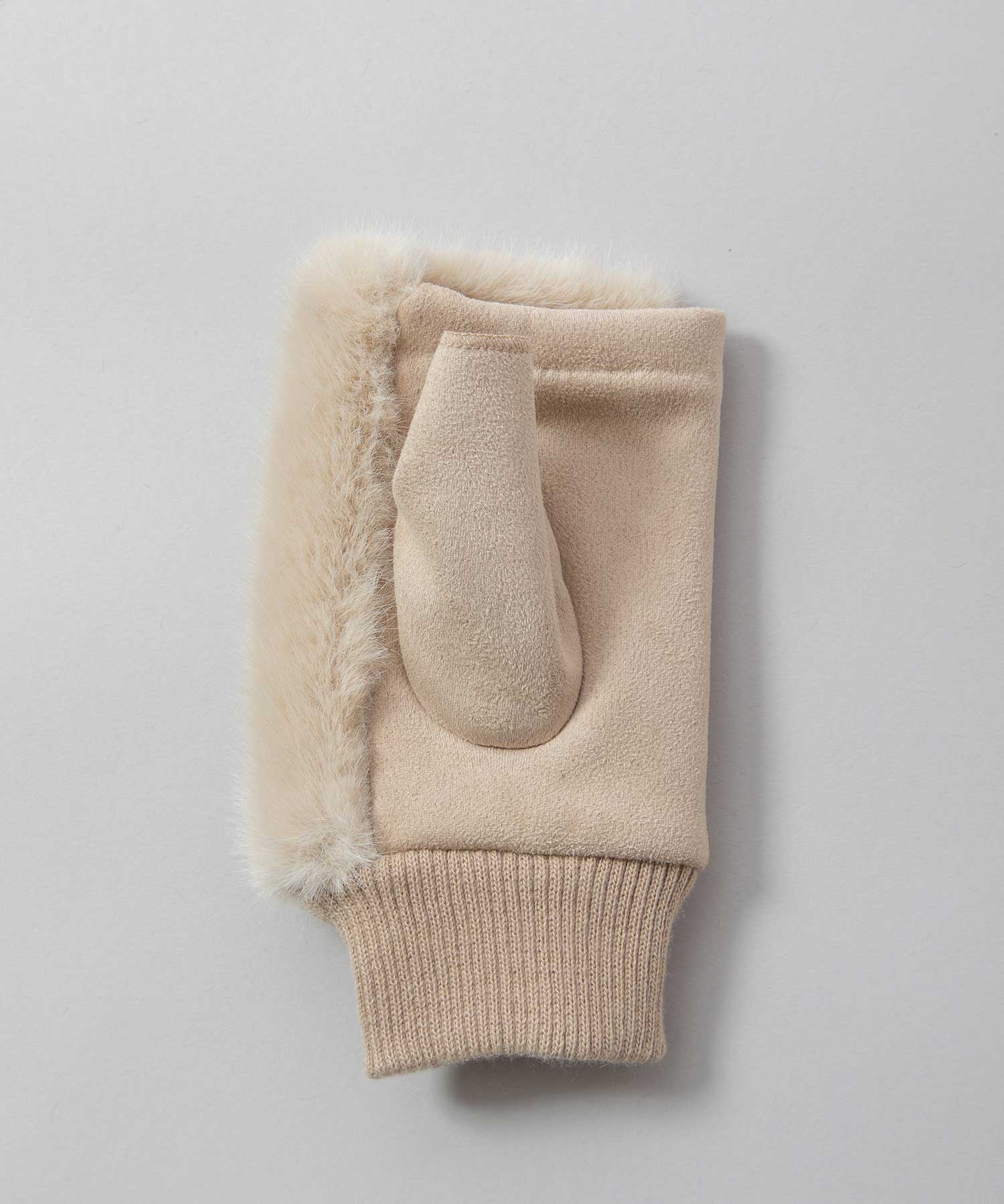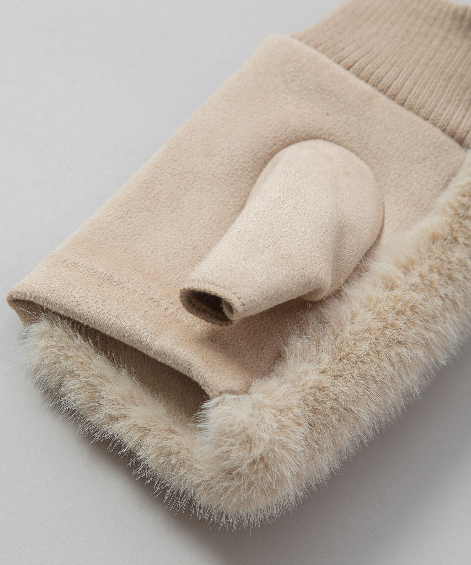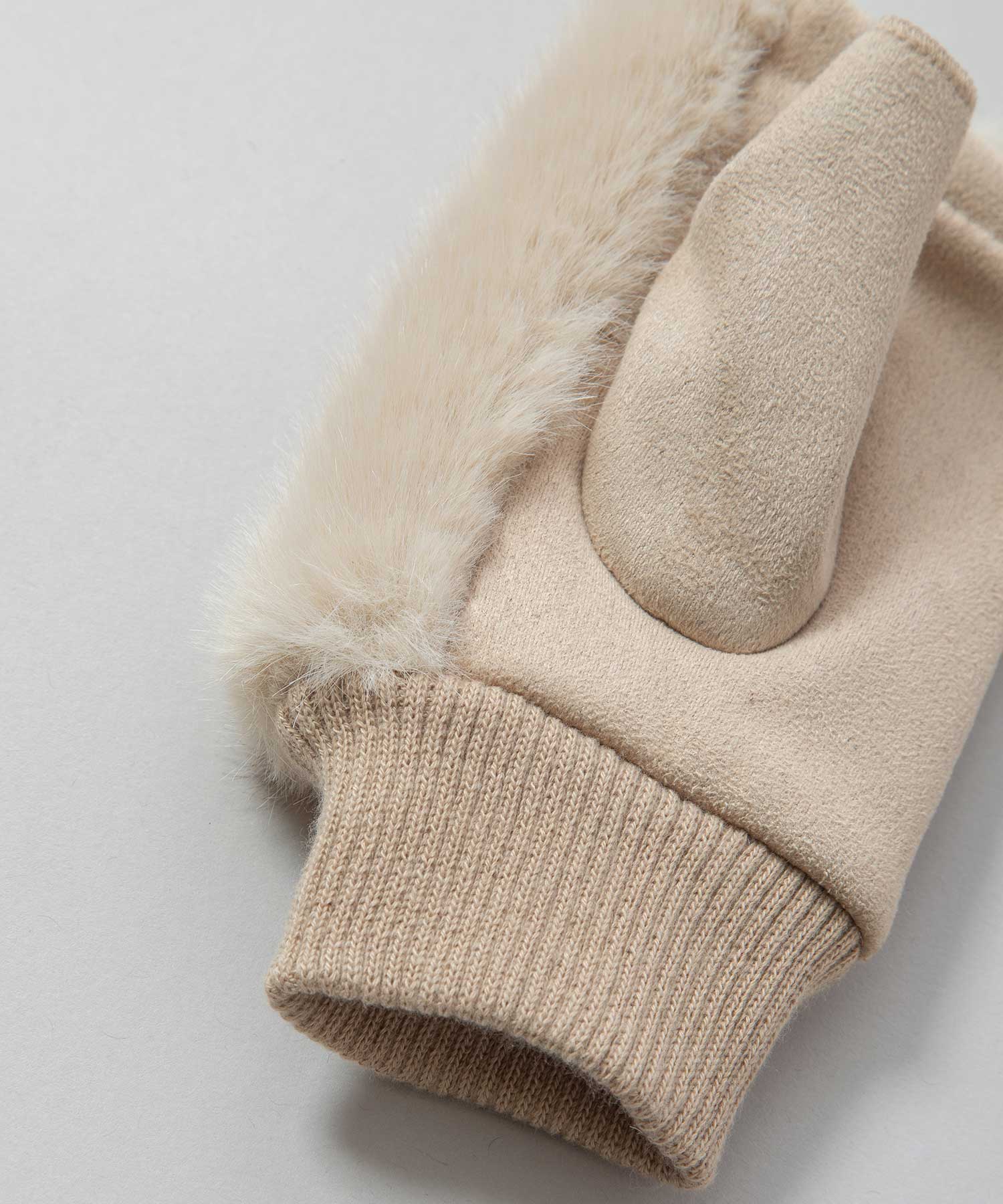 伸縮性のあるスウェード調のポリエステル素材をベースに、甲部分にフェイクファー、手首部分はニットリブを組み合わせています。