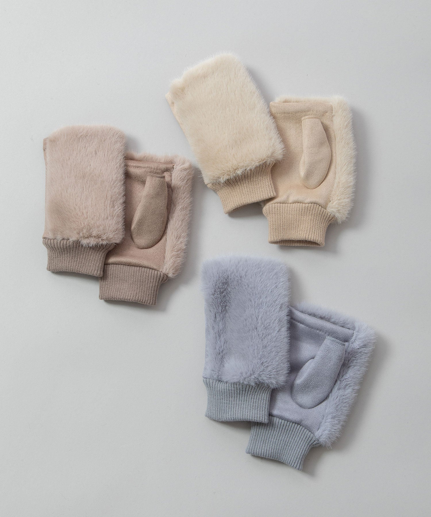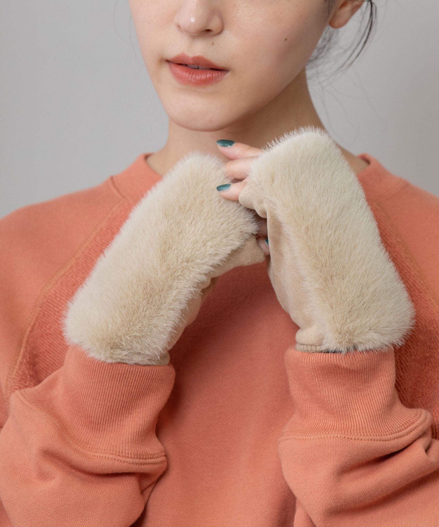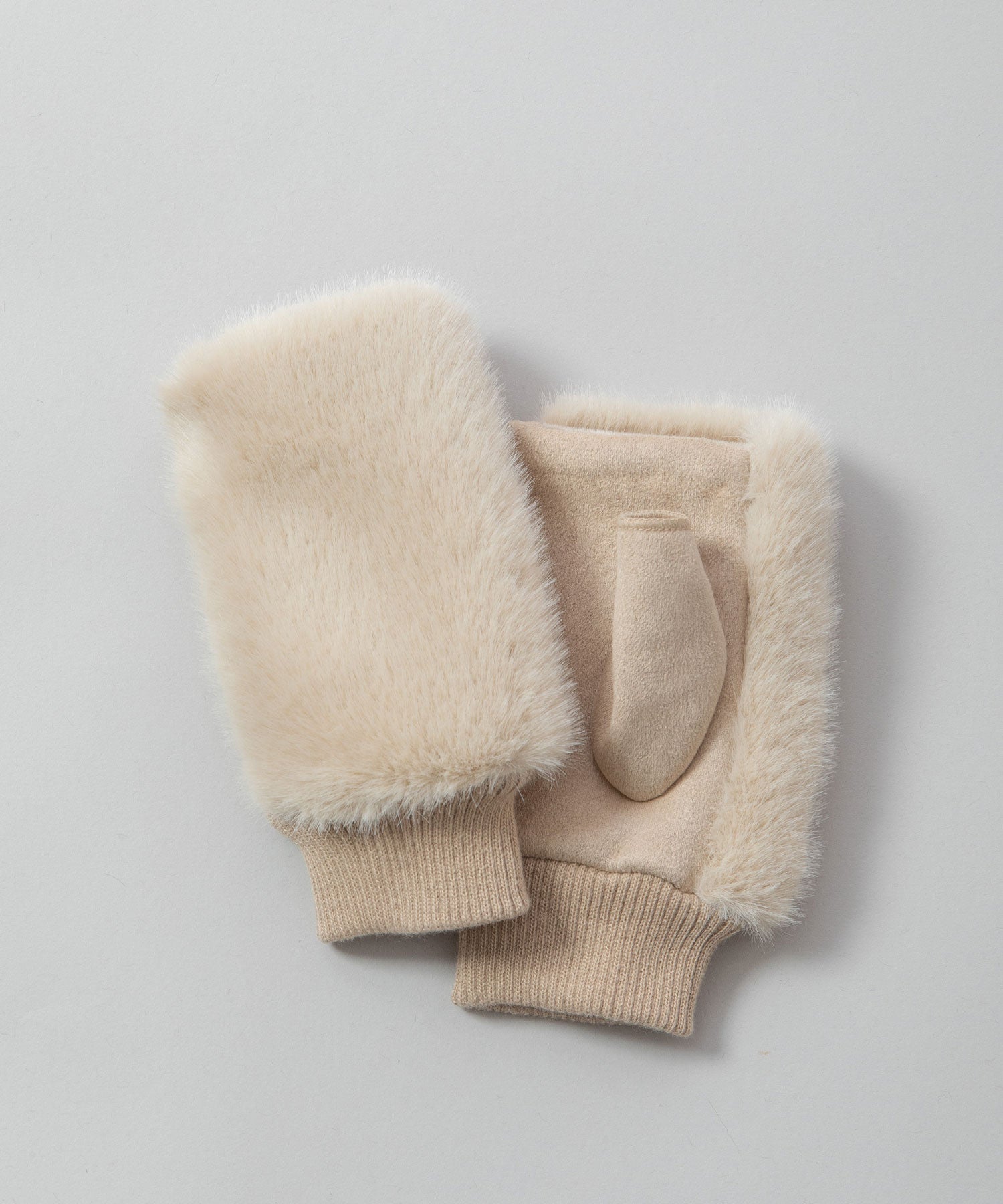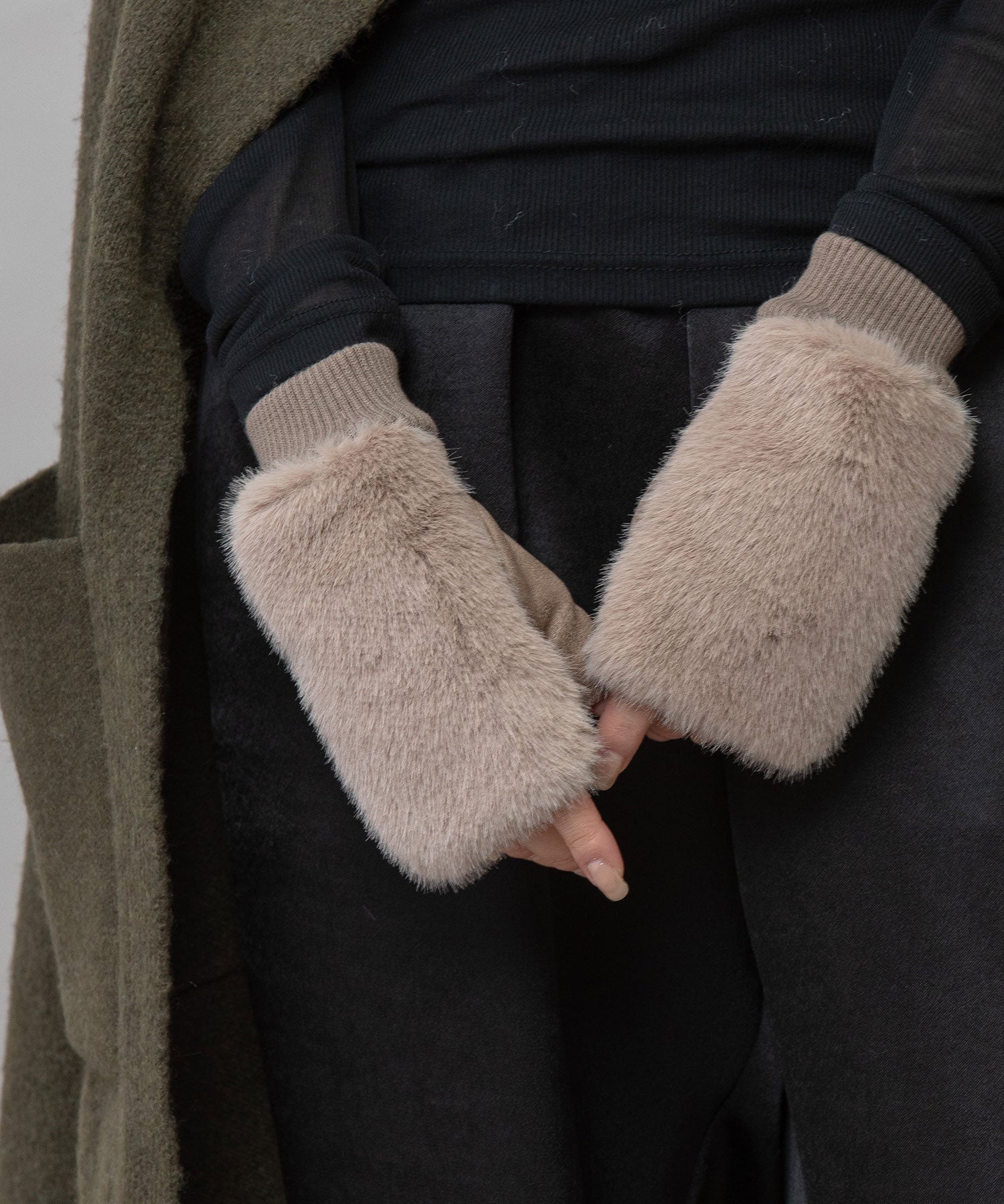 伸縮性のあるスウェード調のポリエステル素材をベースに、甲部分にフェイクファー、手首部分はニットリブを組み合わせています。