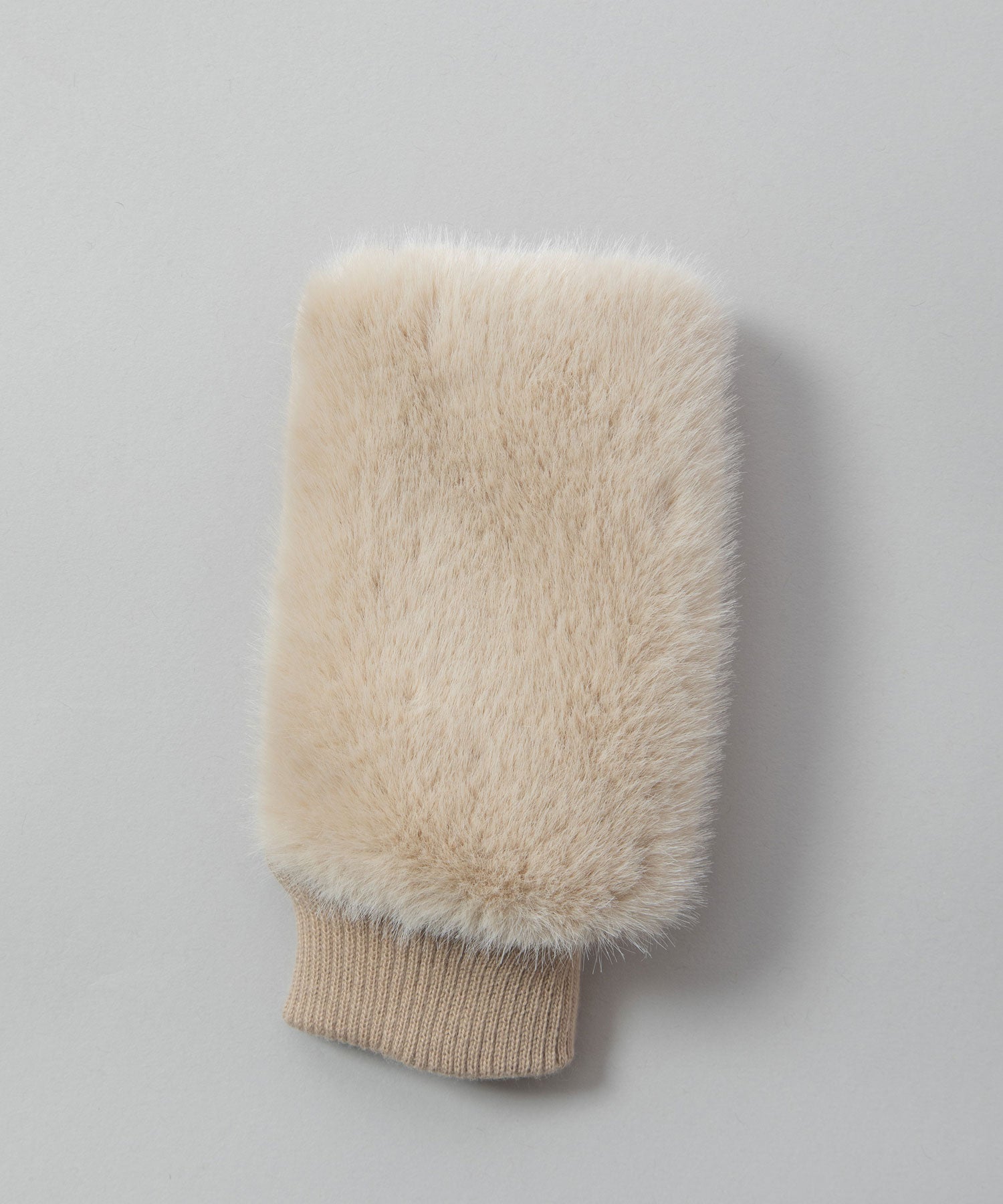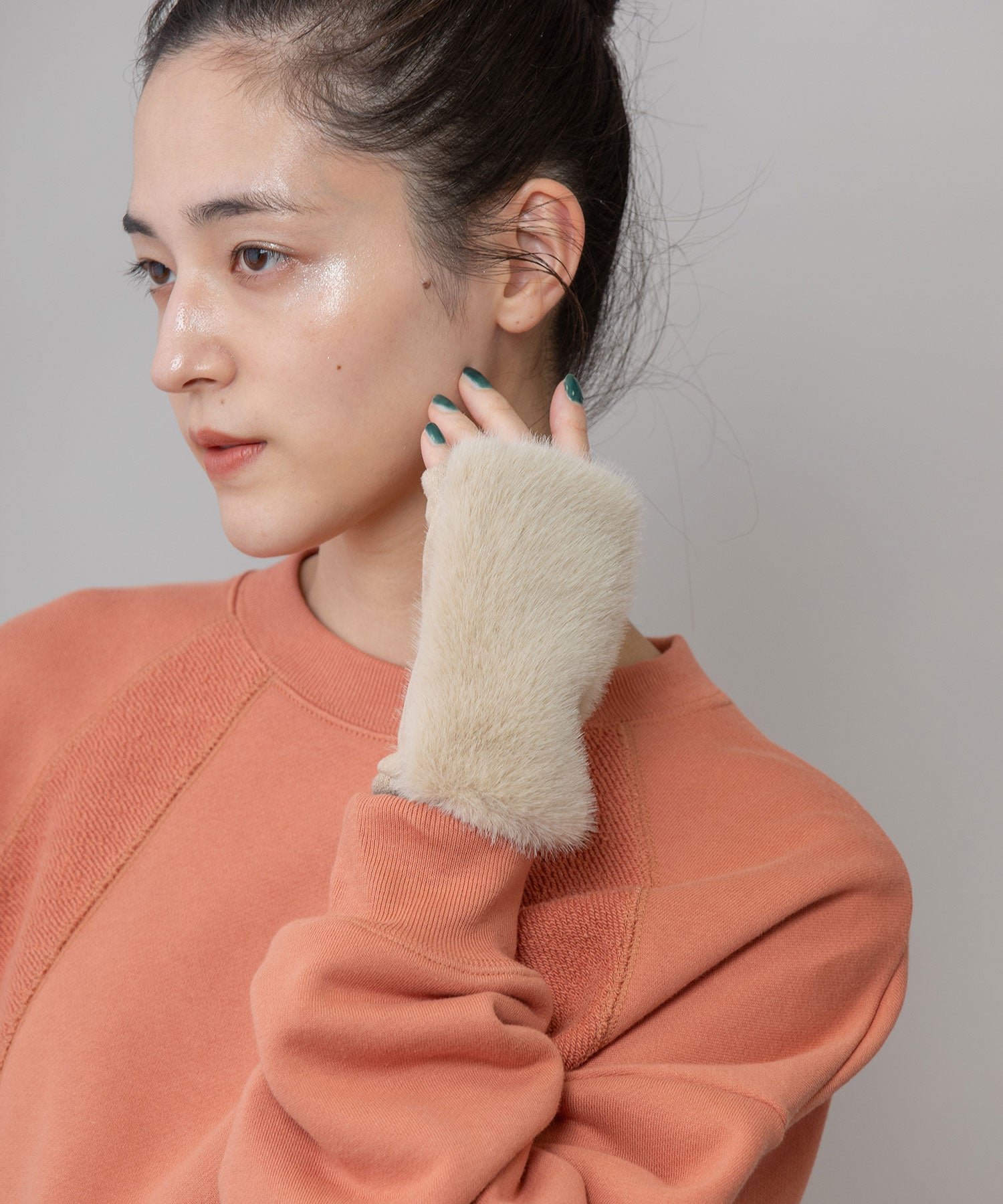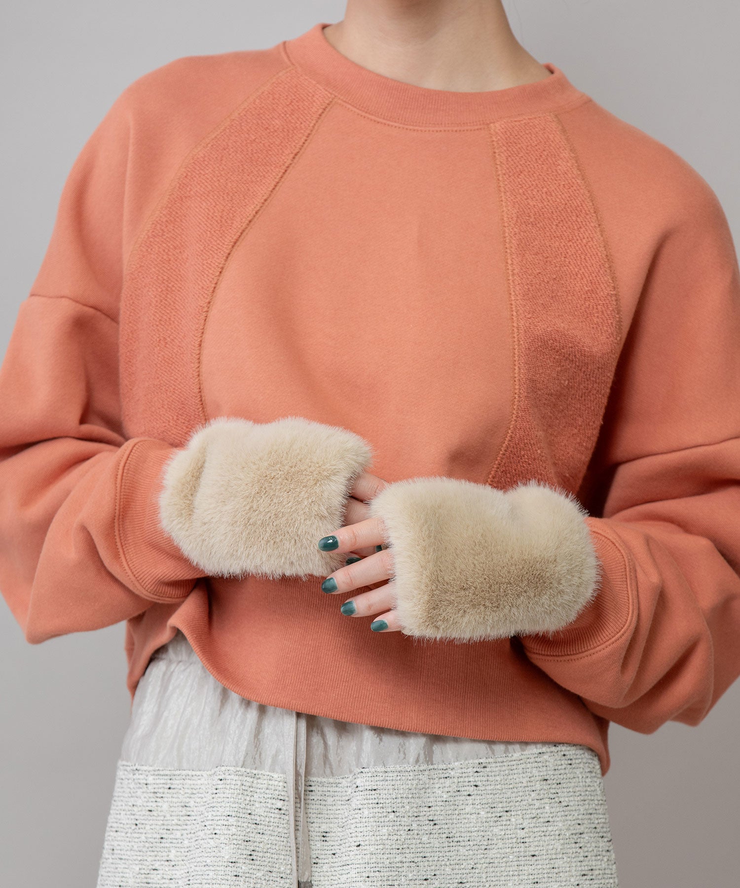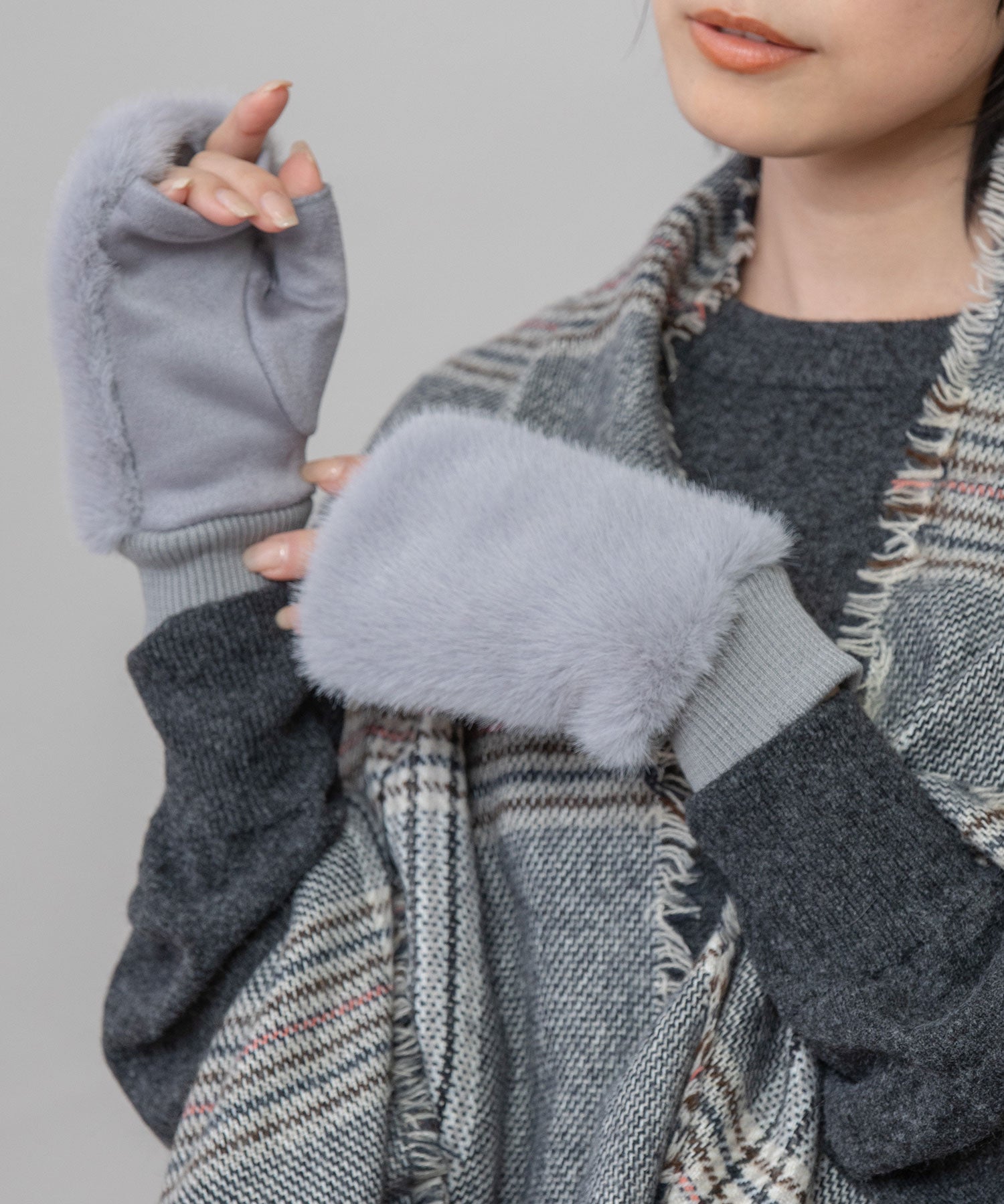 伸縮性のあるスウェード調のポリエステル素材をベースに、甲部分にフェイクファー、手首部分はニットリブを組み合わせています。