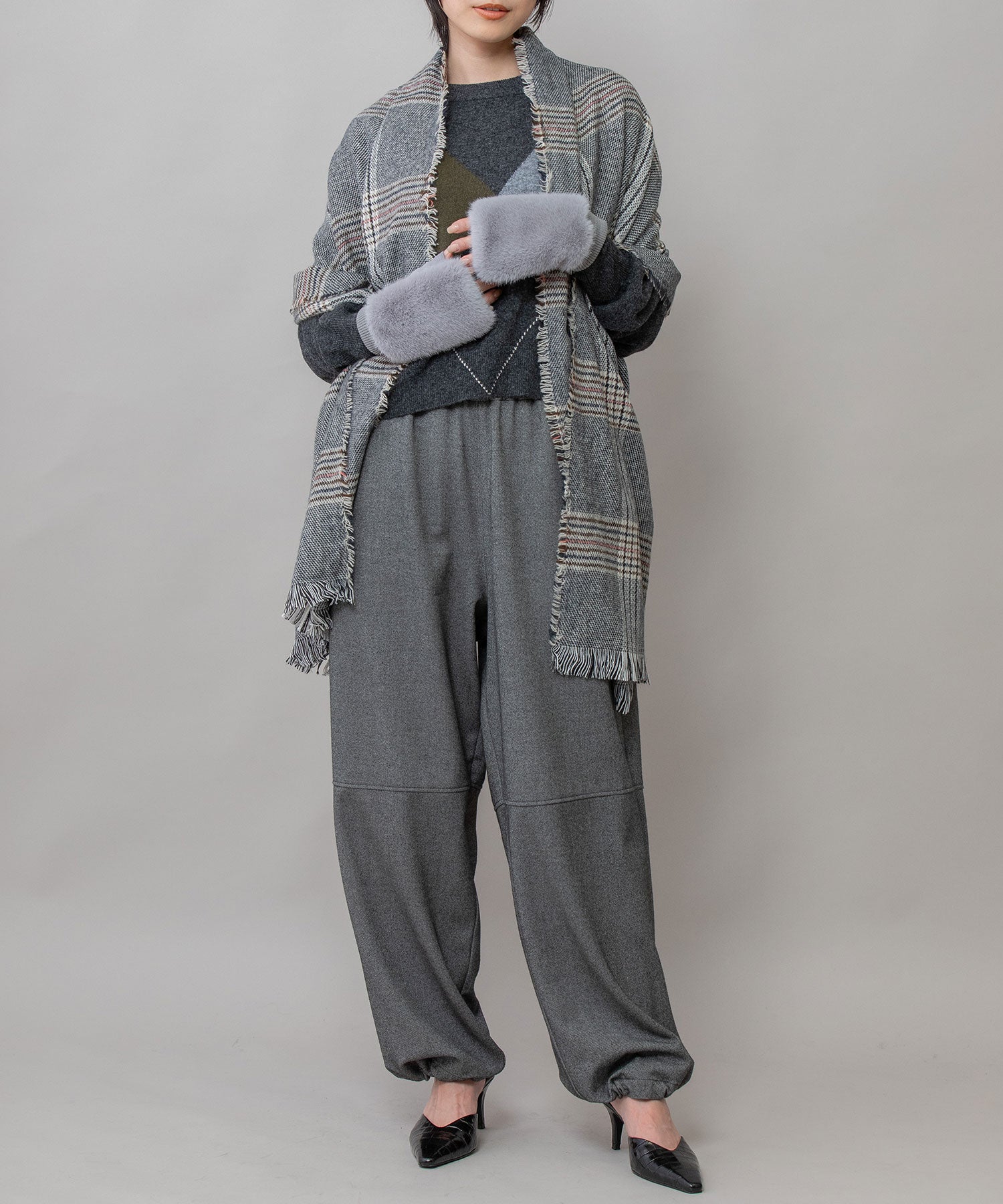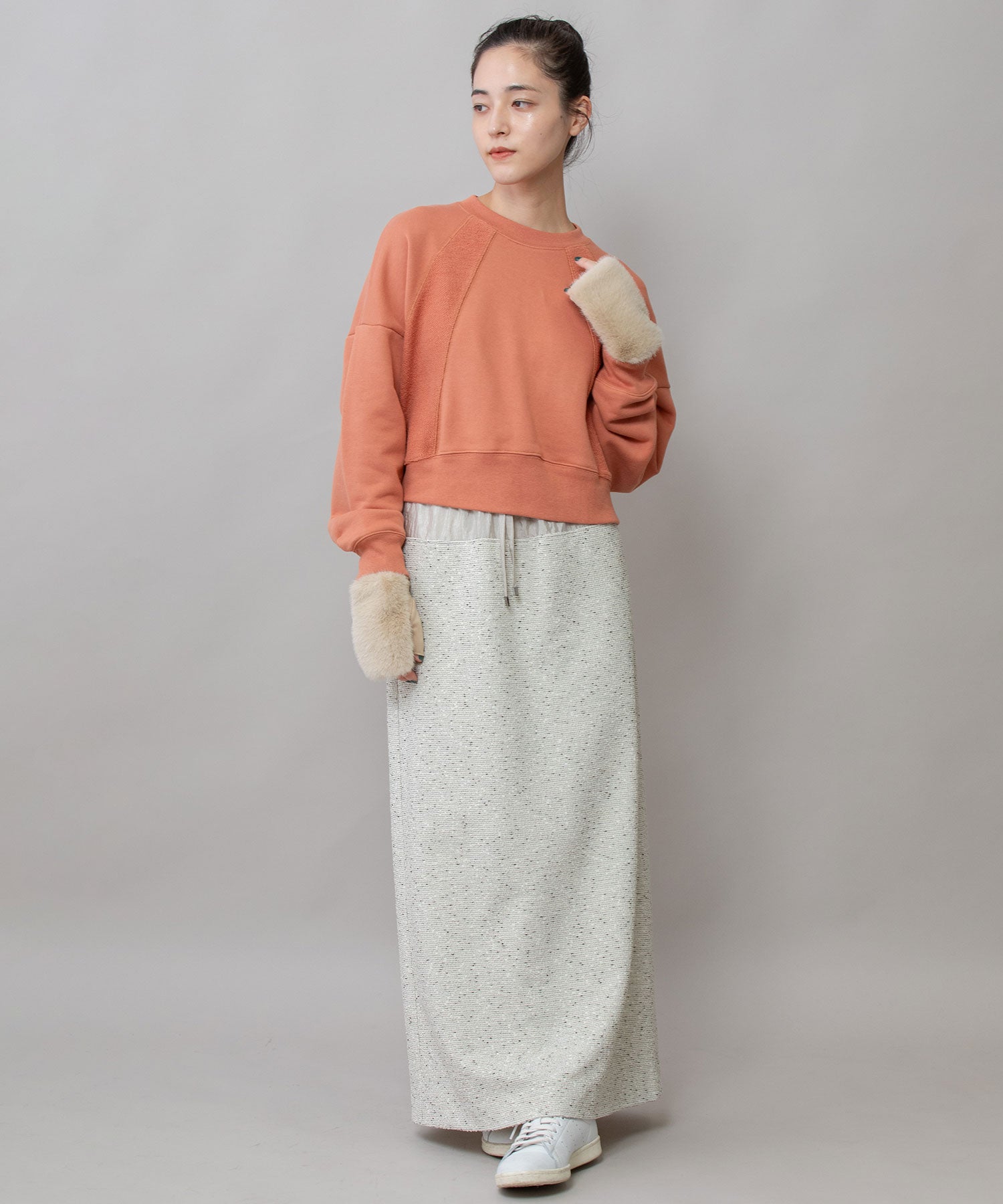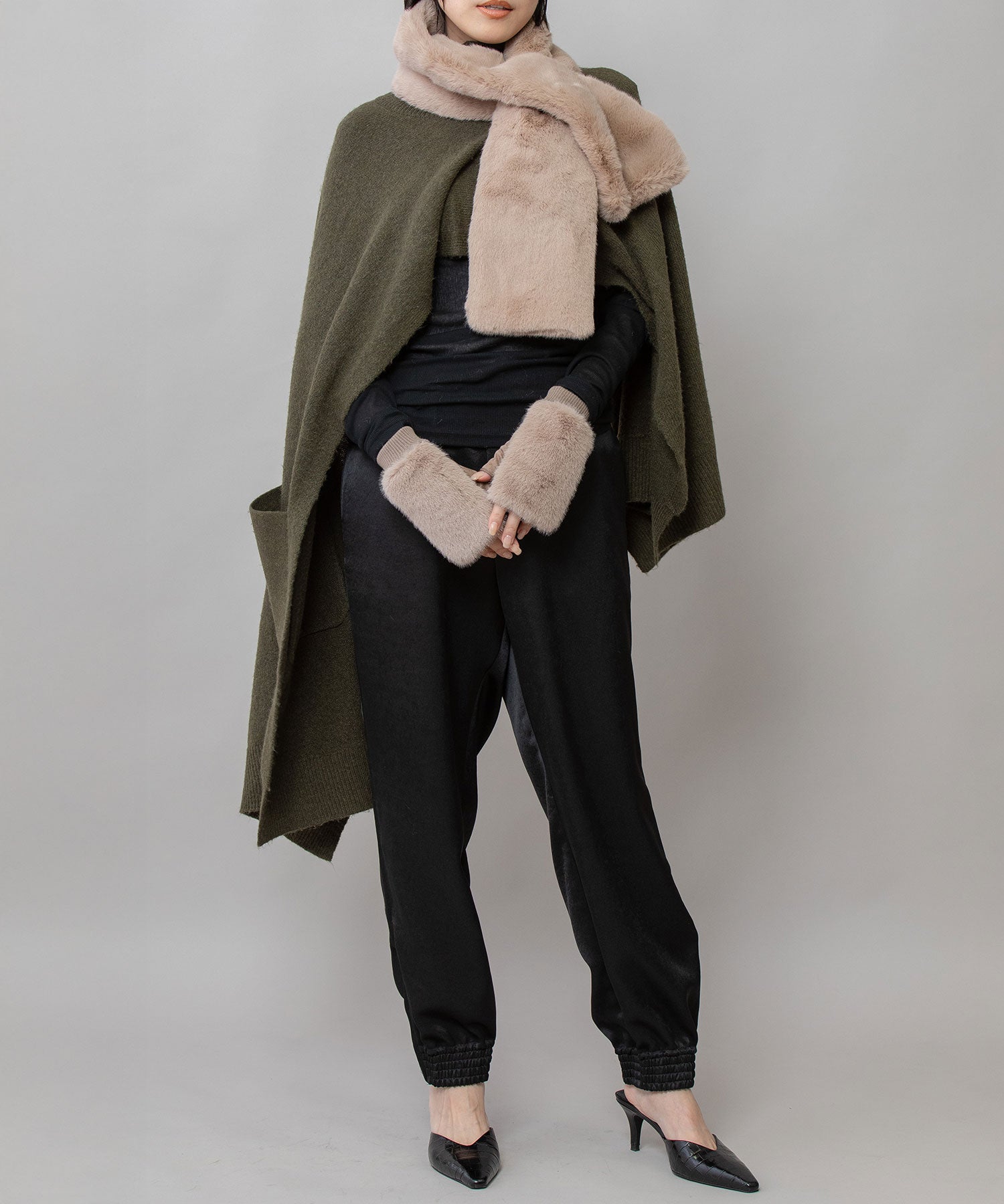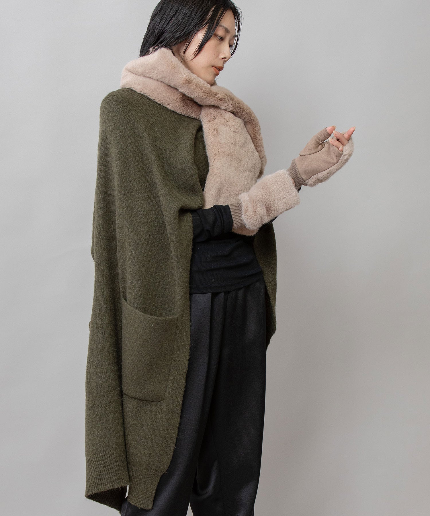 伸縮性のあるスウェード調のポリエステル素材をベースに、甲部分にフェイクファー、手首部分はニットリブを組み合わせています。