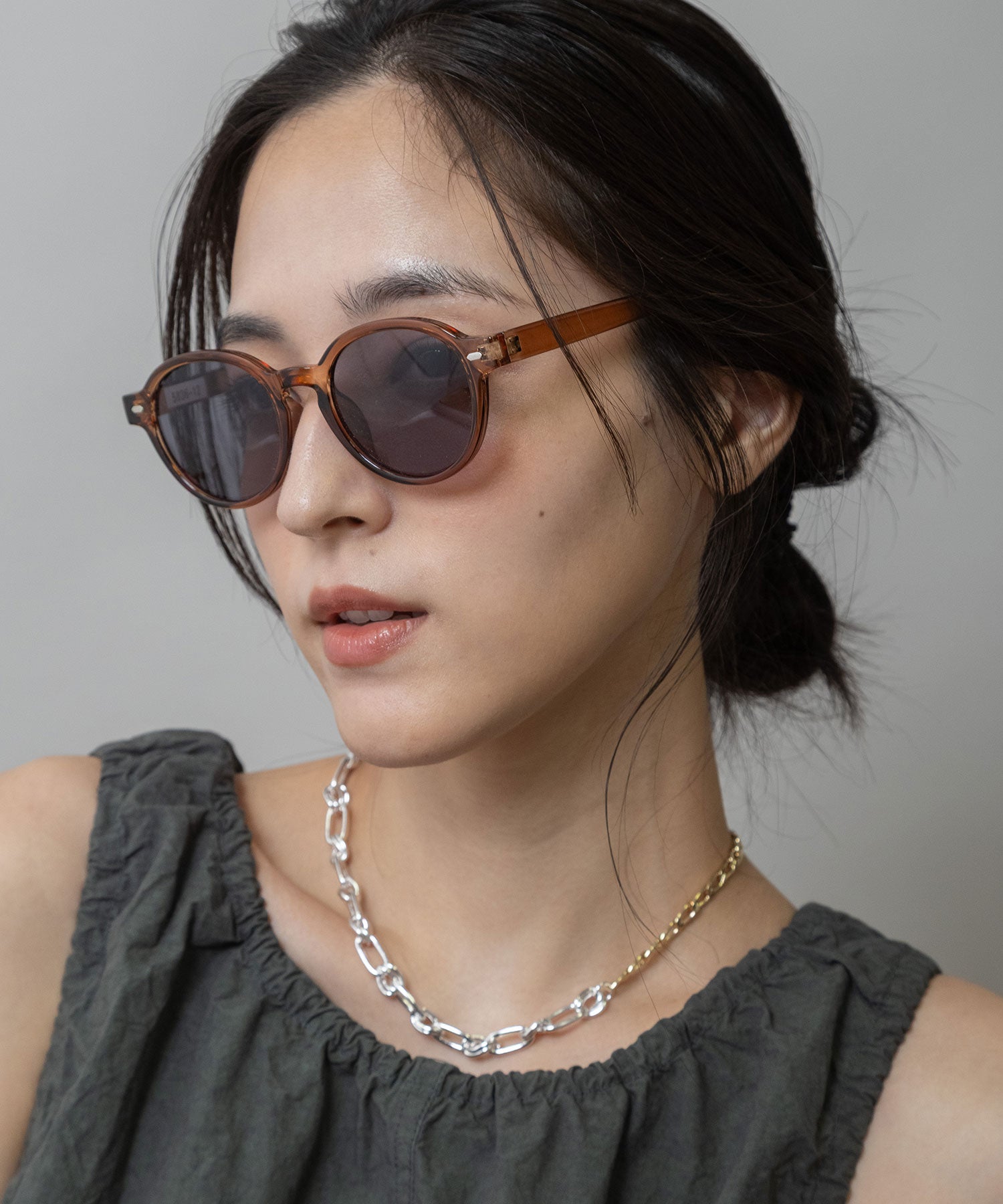 ■ブラウン:赤みを帯びたブラウンフレームに、ダークグレーのレンズを合わせたクラシカル×モダンなカラー