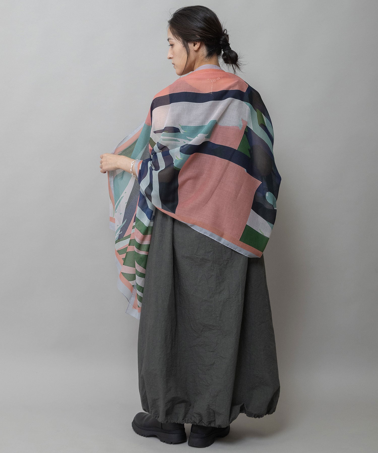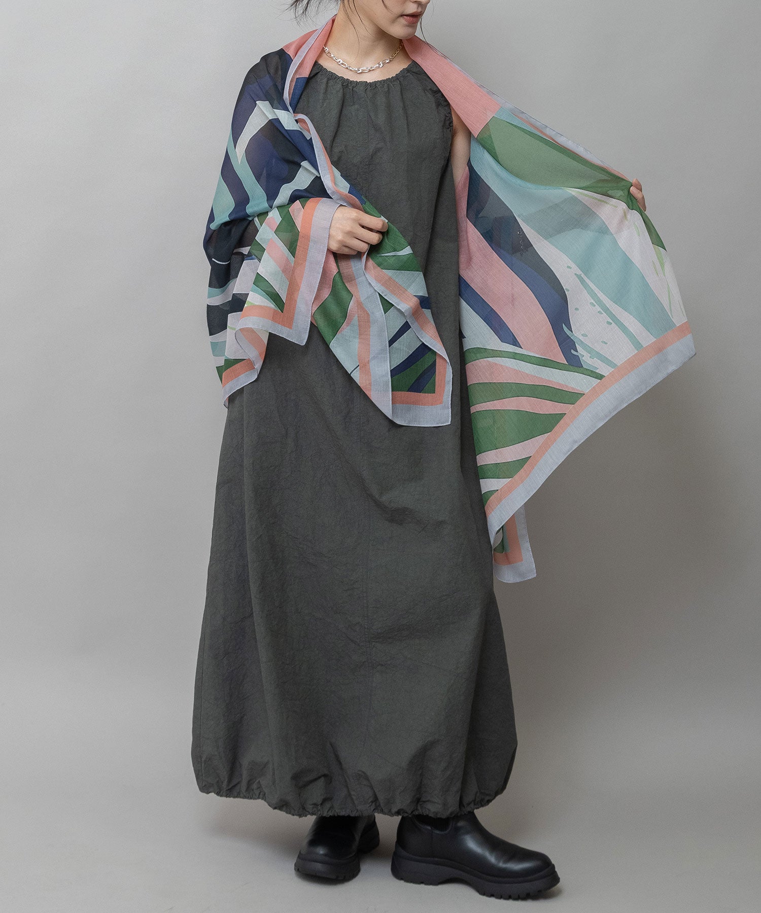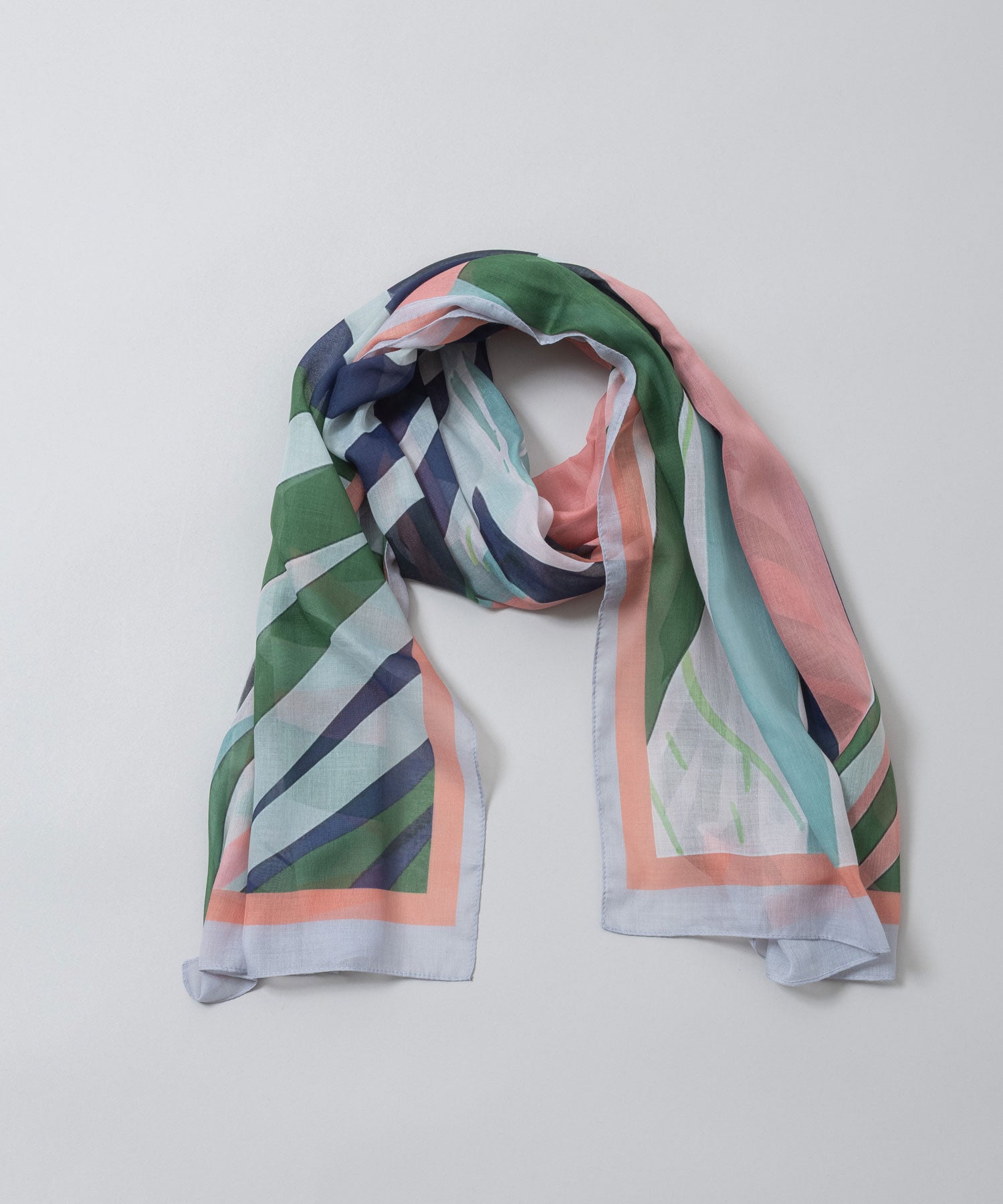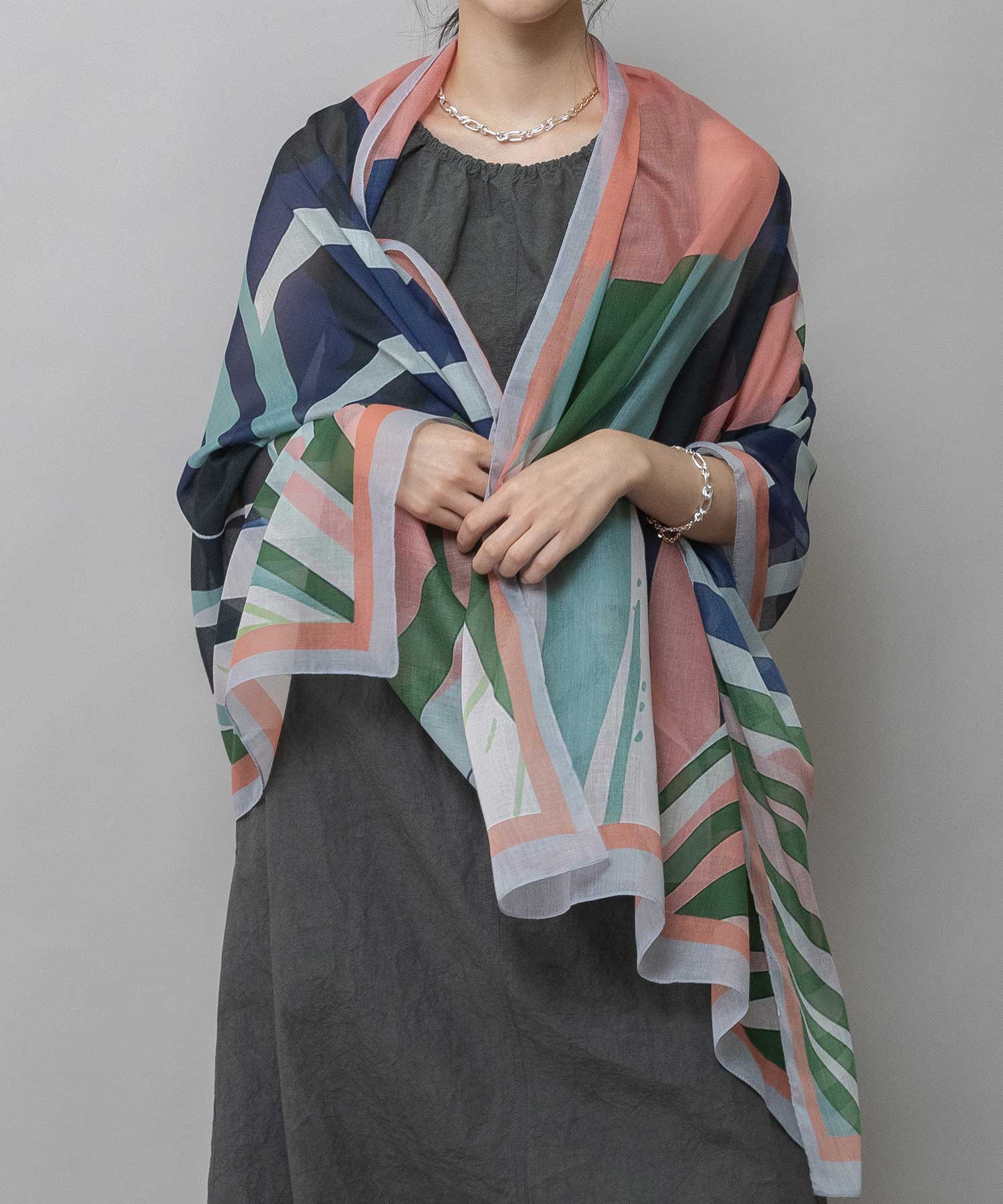 植物の葉を思わせる抽象的なボタニカル調プリントのストール。