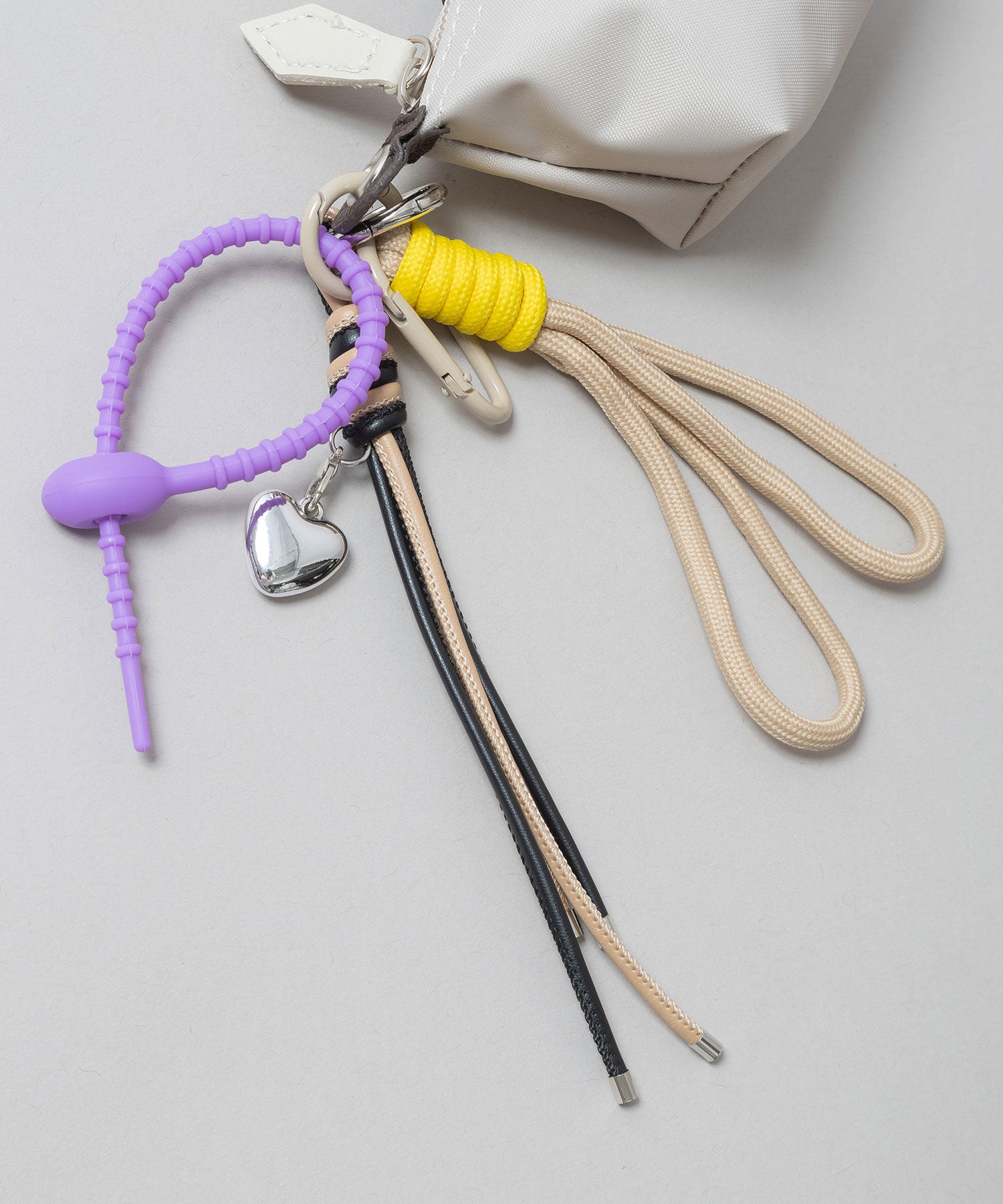 ■ベージュ:柔らかなベージュに、ベージュ×イエローコード・パープルのチャームが馴染むナチュラルながらポップさも兼ね備えたカラー