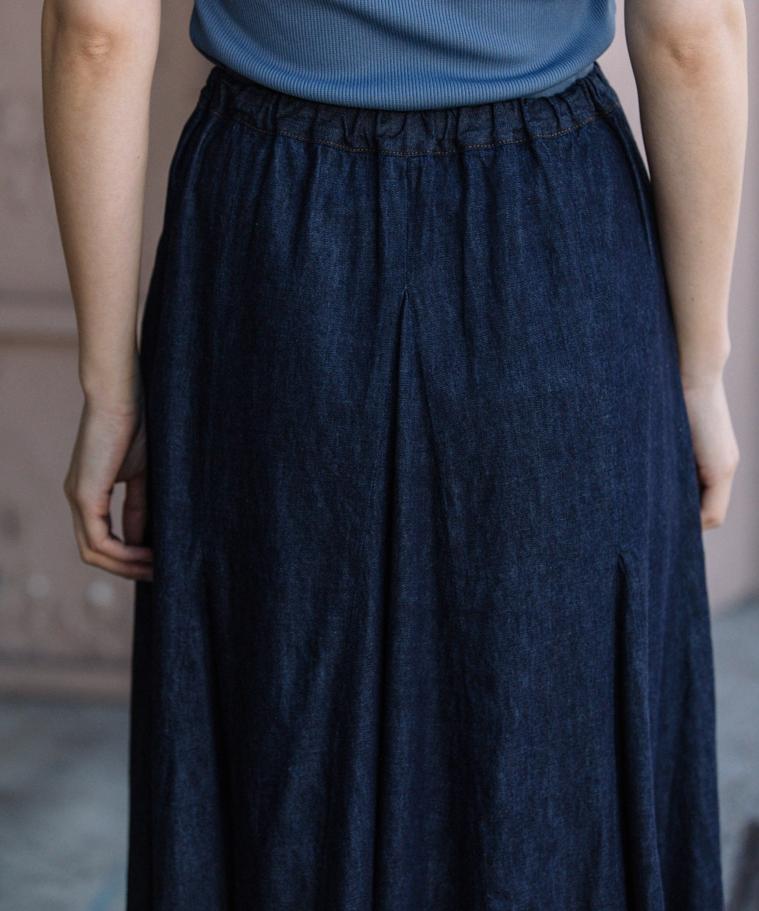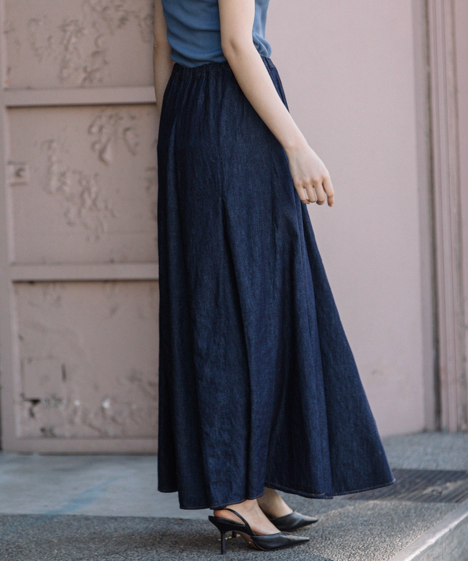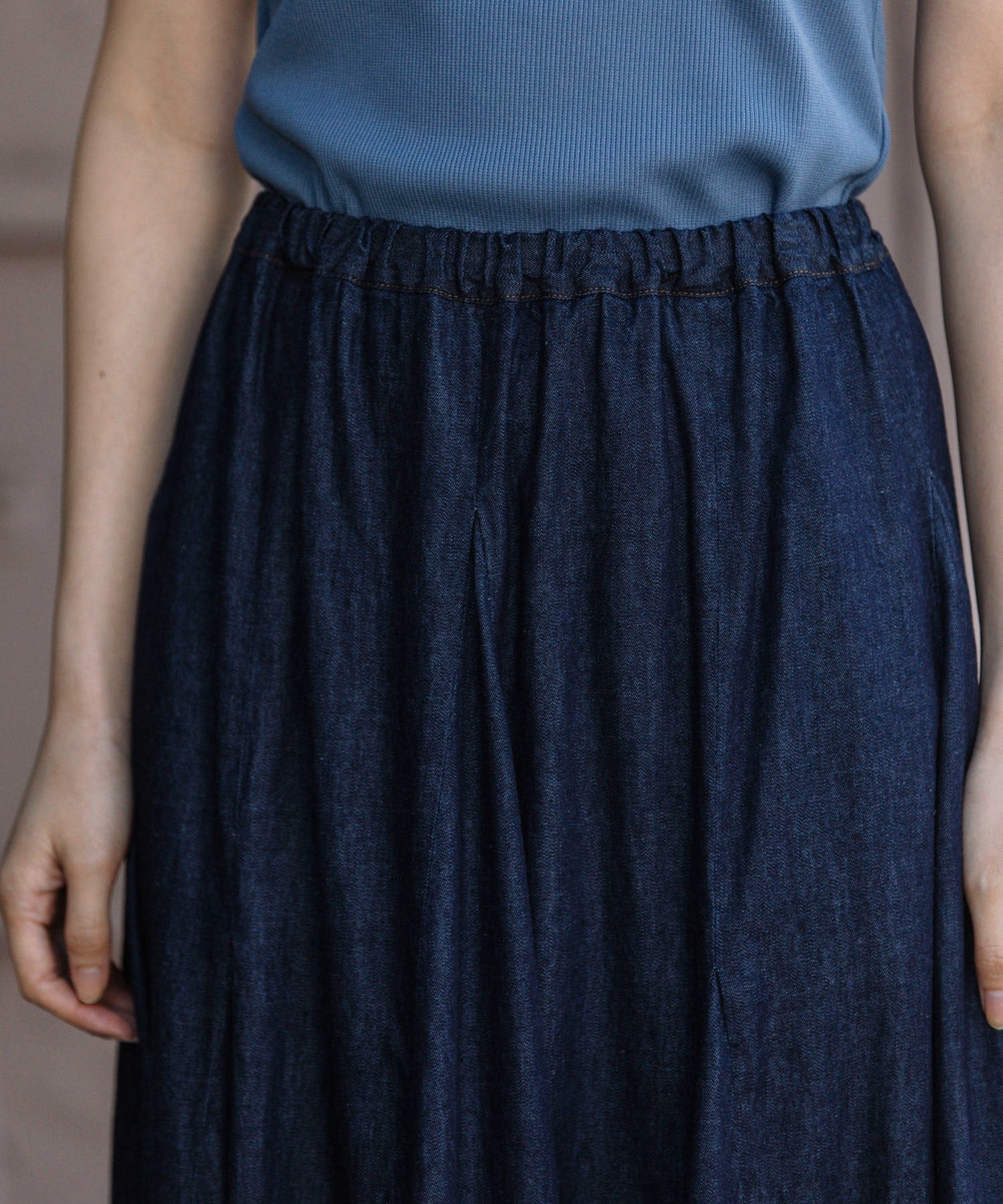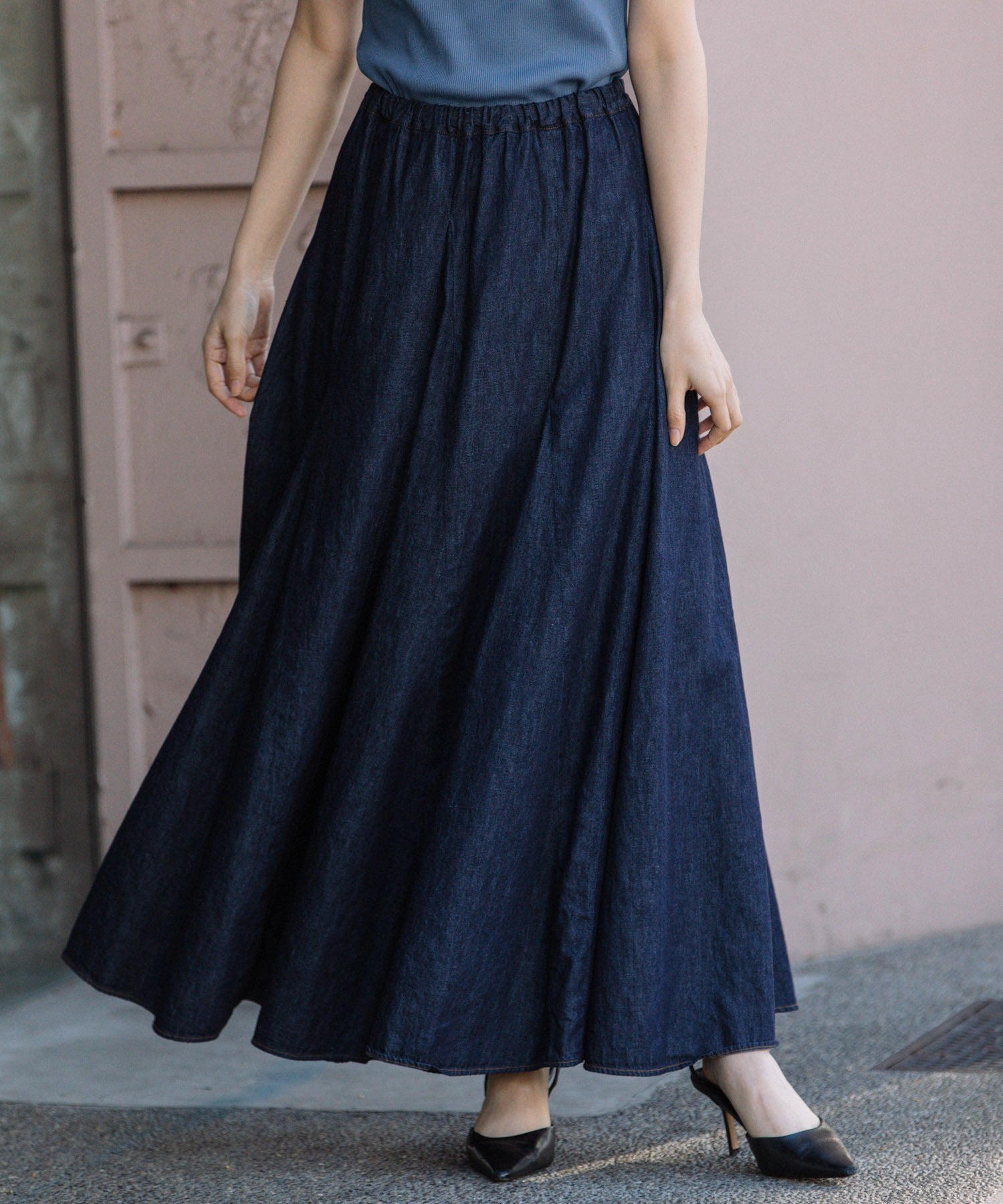 ◆軽さとドレープ性を併せ持った8枚接ぎのシーズレスで使えるライトオンスデニムスカート◆
