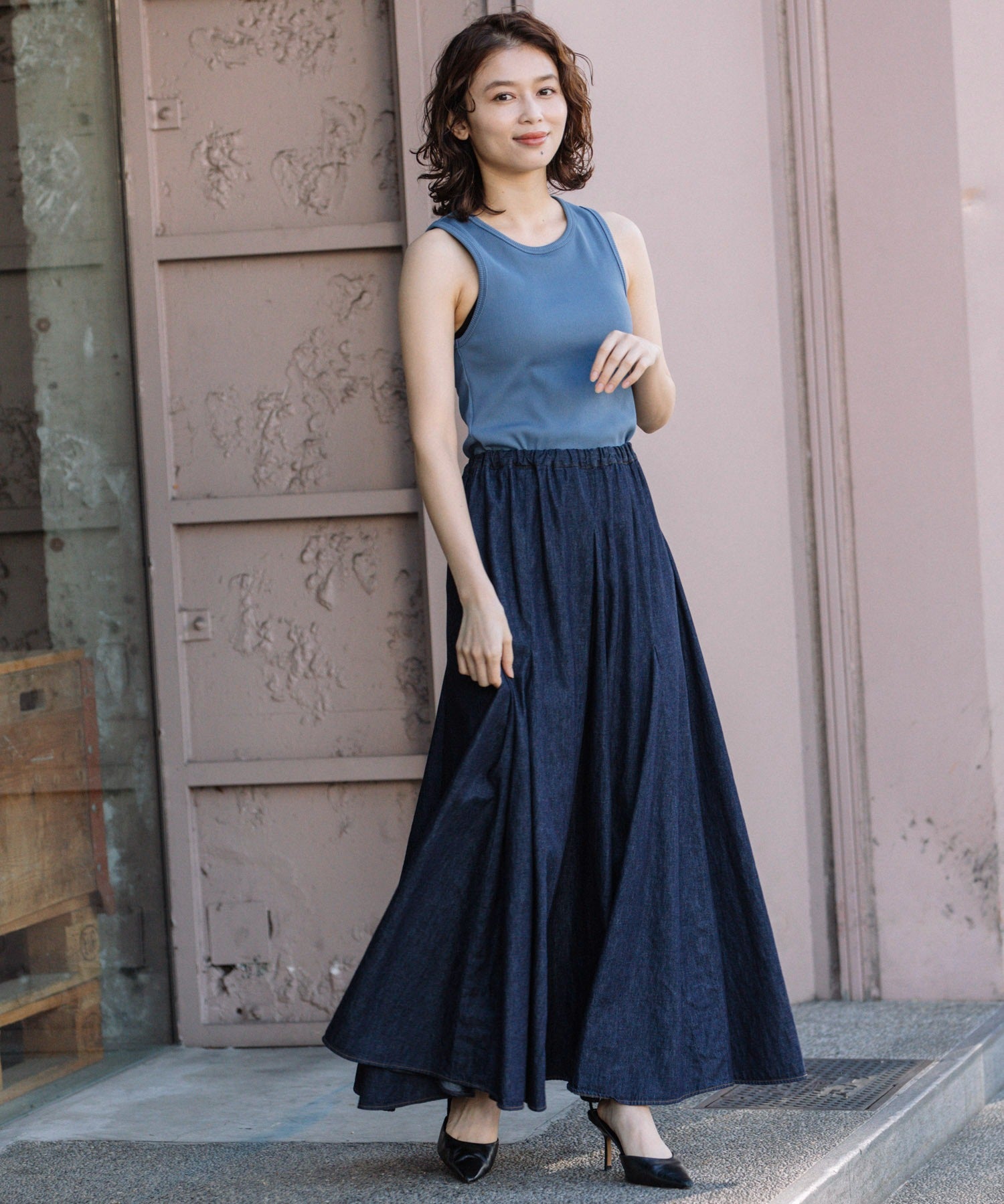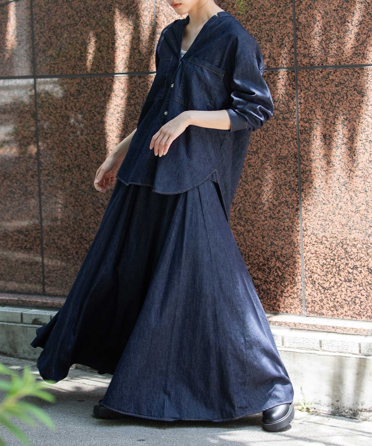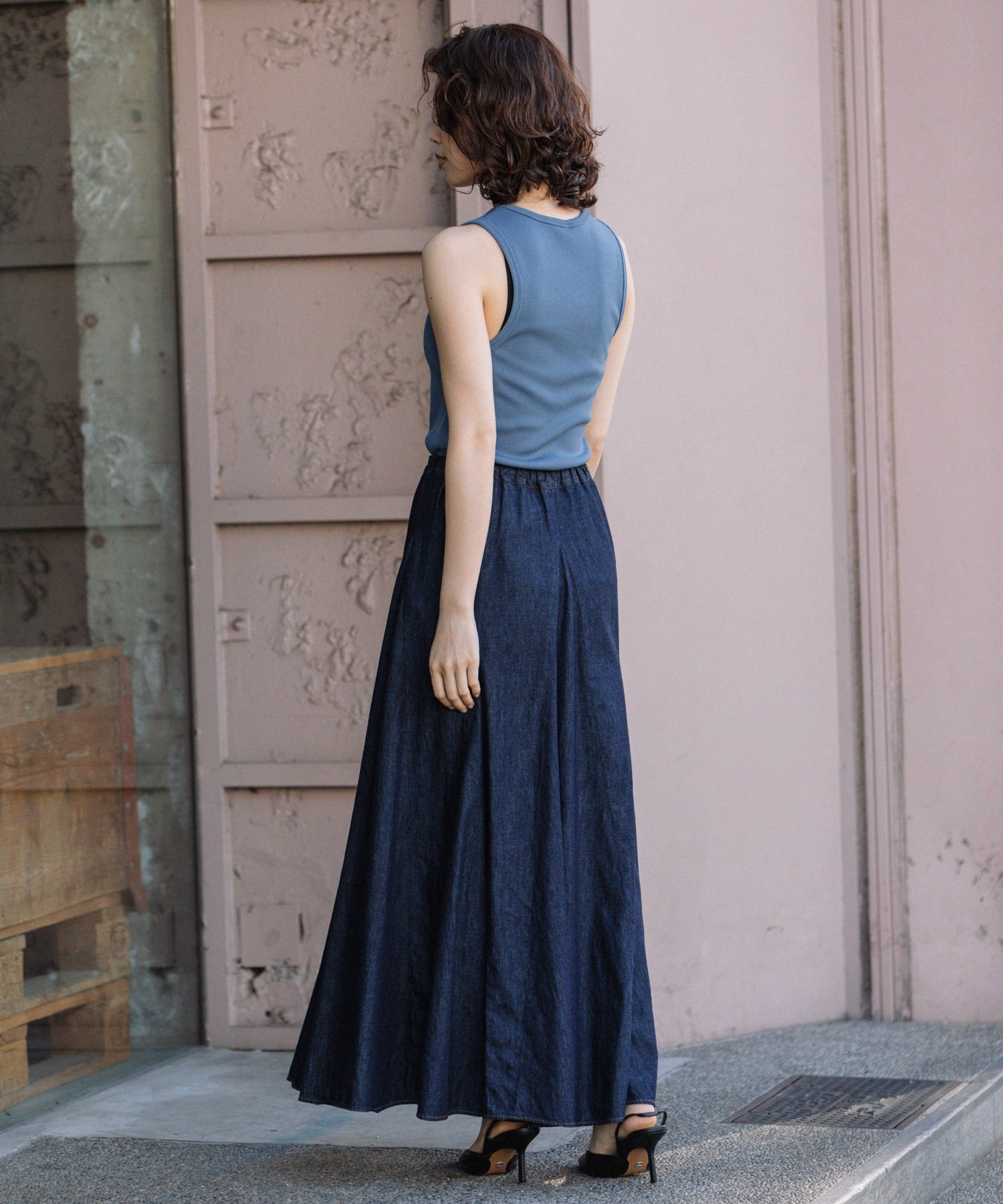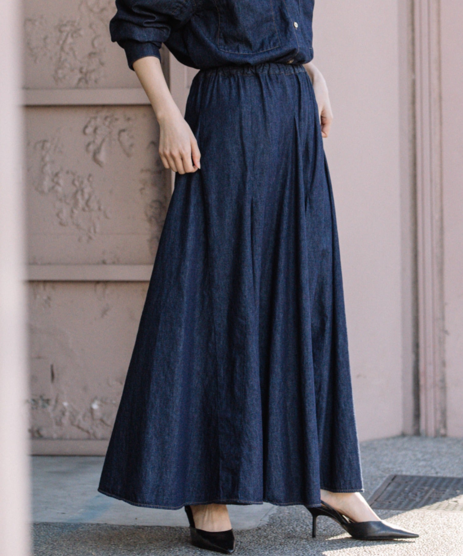 ◆軽さとドレープ性を併せ持った8枚接ぎのシーズレスで使えるライトオンスデニムスカート◆