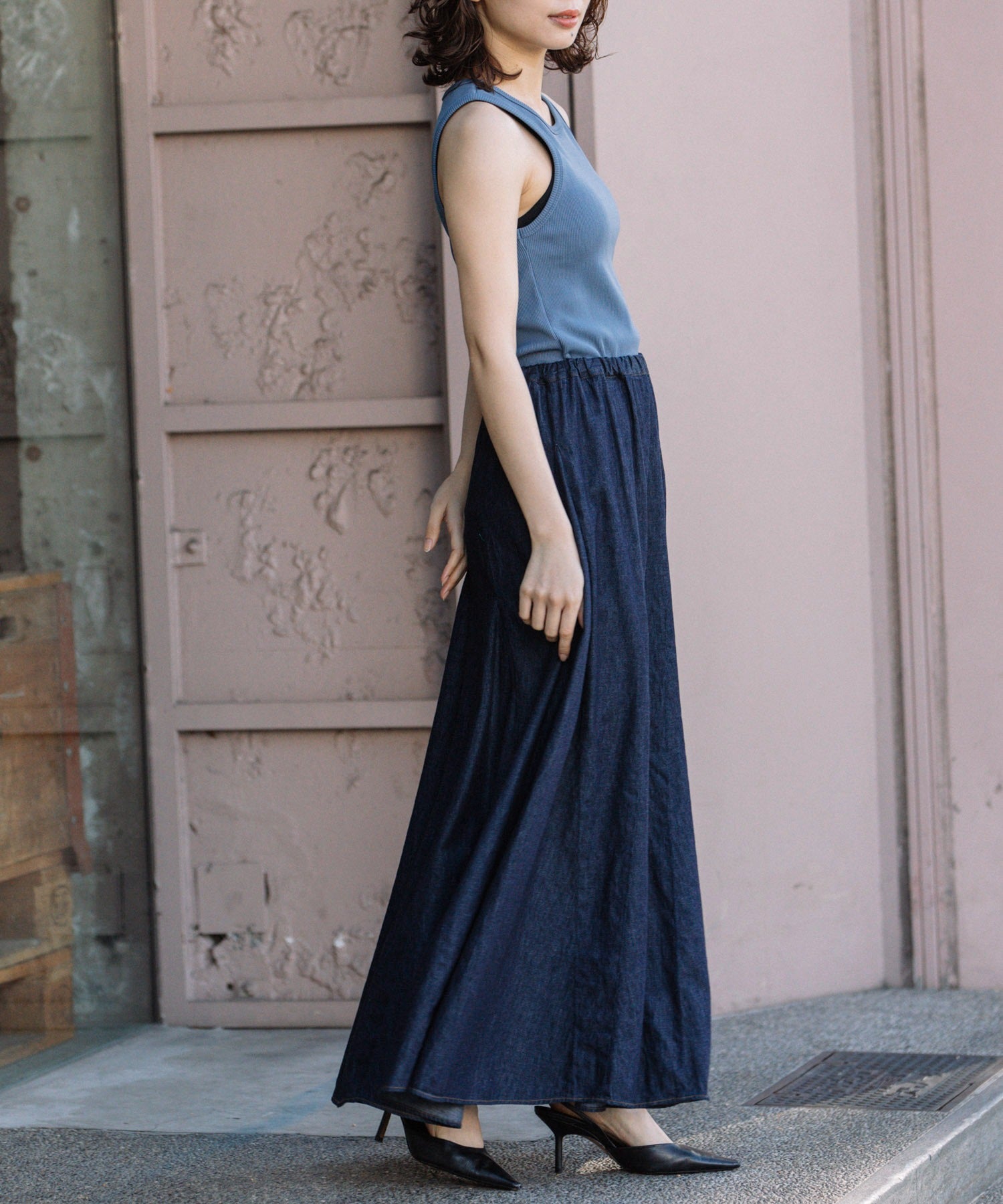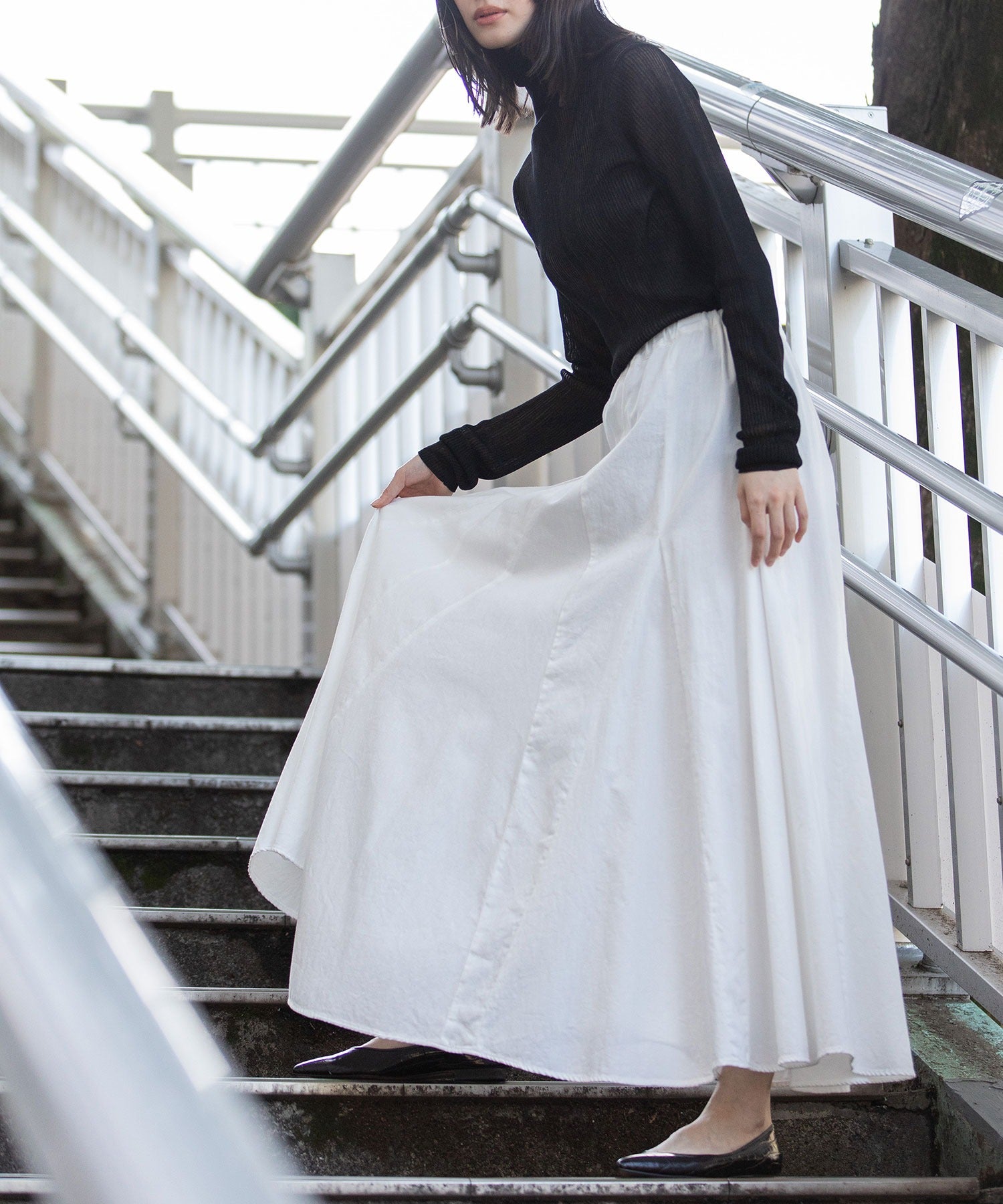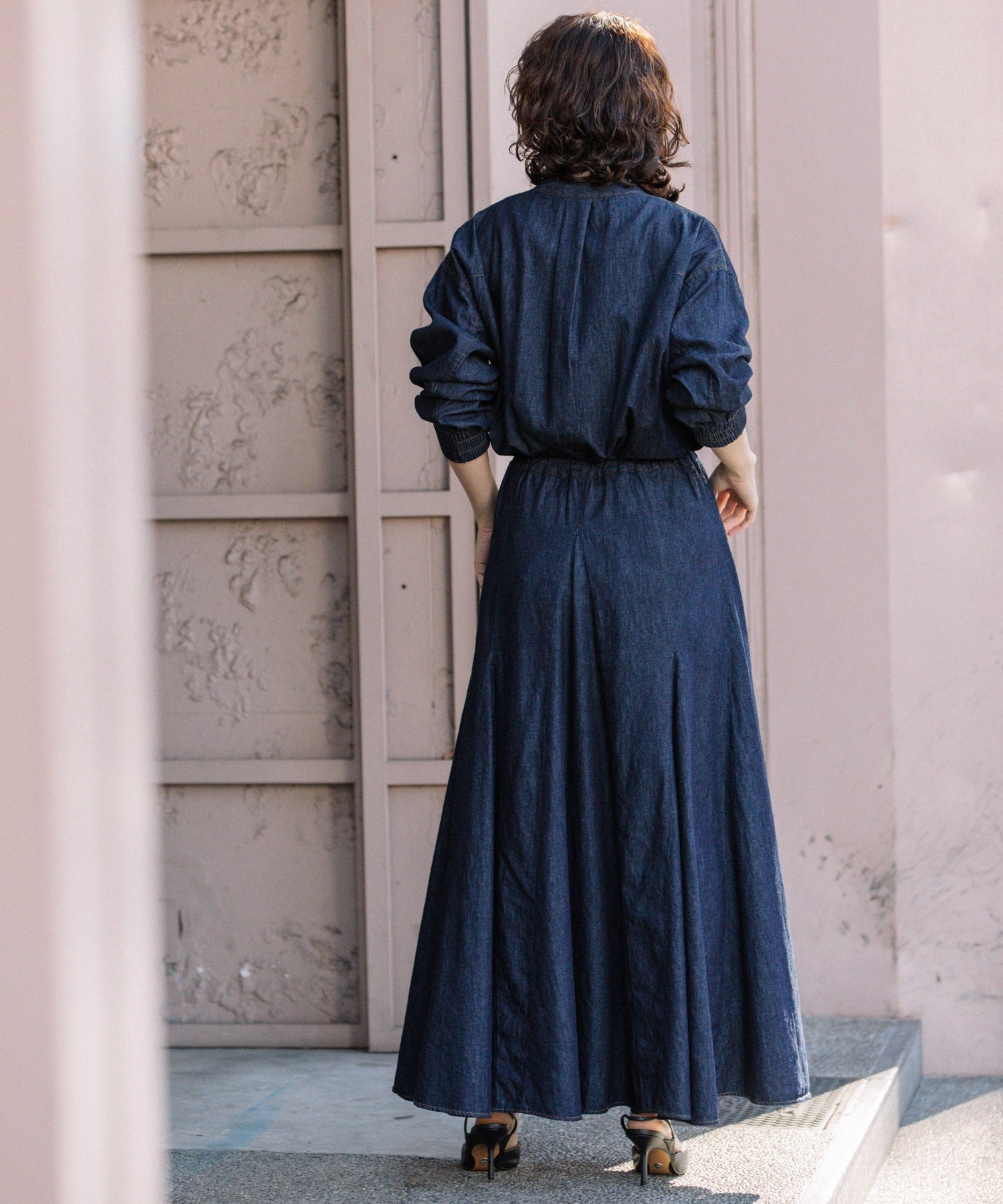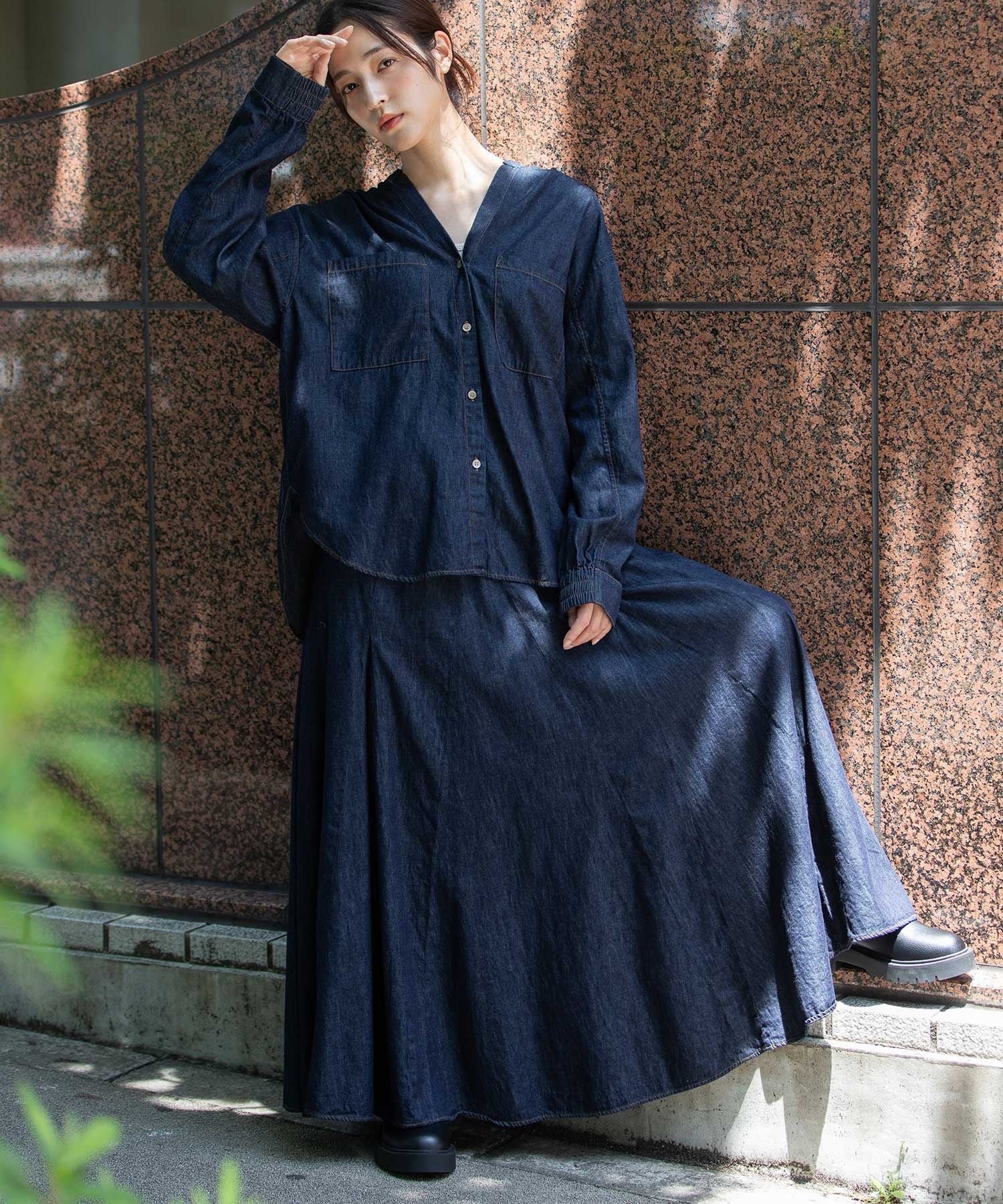 ◆軽さとドレープ性を併せ持った8枚接ぎのシーズレスで使えるライトオンスデニムスカート◆