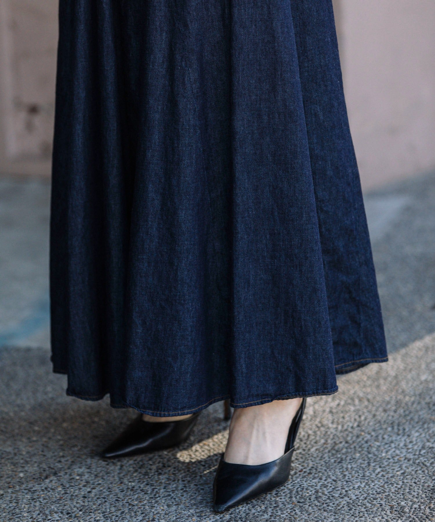 【定番】 ウォッシュ5.5オンススラブデニムマキシフレアスカート
