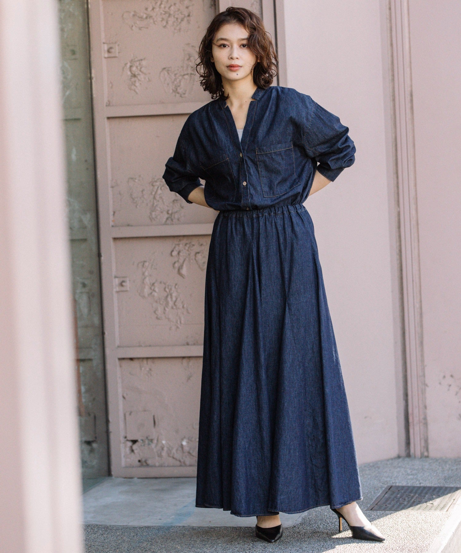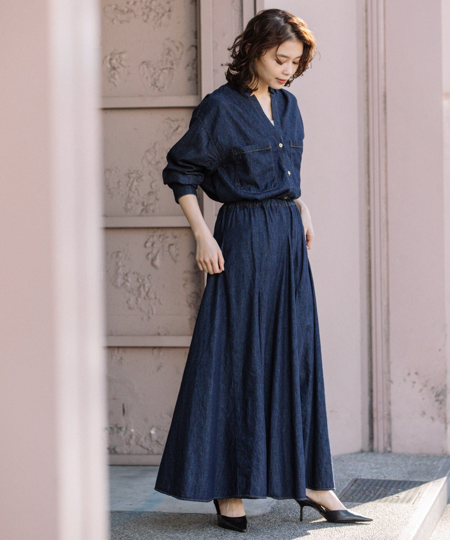 軽くきれい目なデニム素材なので、きちんと分量が分散された、すっきりと美しいドレープシルエットが特徴です。