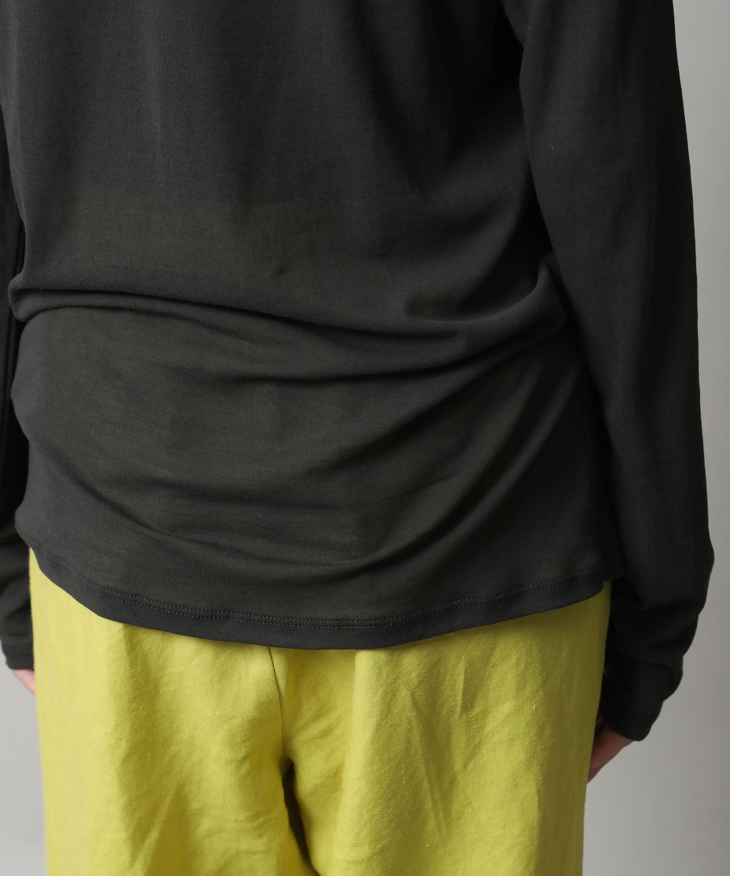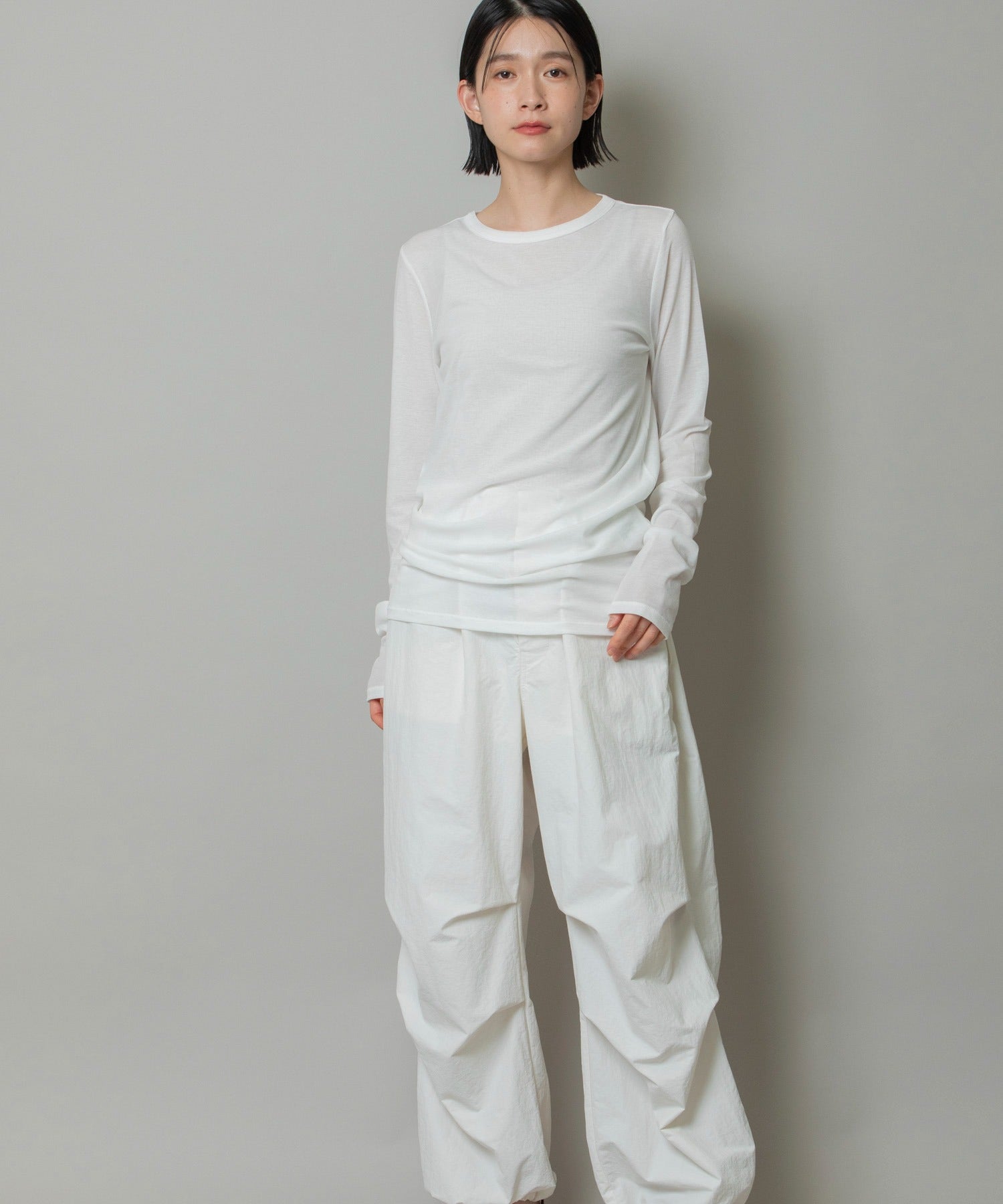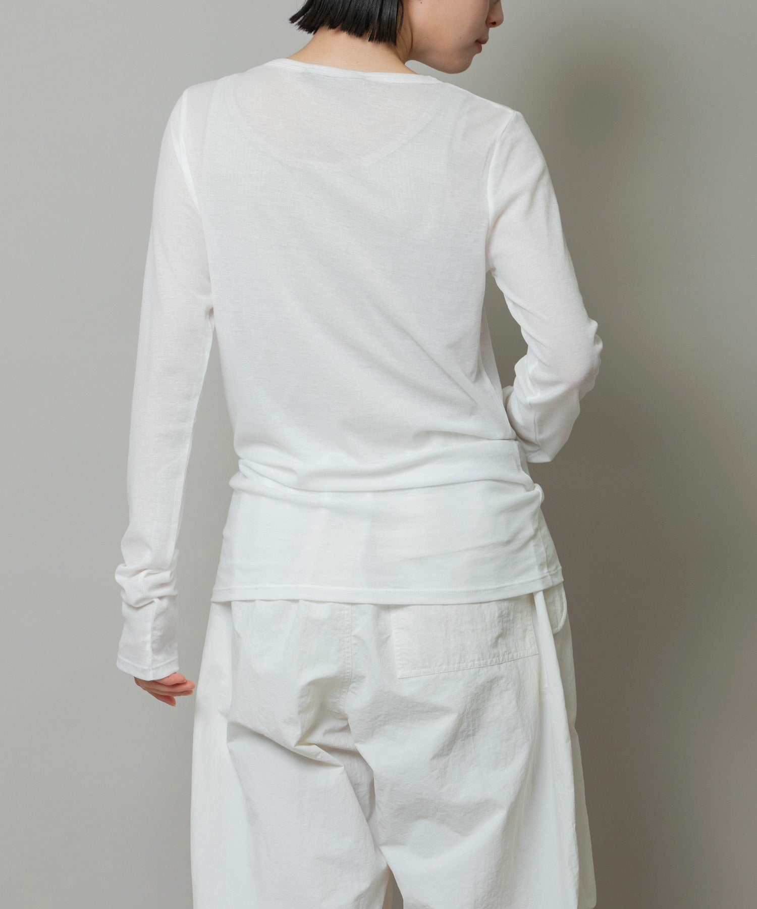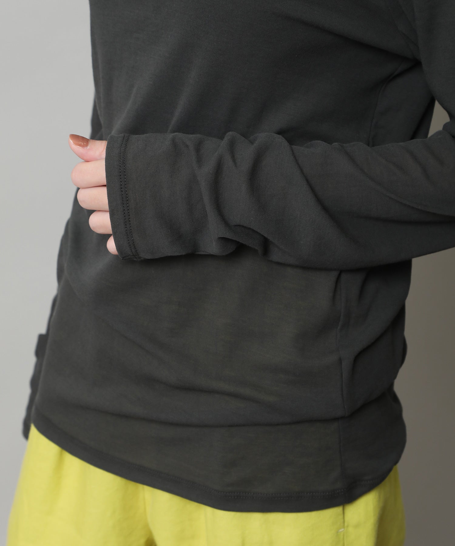 袖口がクシュっとゆるみ、チラリと見せるスタイリングにおススメで、インナー要素がメインにはなりますが、小さすぎず、大き過ぎずないサイズ感に拘っているので、1枚で着て、インナーを透けさせるコーディネートにも使えるサイジングに仕上げています。