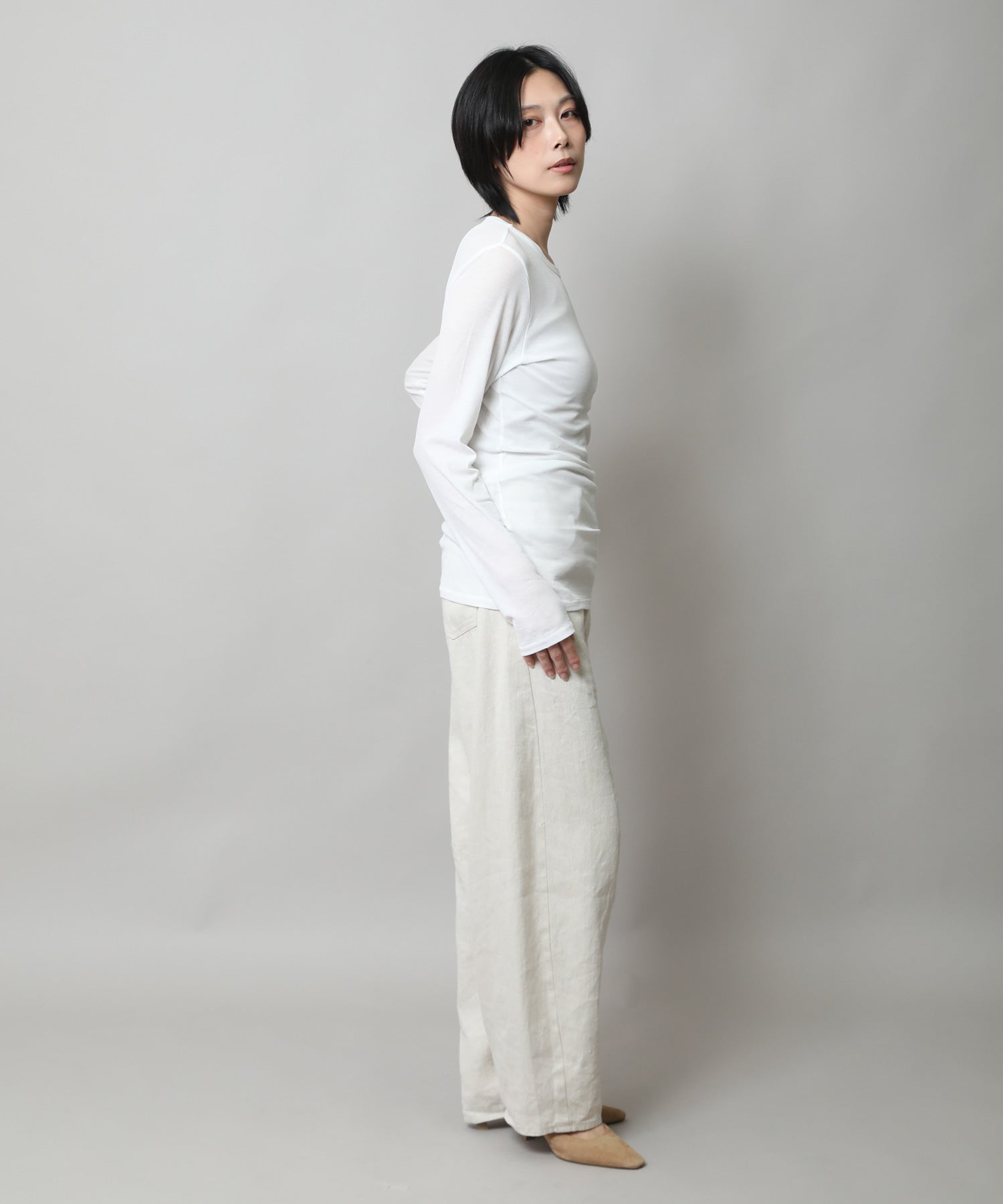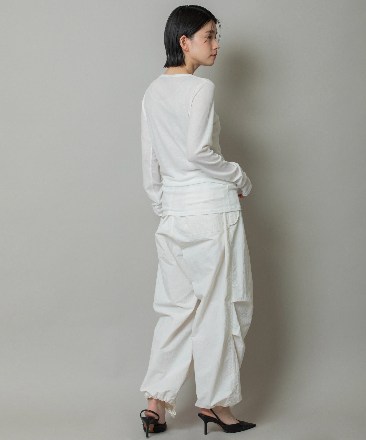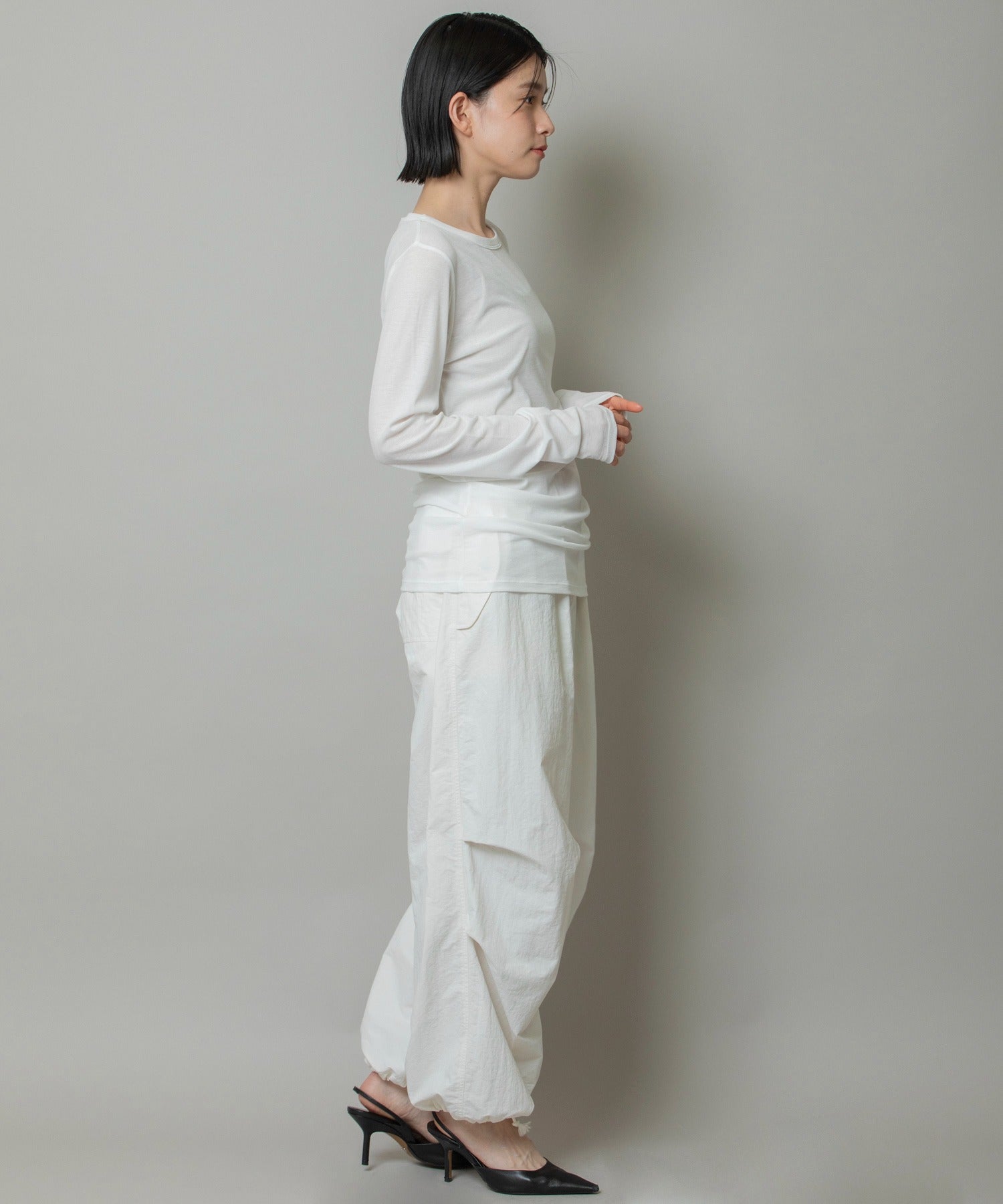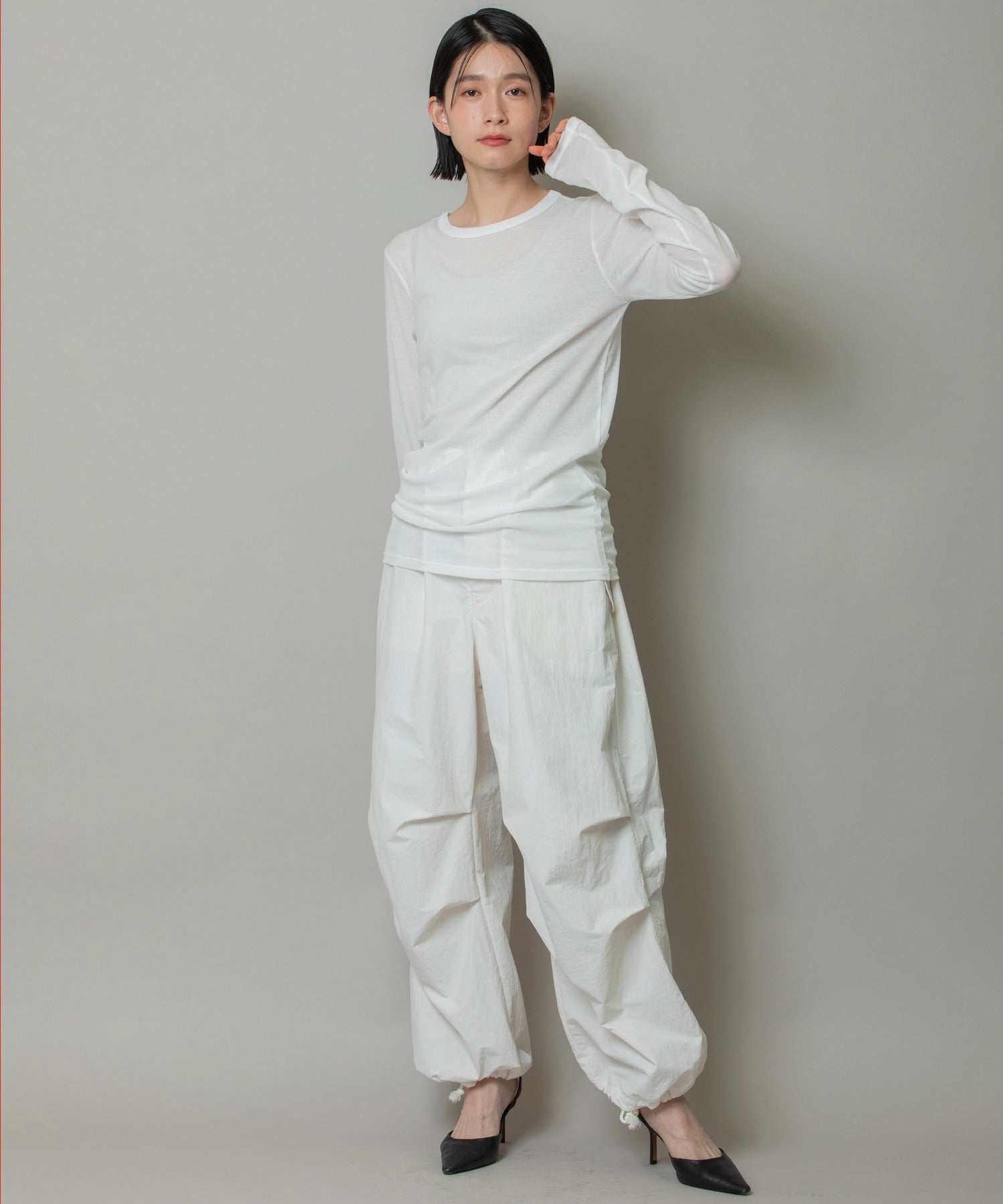 袖口がクシュっとゆるみ、チラリと見せるスタイリングにおススメで、インナー要素がメインにはなりますが、小さすぎず、大き過ぎずないサイズ感に拘っているので、1枚で着て、インナーを透けさせるコーディネートにも使えるサイジングに仕上げています。