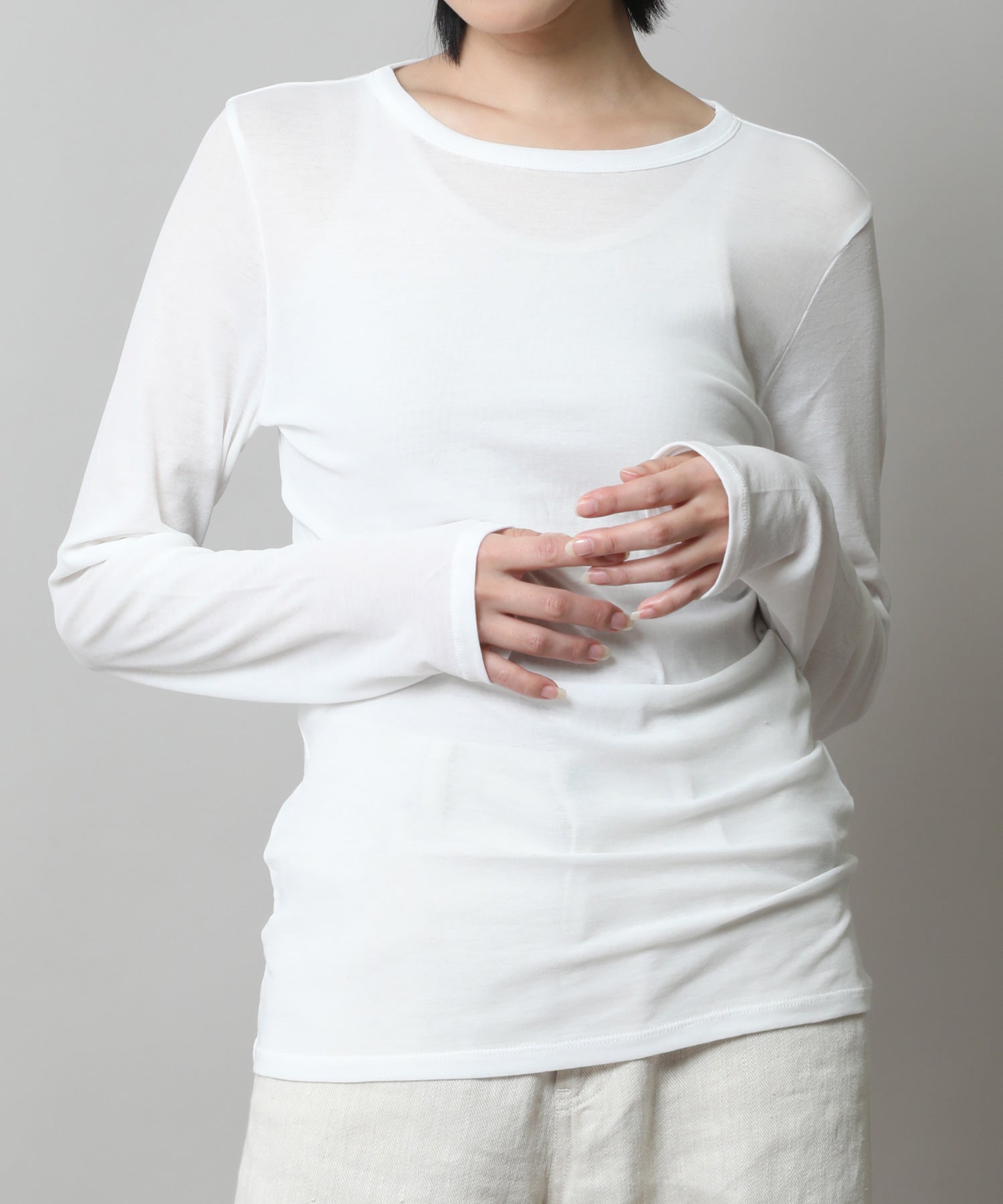 薄手で透け感があり、ストレッチ性抜群のコットンのフライスを使用していて、肌に直接触れてもストレスなく、着心地良く着られます。