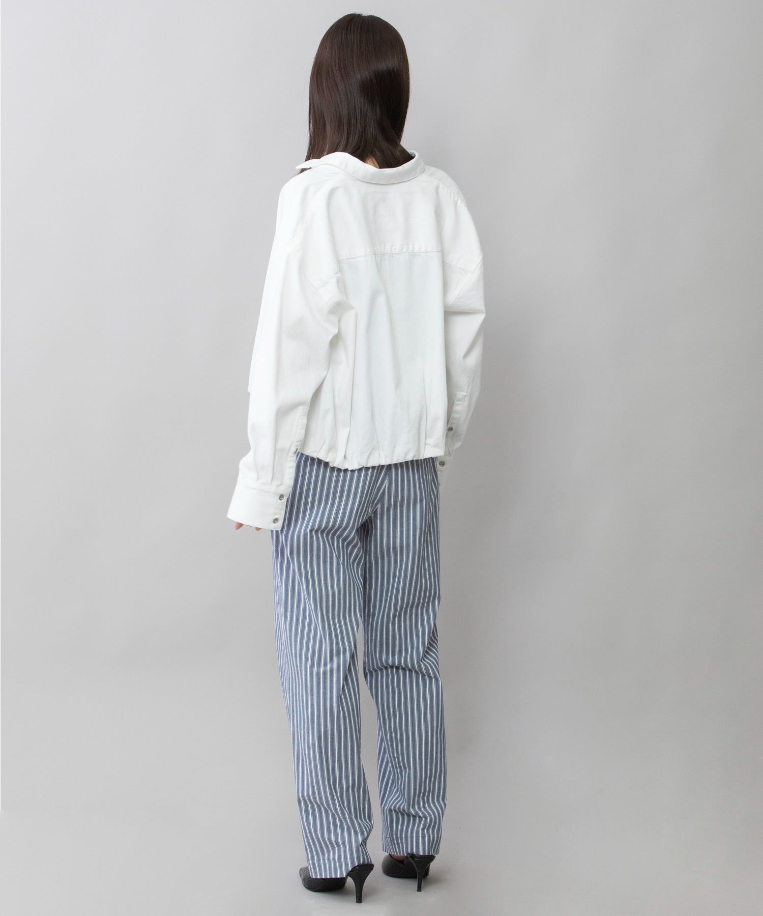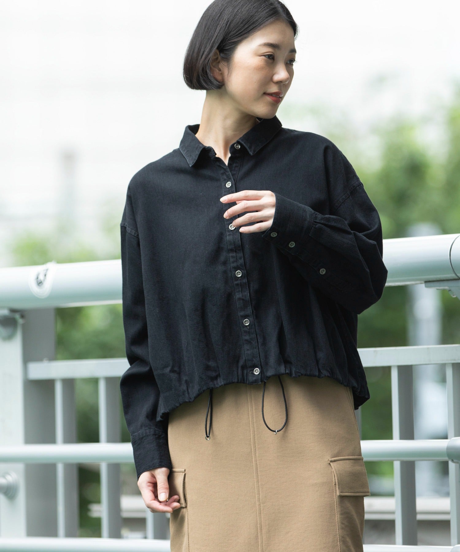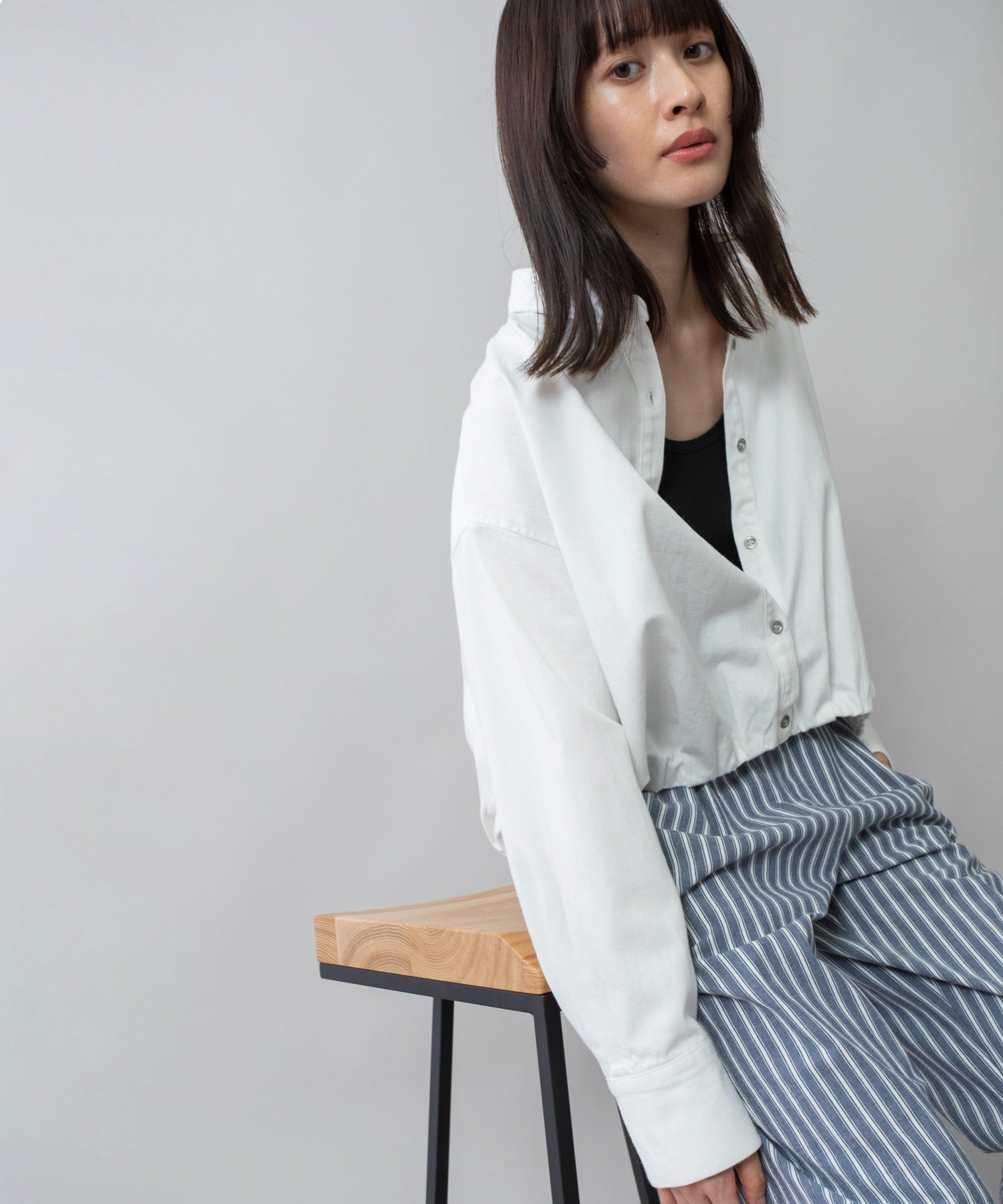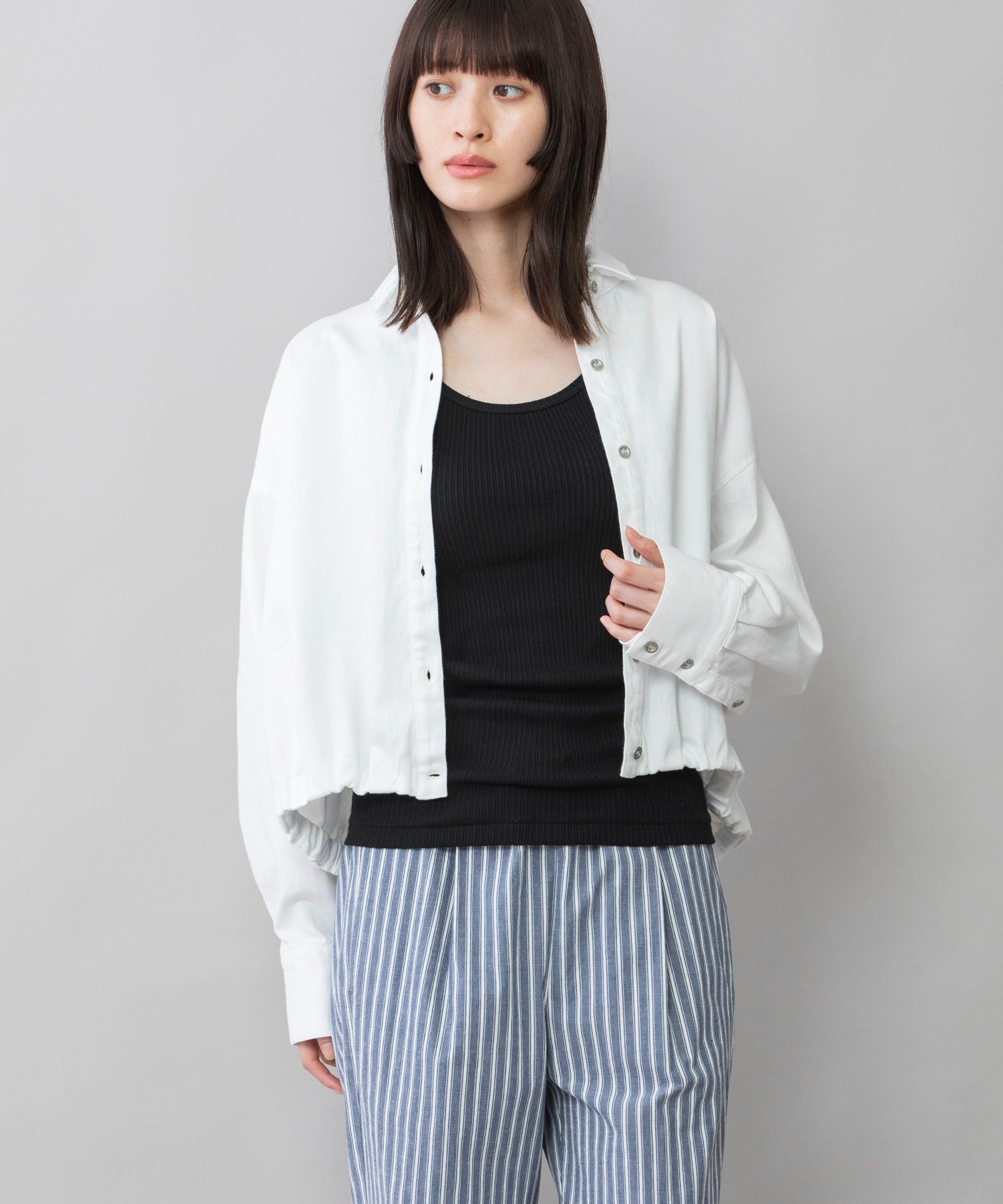 裾をブラウジングさせたショートブルゾンのようなシルエットのシャツです。