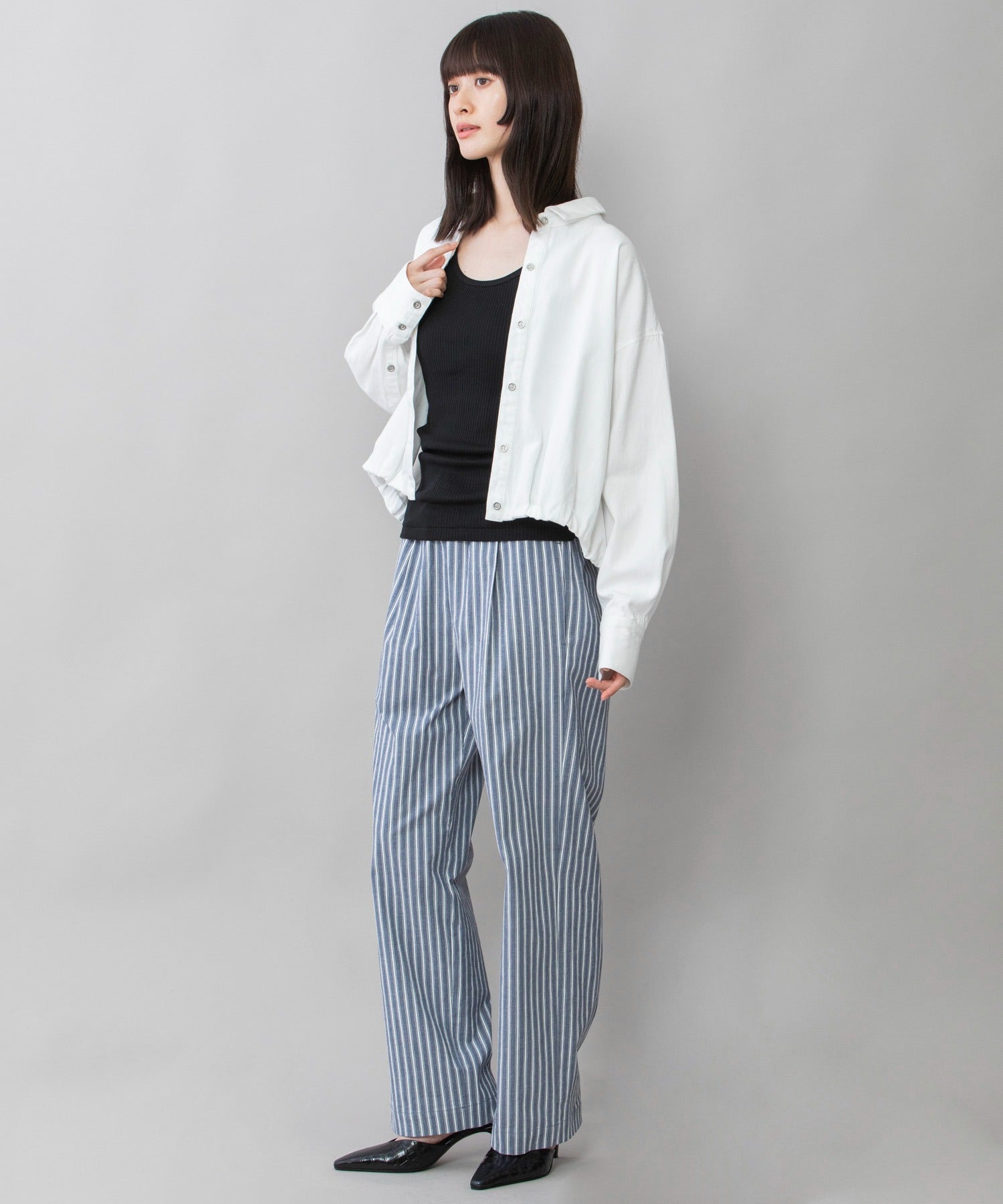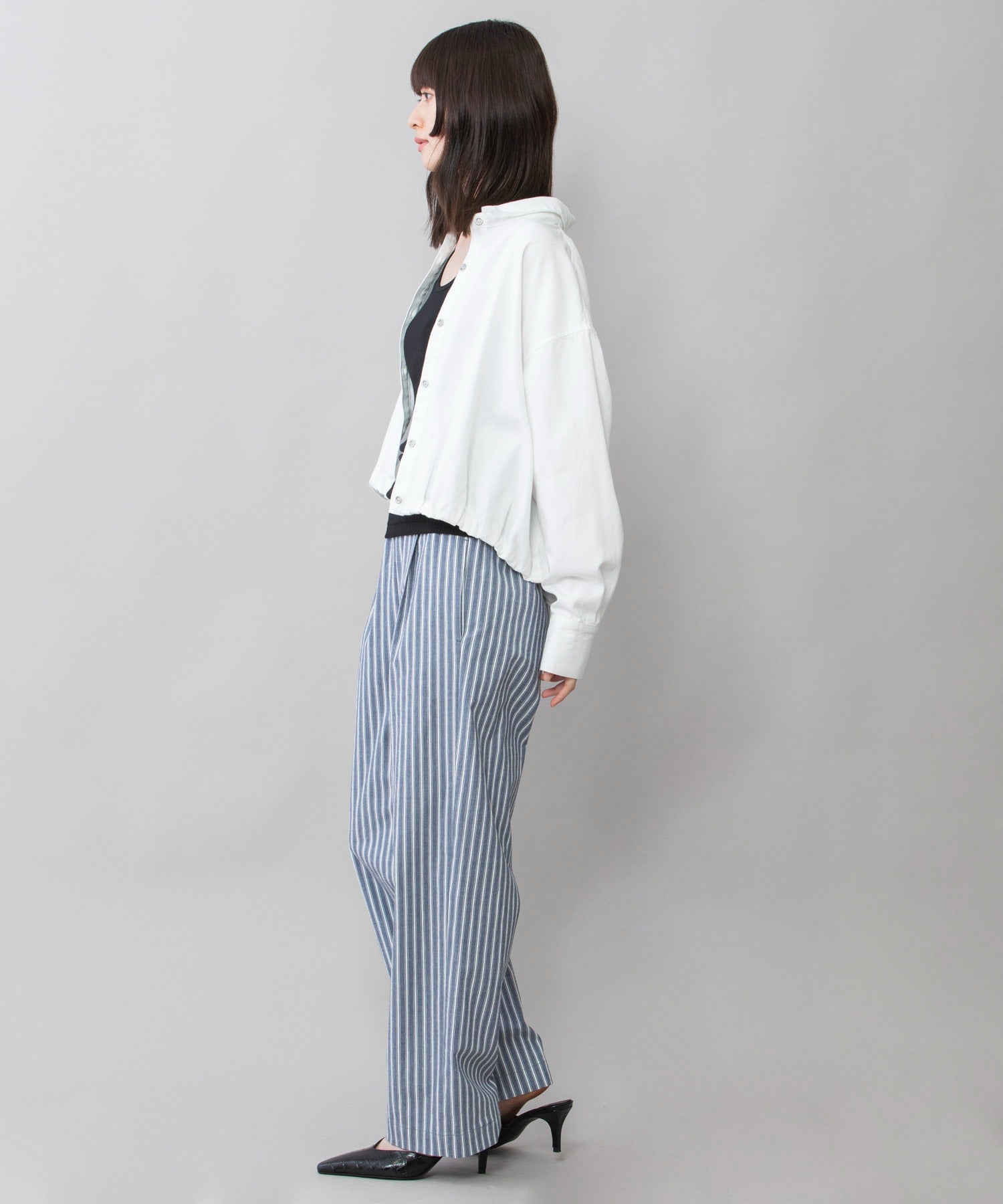 内側に織り込まれたゴムギャザーとタックによる裾はふんわりとしたシルエットを作り、ブラウジングしたショート丈のブルゾンのような印象に仕上げています。