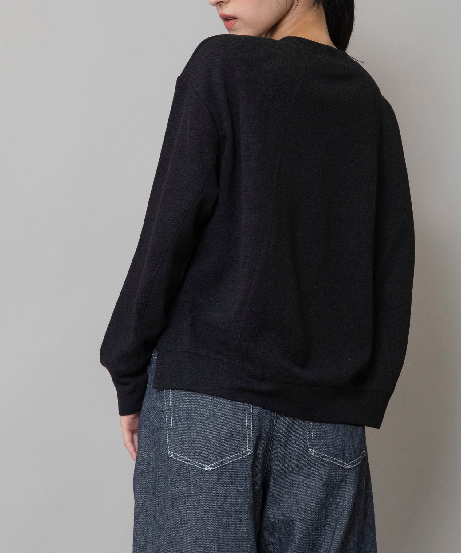 表面はブークレーのような表情を持ちつつ、裏面はフラットな肌触りで優しい着心地になっていて、肉感も程良くあるので幅広いアイテムにこなせます。