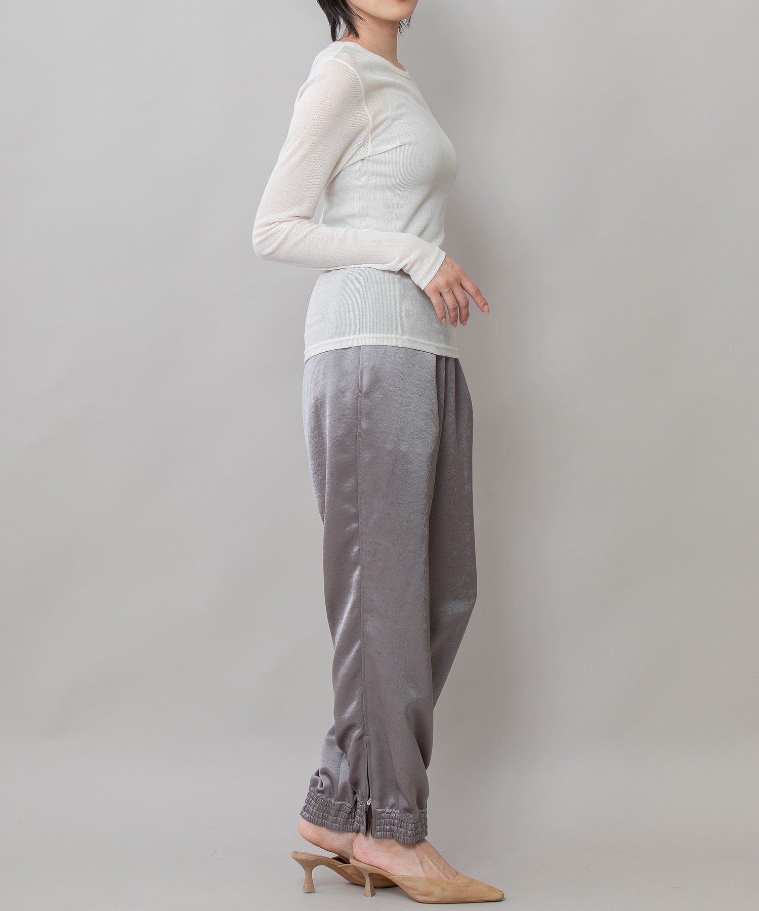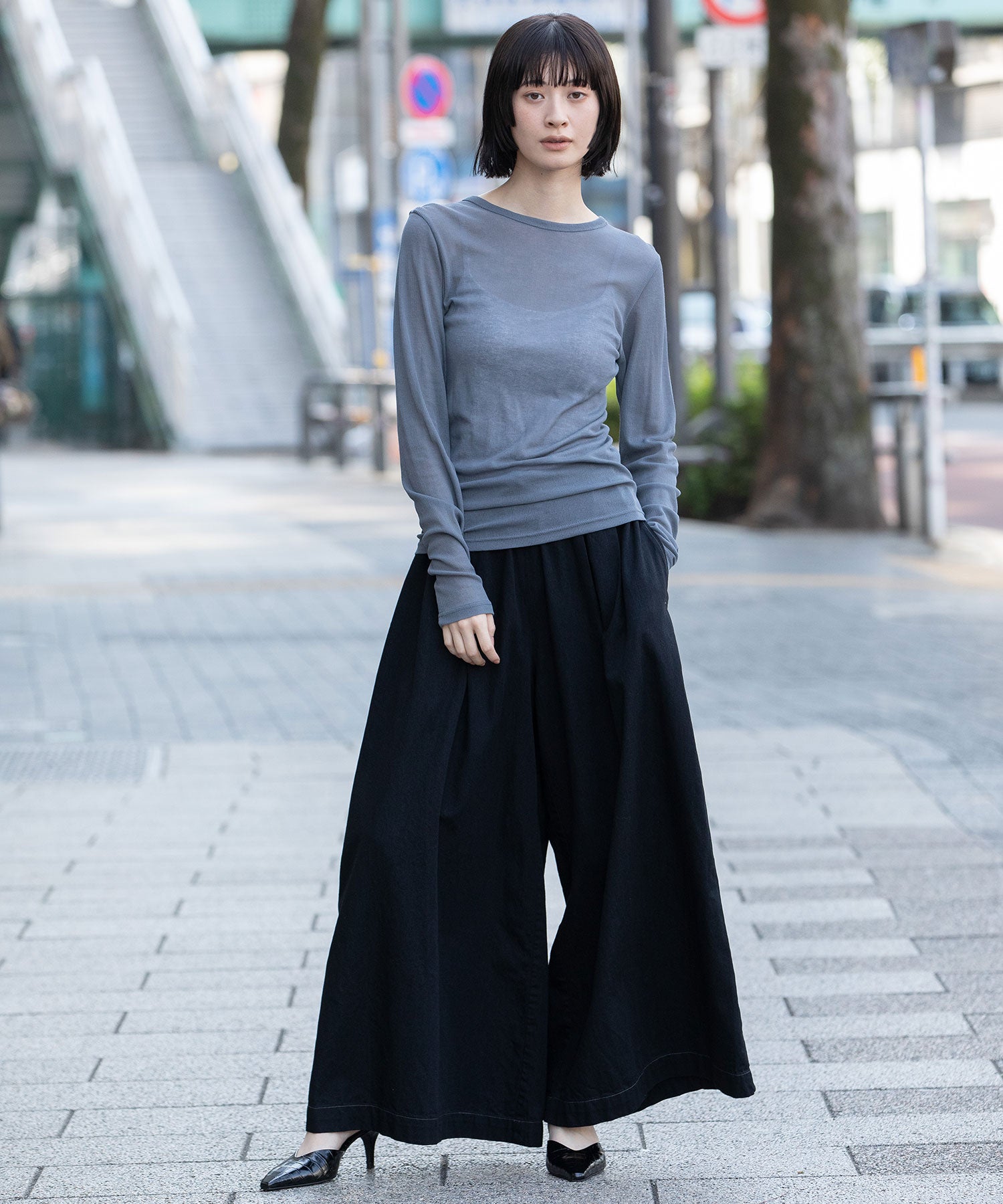 袖口がクシュっとゆるみ、チラリと見せるスタイリングにおススメで、インナー要素がメインにはなりますが、小さすぎず、大き過ぎずなサイズ感に拘っているので、1枚で着て、インナーを透けさせるコーディネートにも使えるサイジングに仕上げています。