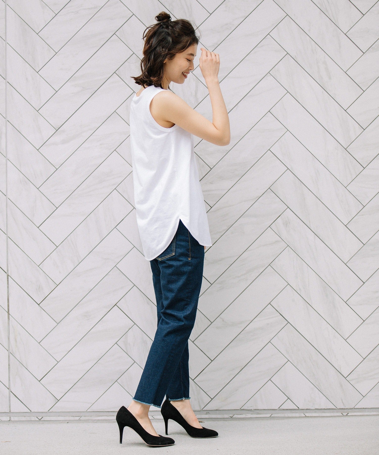 絶妙にカーブさせラウンドした裾はボトムの上から見せることで今っぽいレイヤードスタイルが完成され、ちょっと柔らかい印象になるため、こなれ感がでて良い感じまとまります。