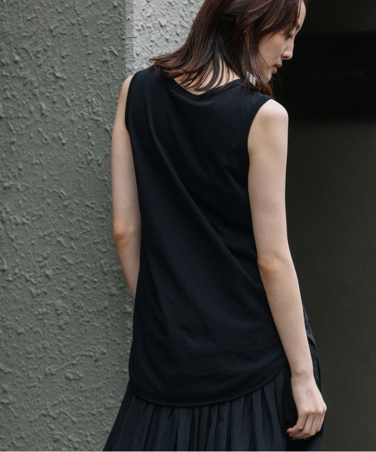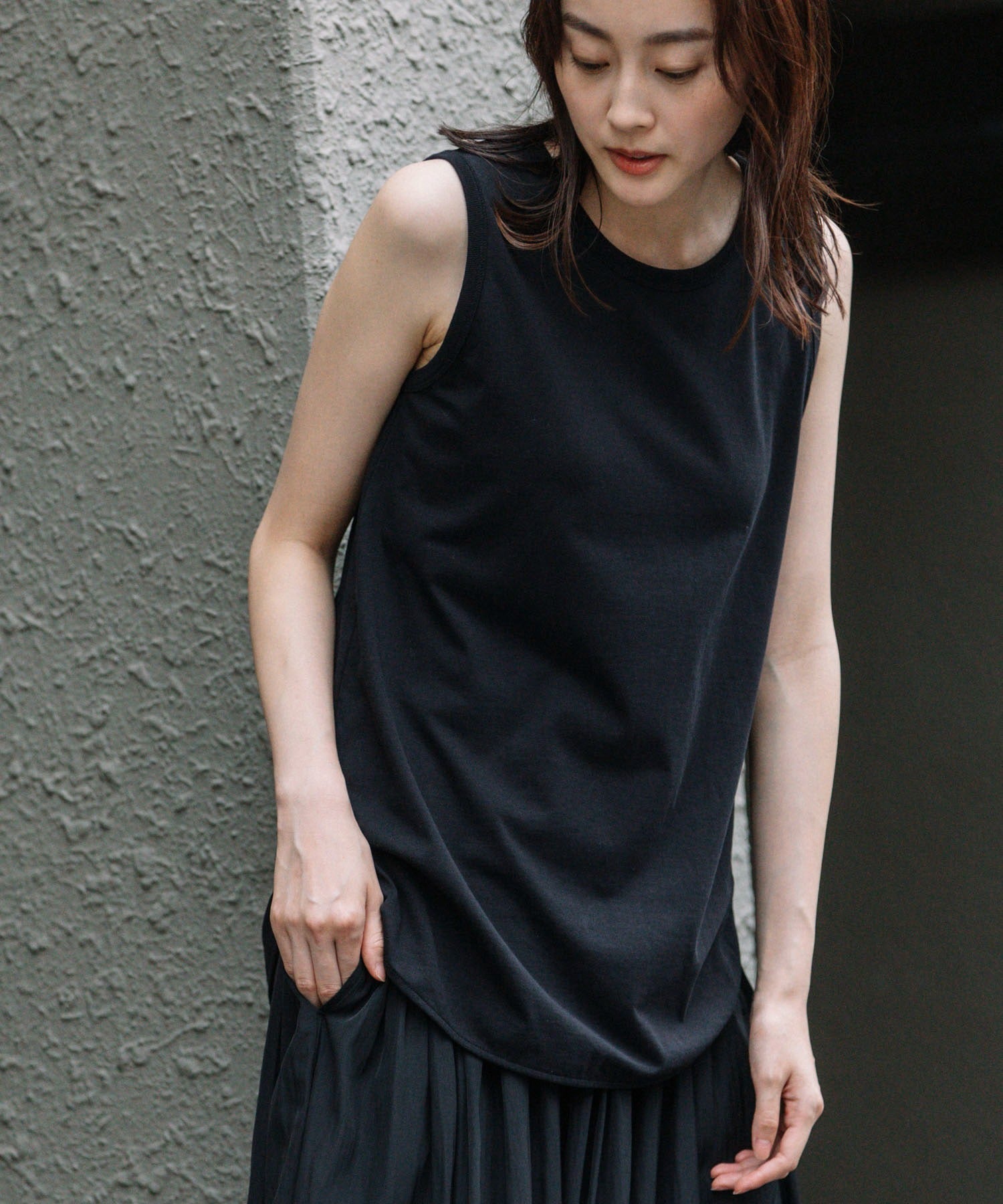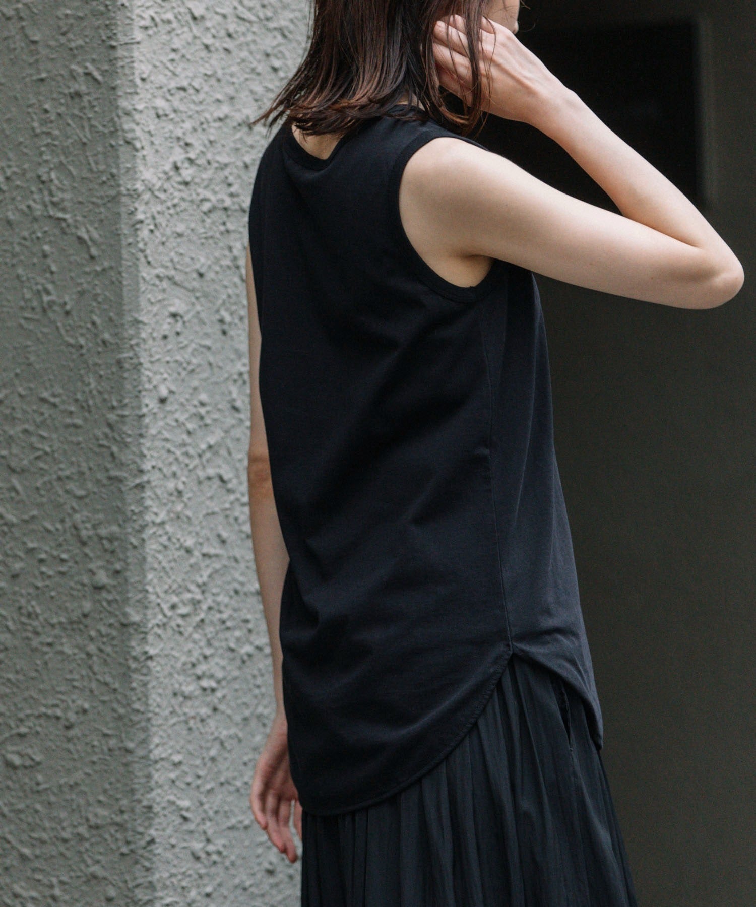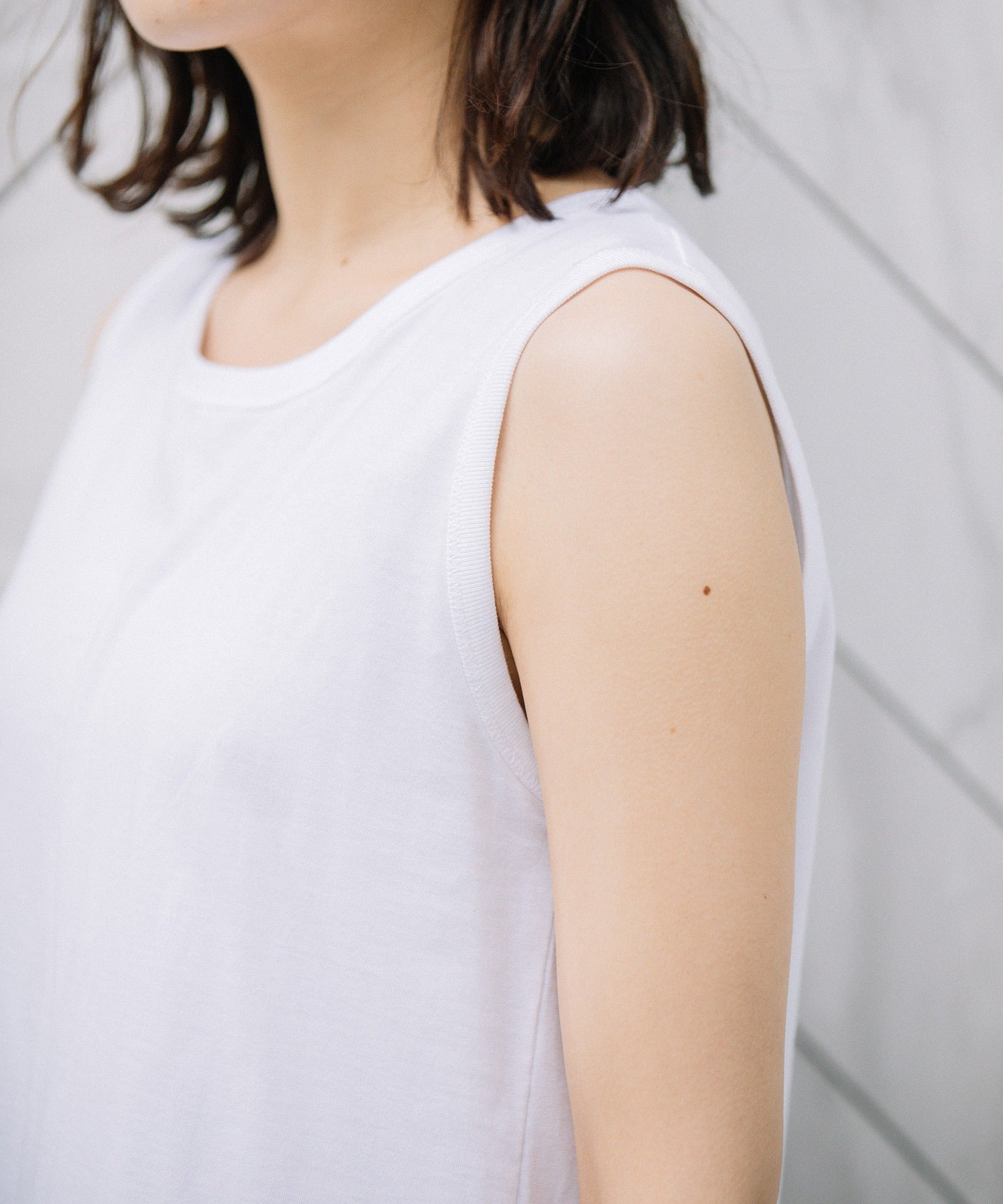 インナーとしてはもちろん、透け感が少ない素材なので1枚でも様になるよう肩幅はやや広めにし、アームホールのラインも身体が細く見えるよう計算されています。