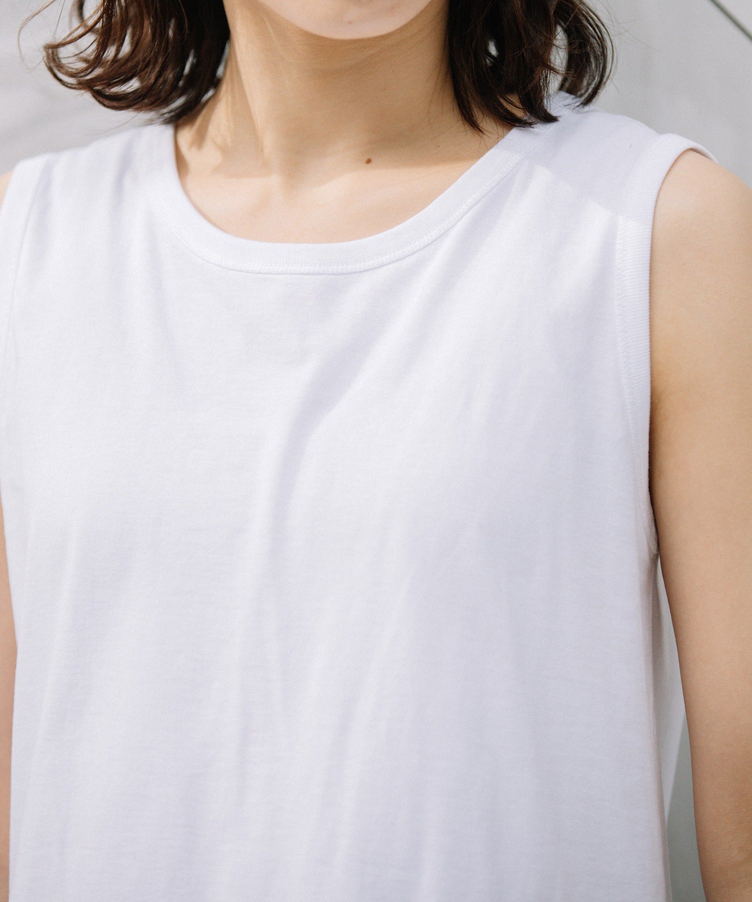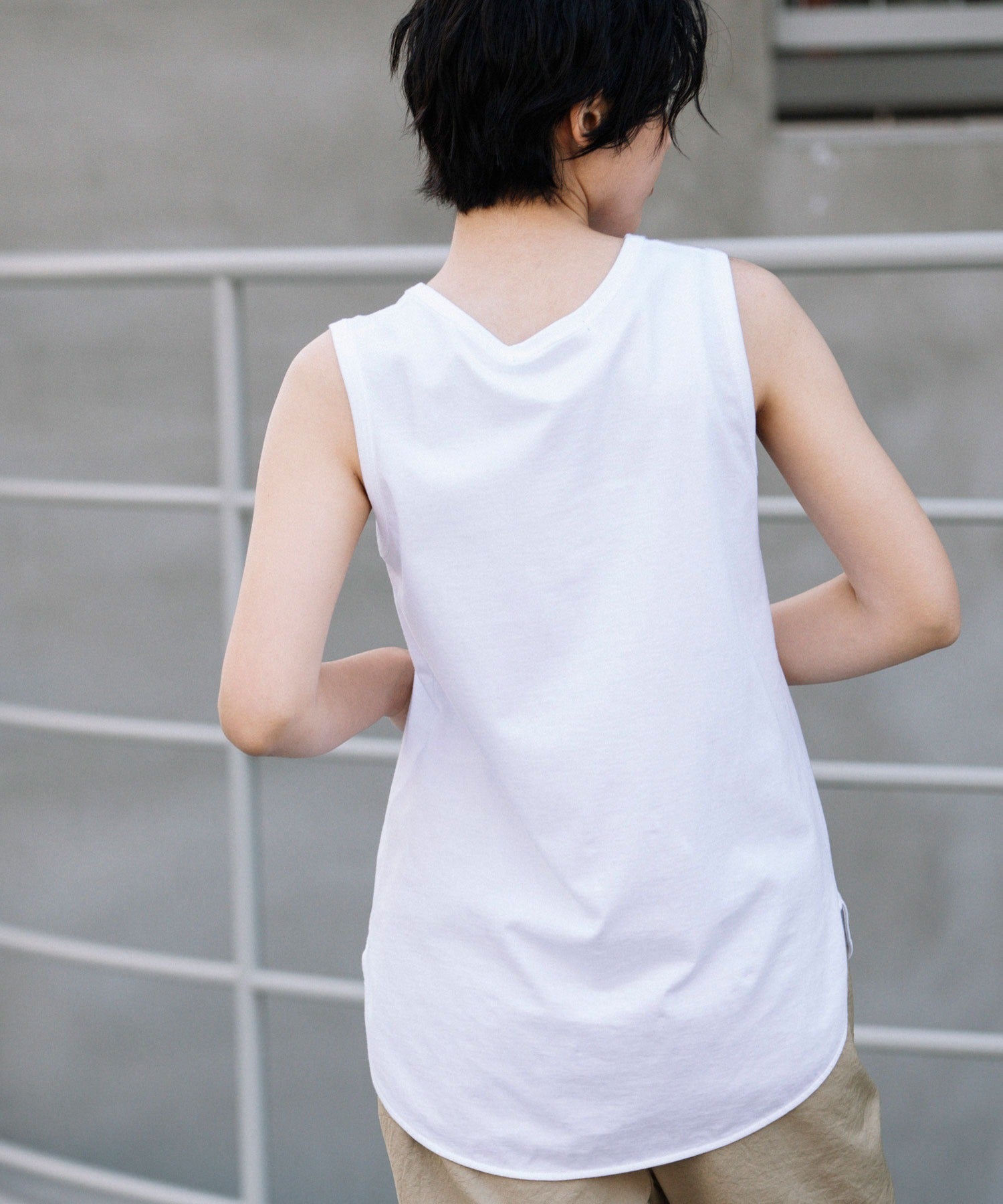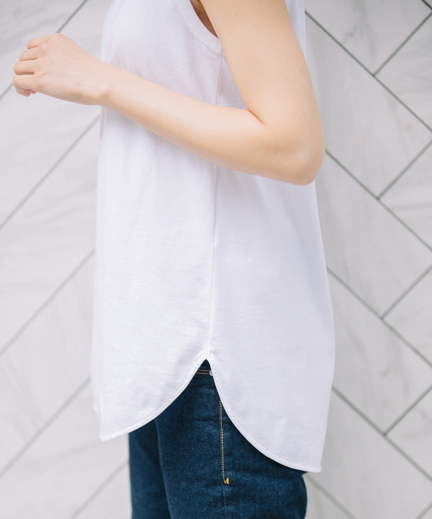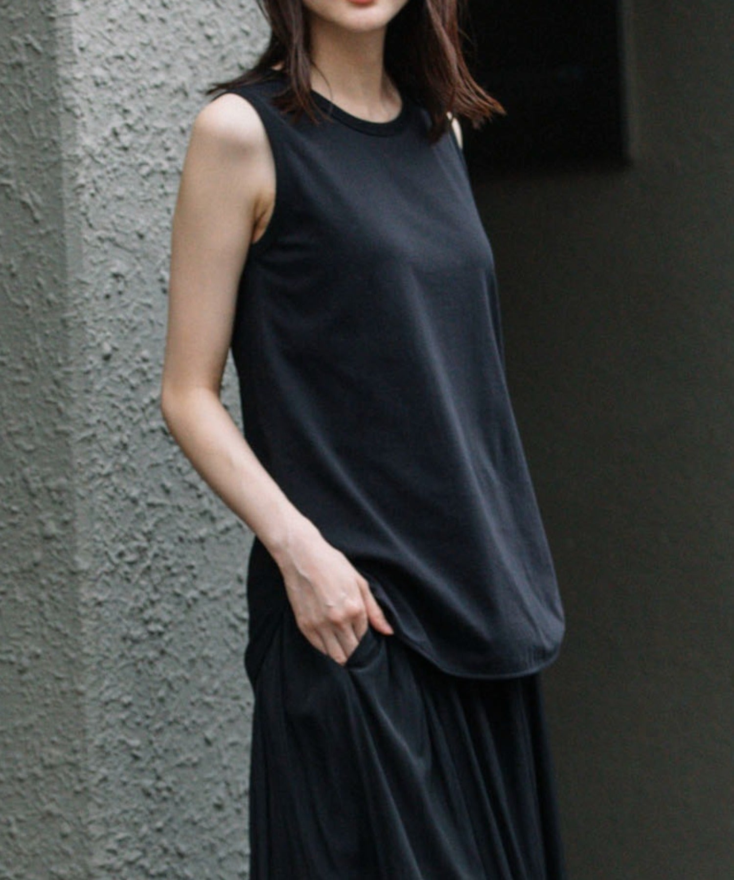 インナーとしてはもちろん、透け感が少ない素材なので1枚でも様になるよう肩幅はやや広めにし、アームホールのラインも身体が細く見えるよう計算されています。