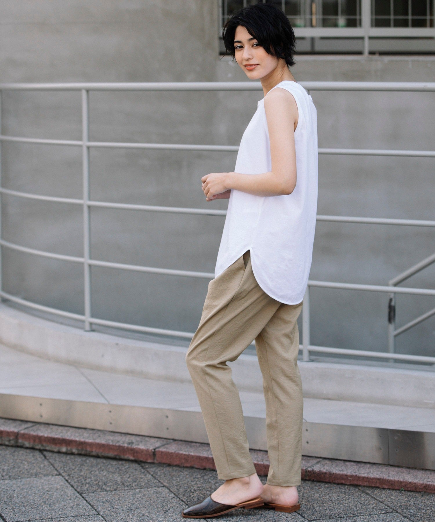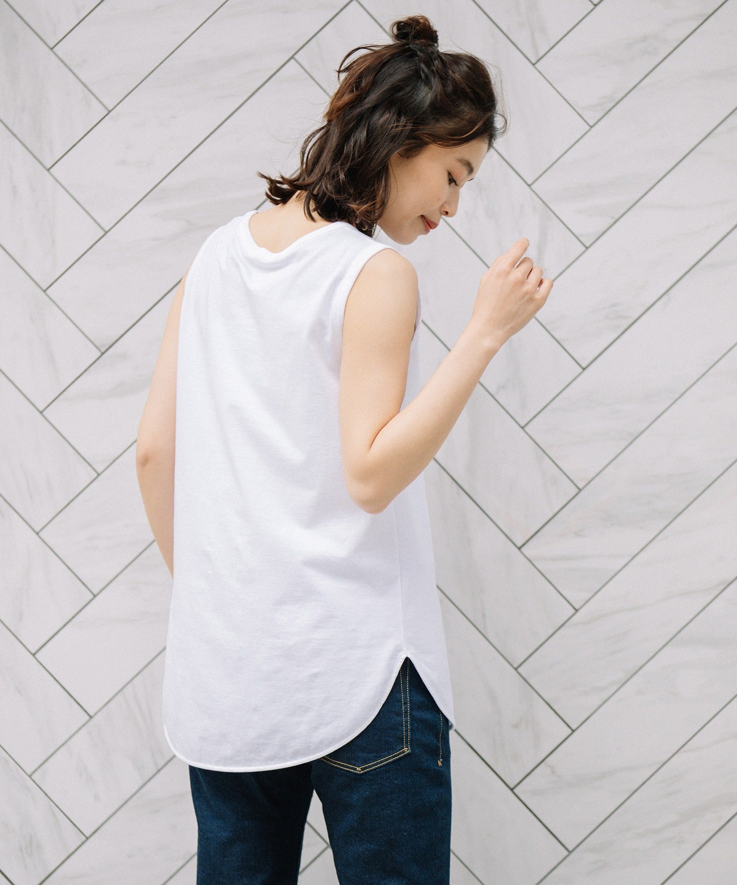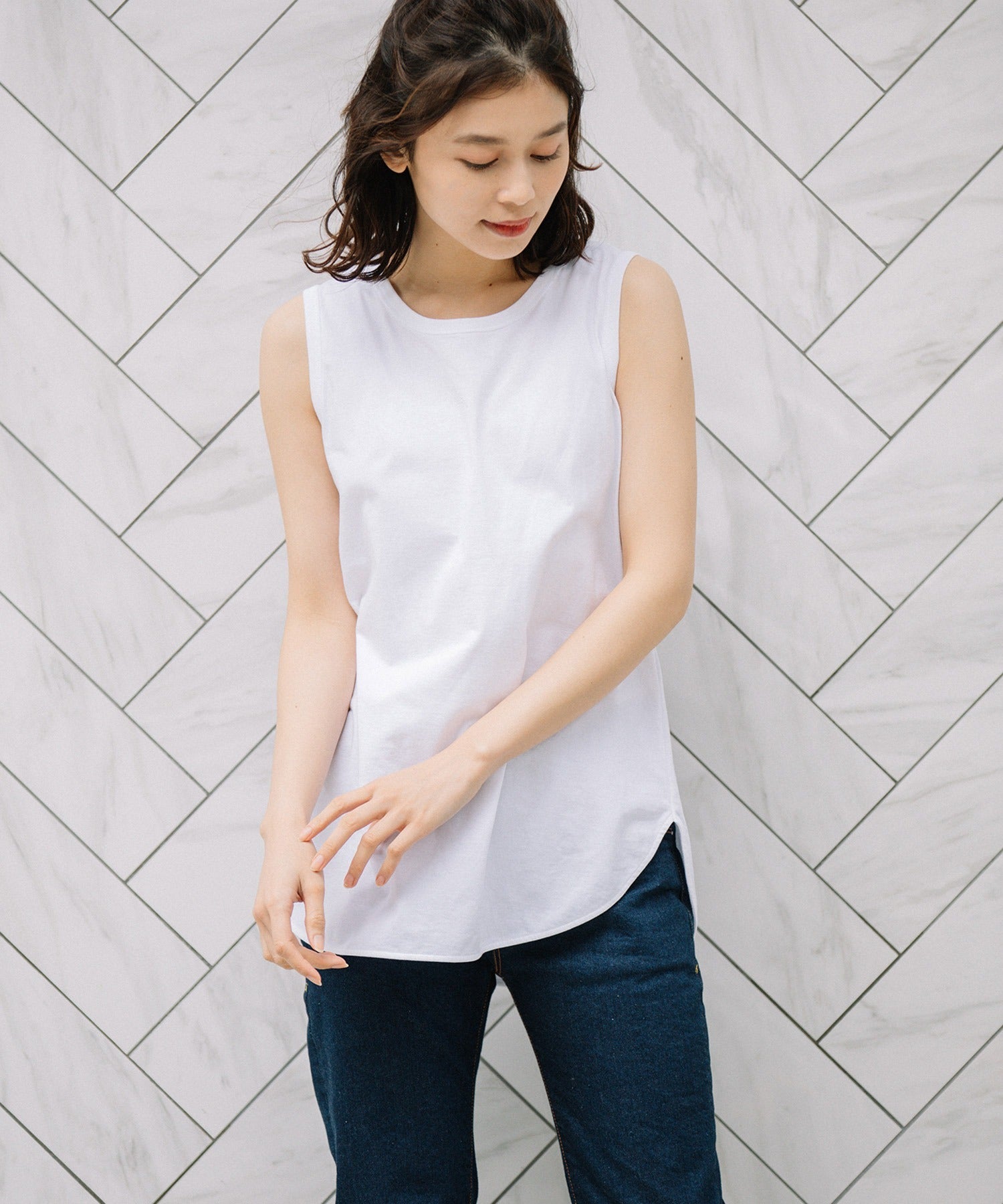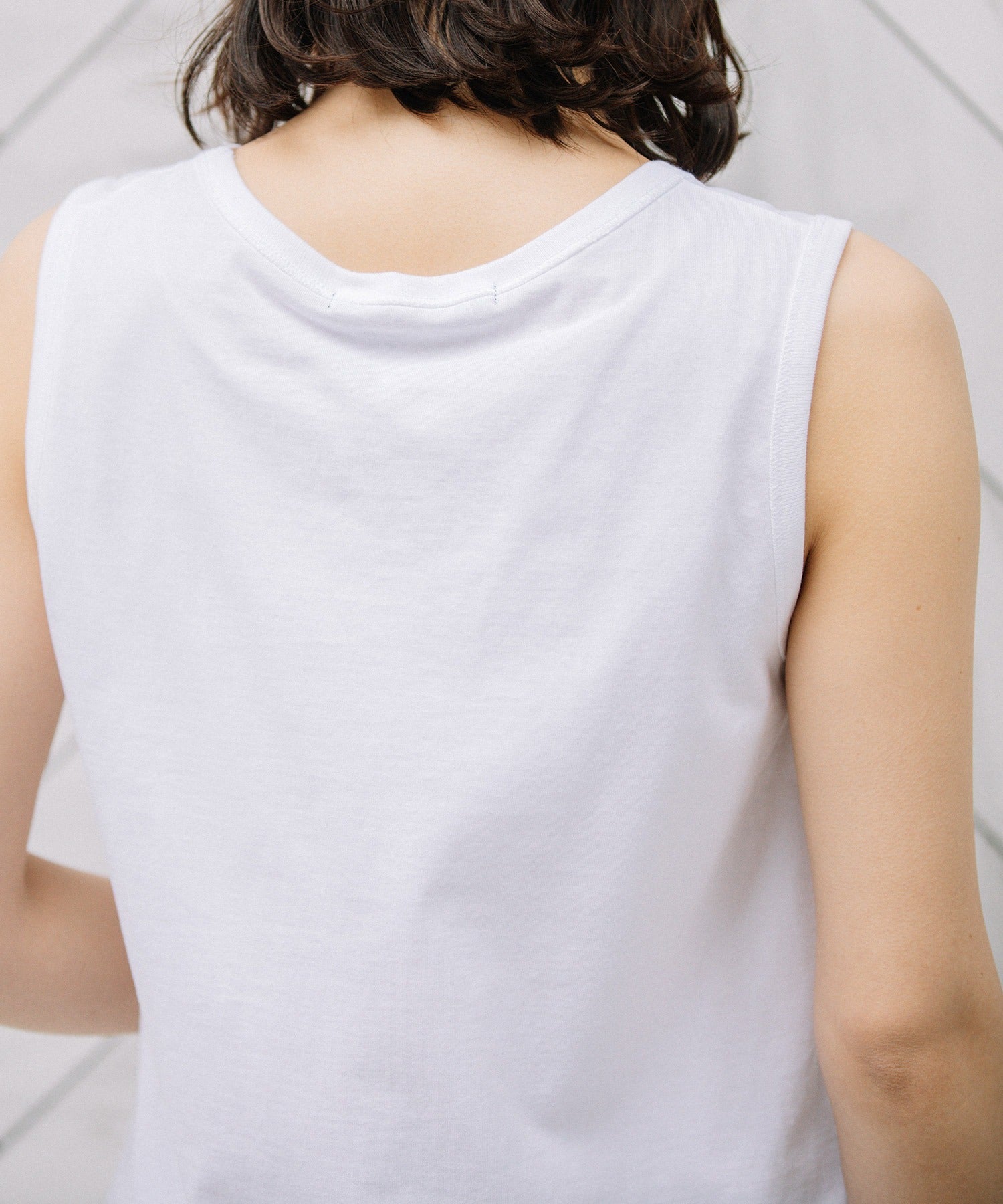 インナーとしてはもちろん、透け感が少ない素材なので1枚でも様になるよう肩幅はやや広めにし、アームホールのラインも身体が細く見えるよう計算されています。