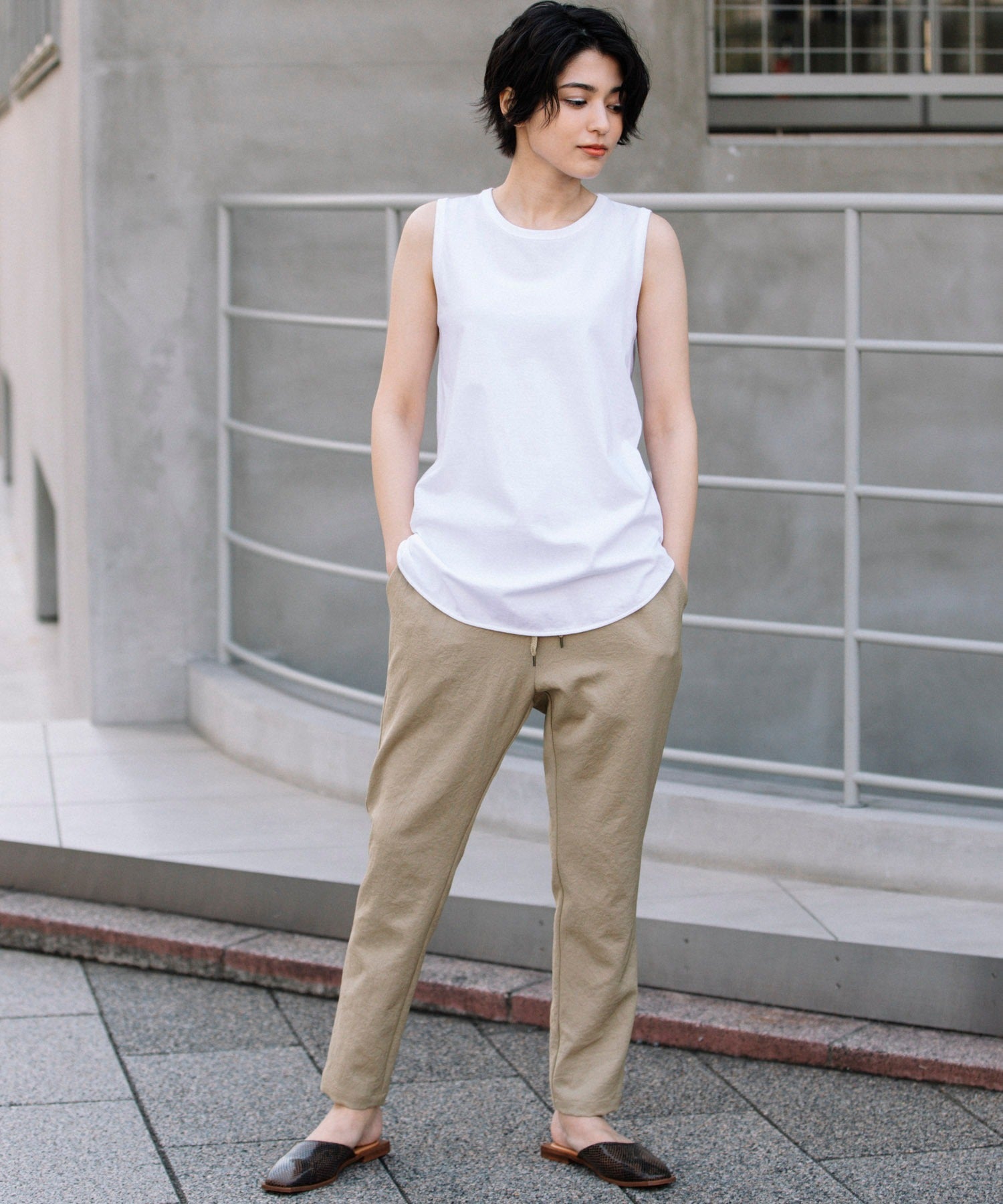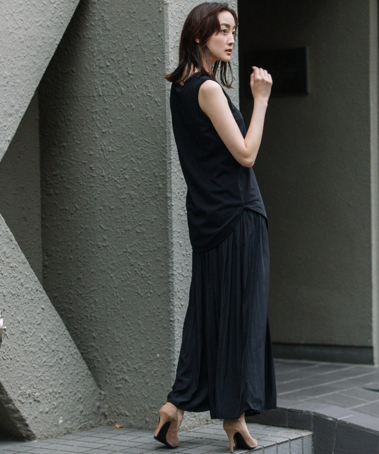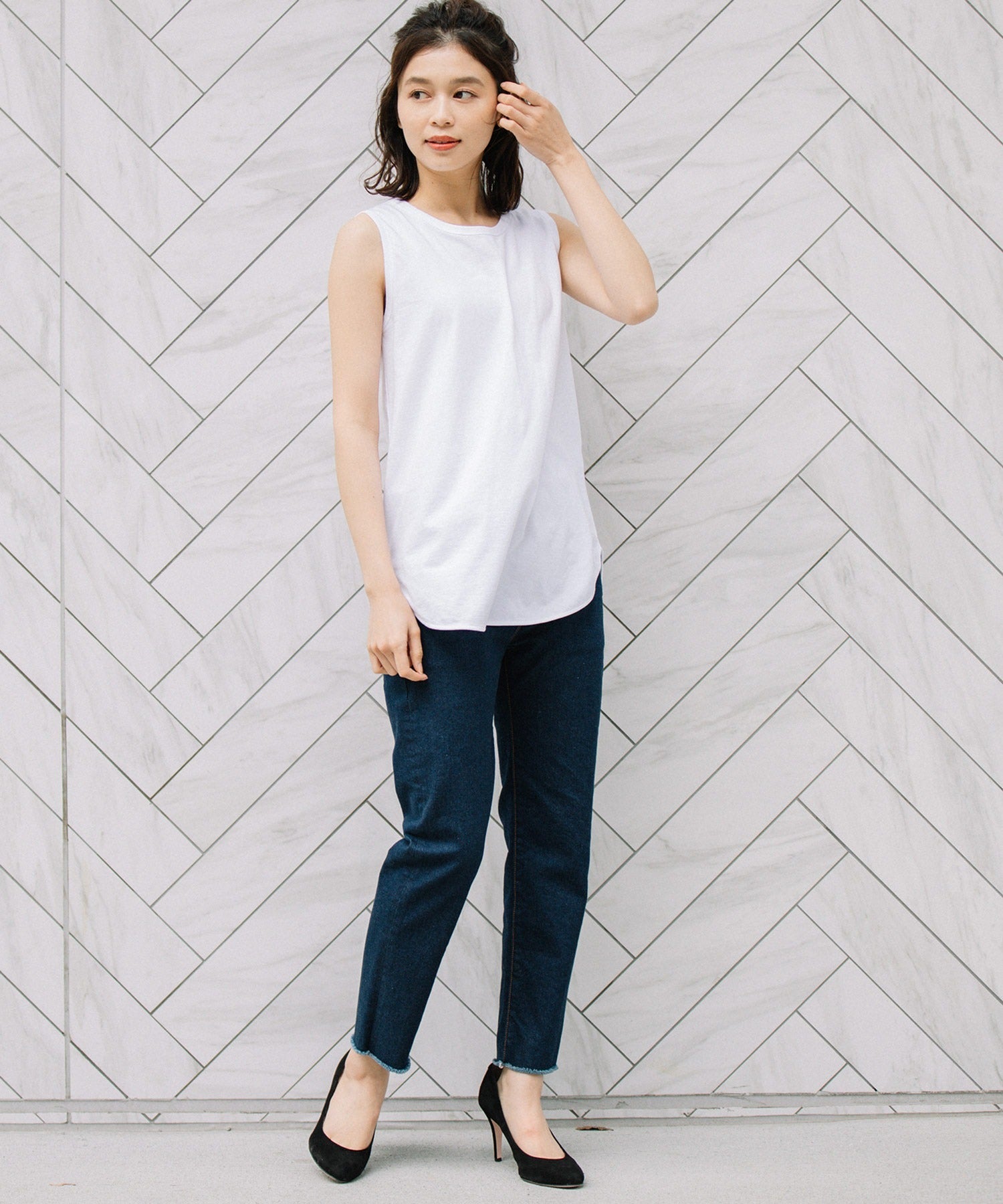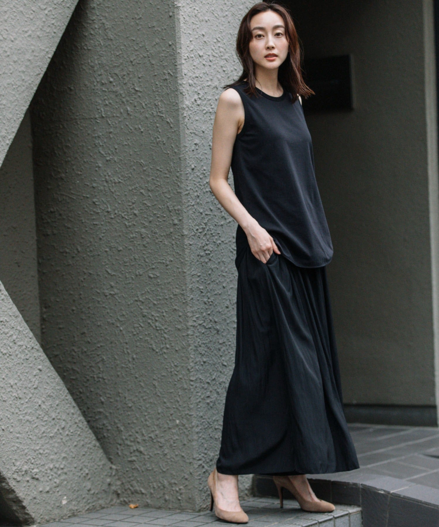 インナーとしてはもちろん、透け感が少ない素材なので1枚でも様になるよう肩幅はやや広めにし、アームホールのラインも身体が細く見えるよう計算されています。