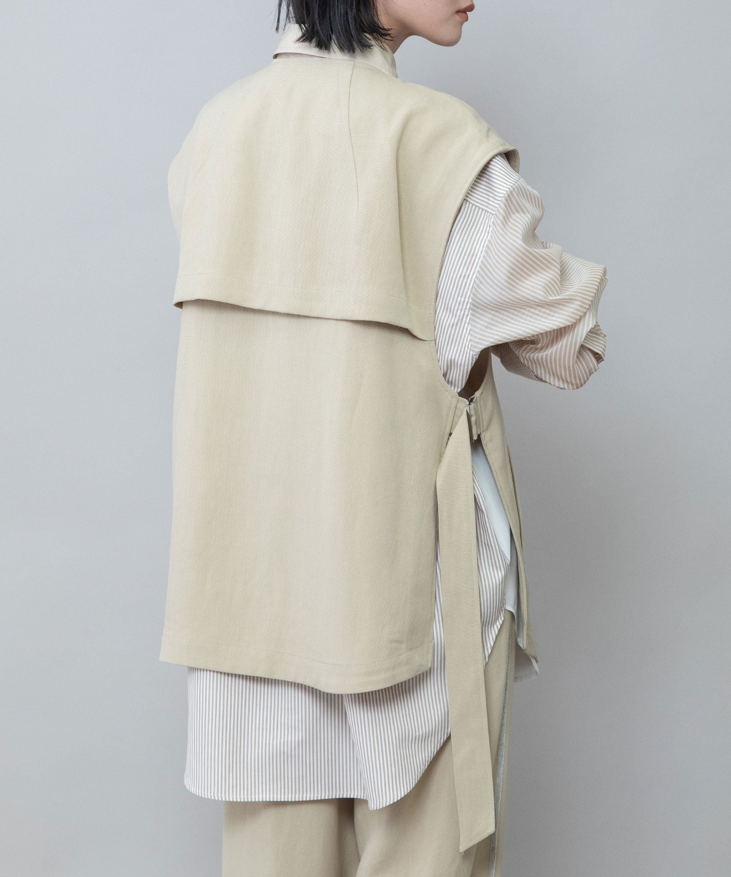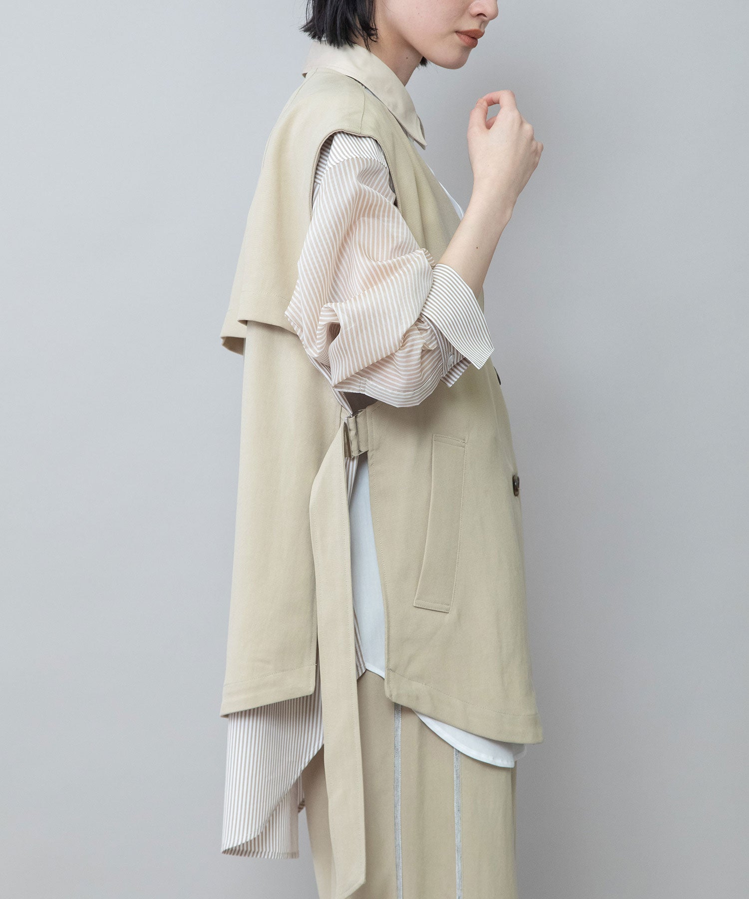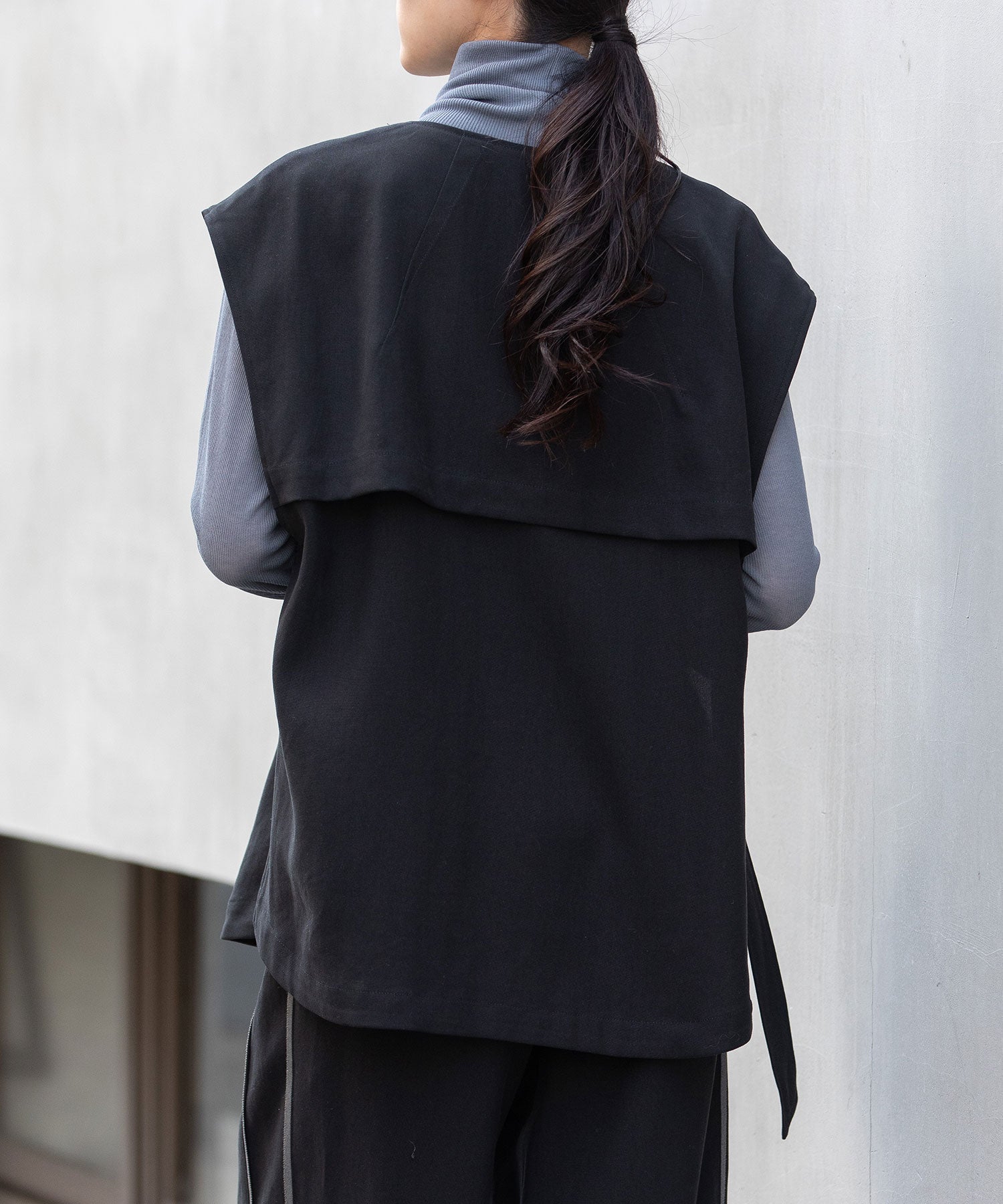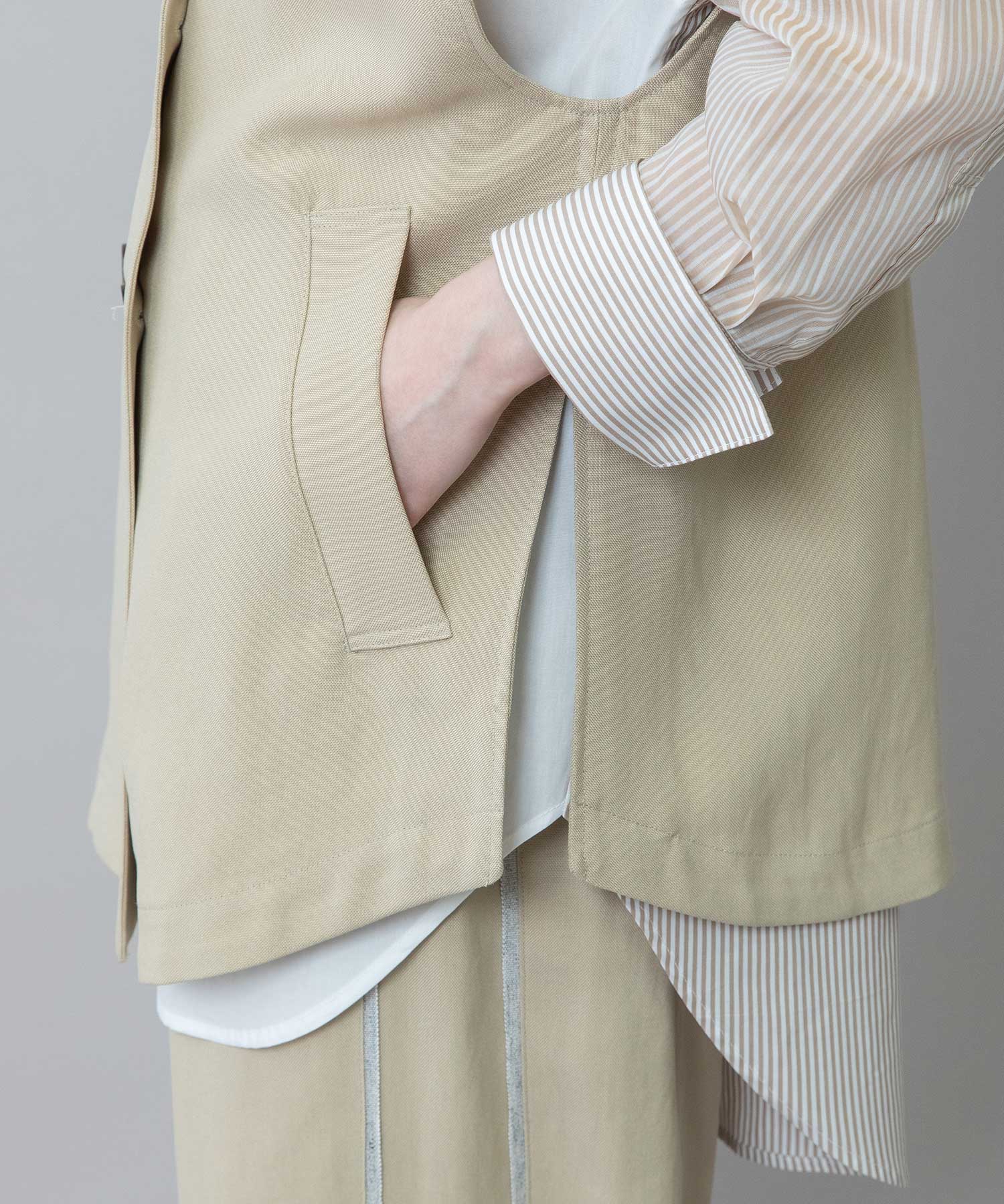 ノーカラーですっきりと、キレイめに着用出来るベルテッドジレ。