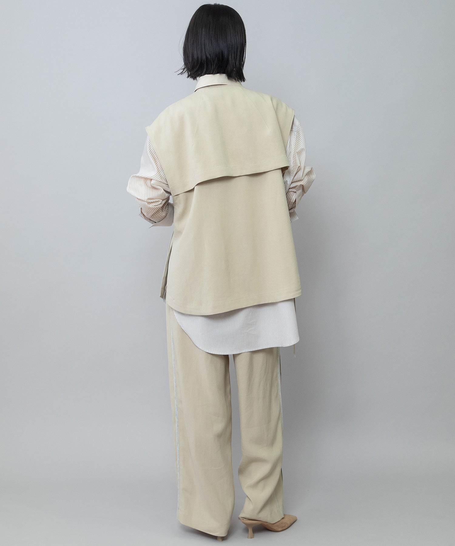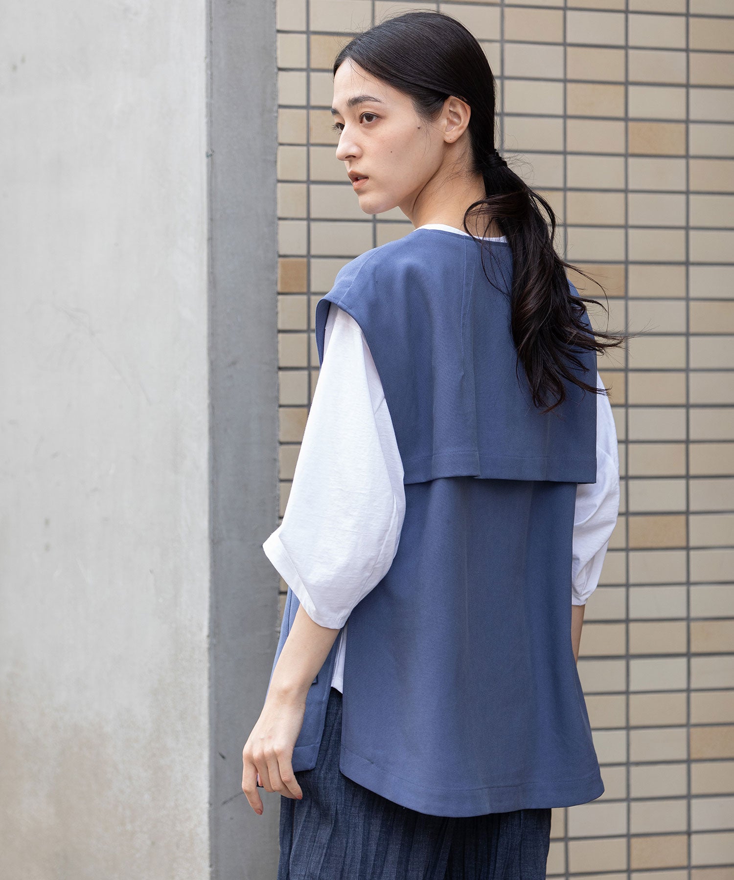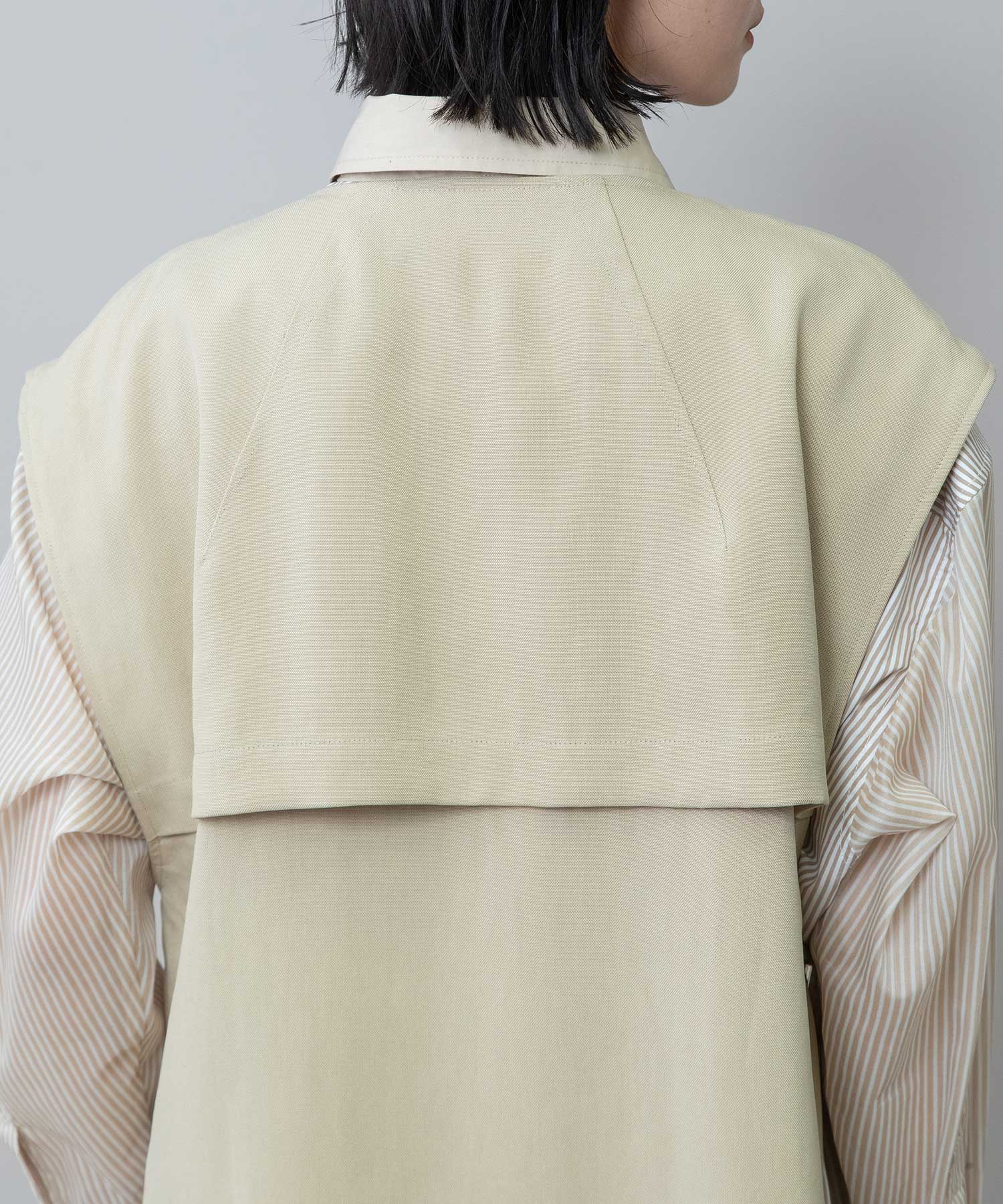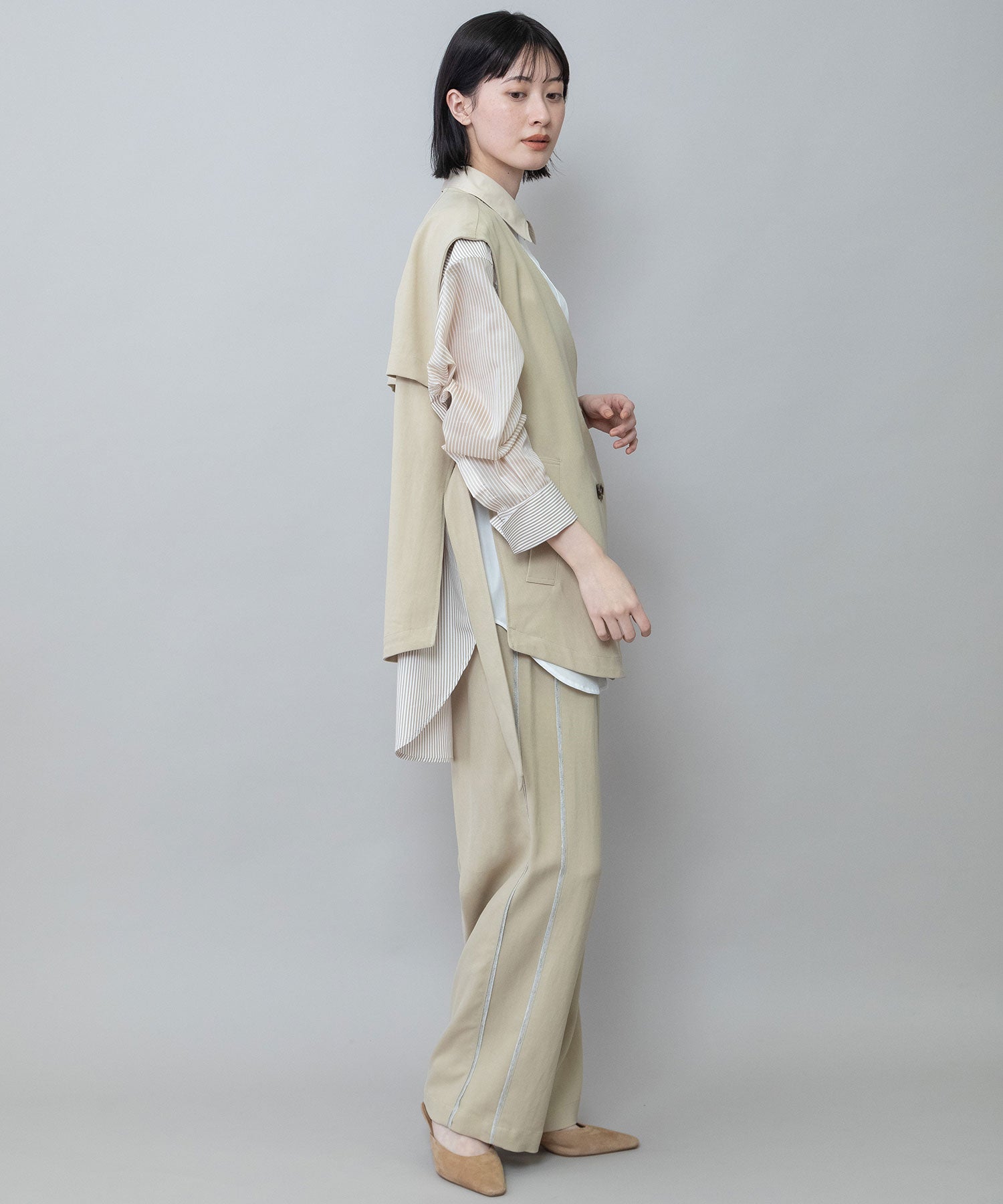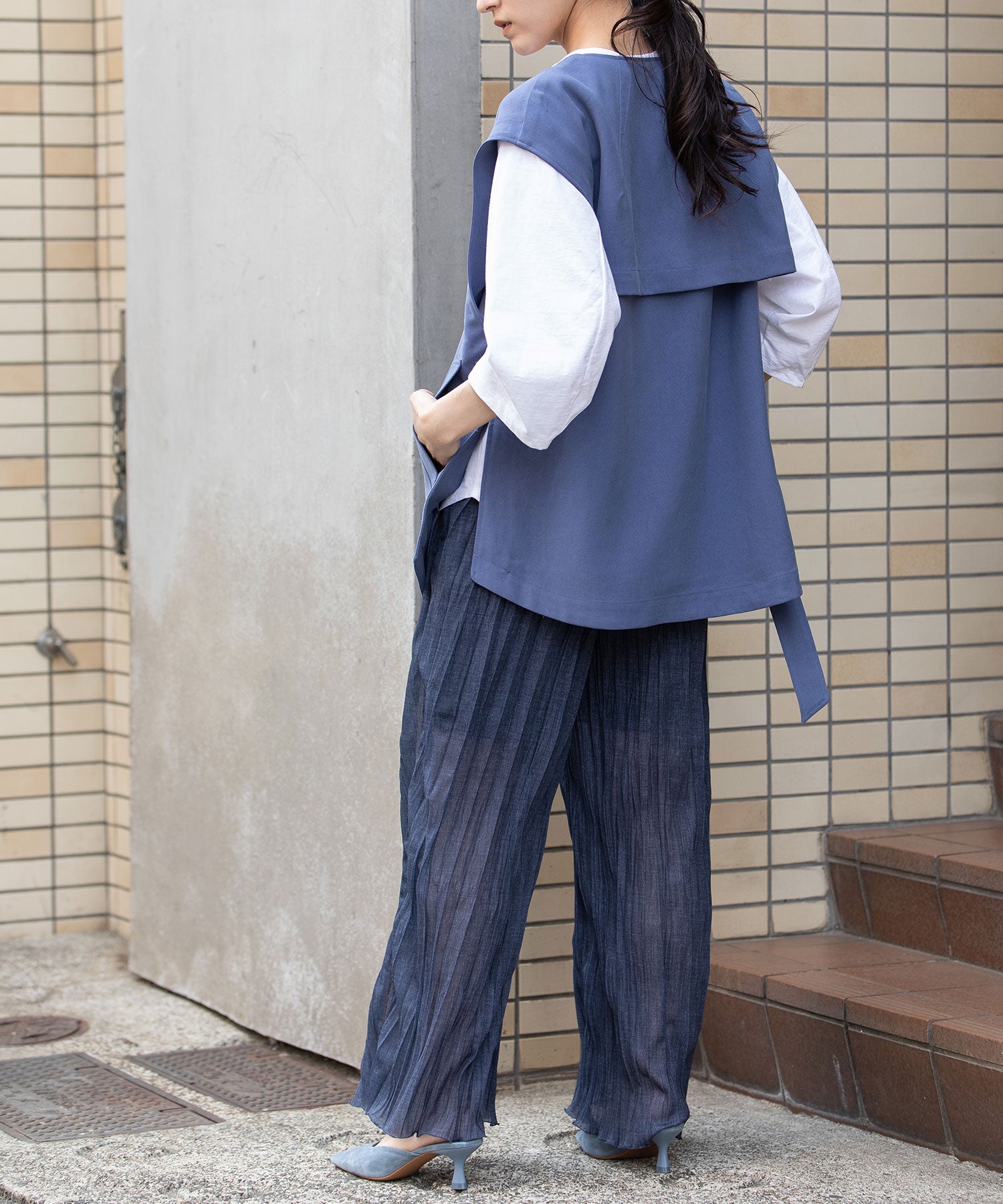 ノーカラーですっきりと、キレイめに着用出来るベルテッドジレ。