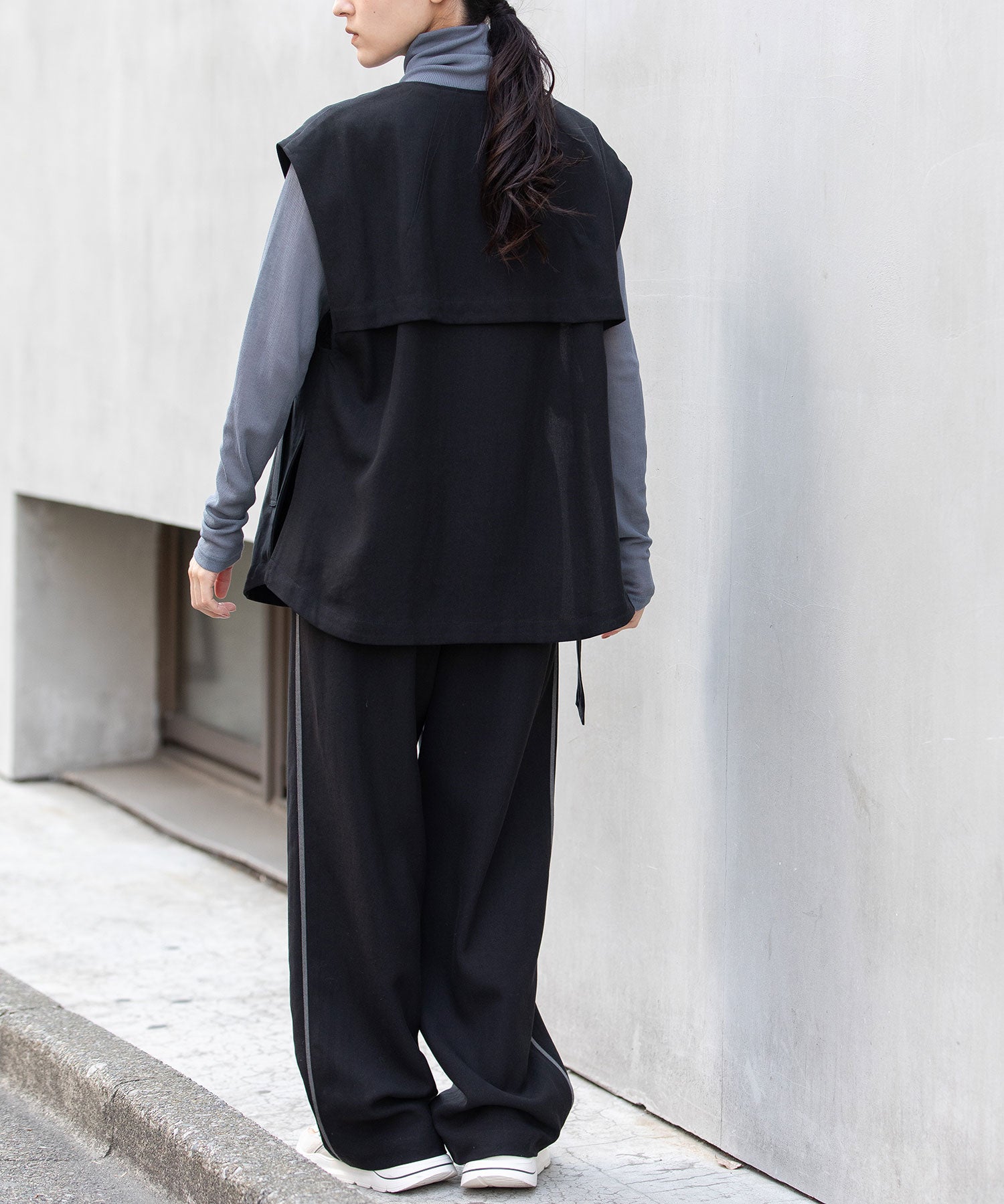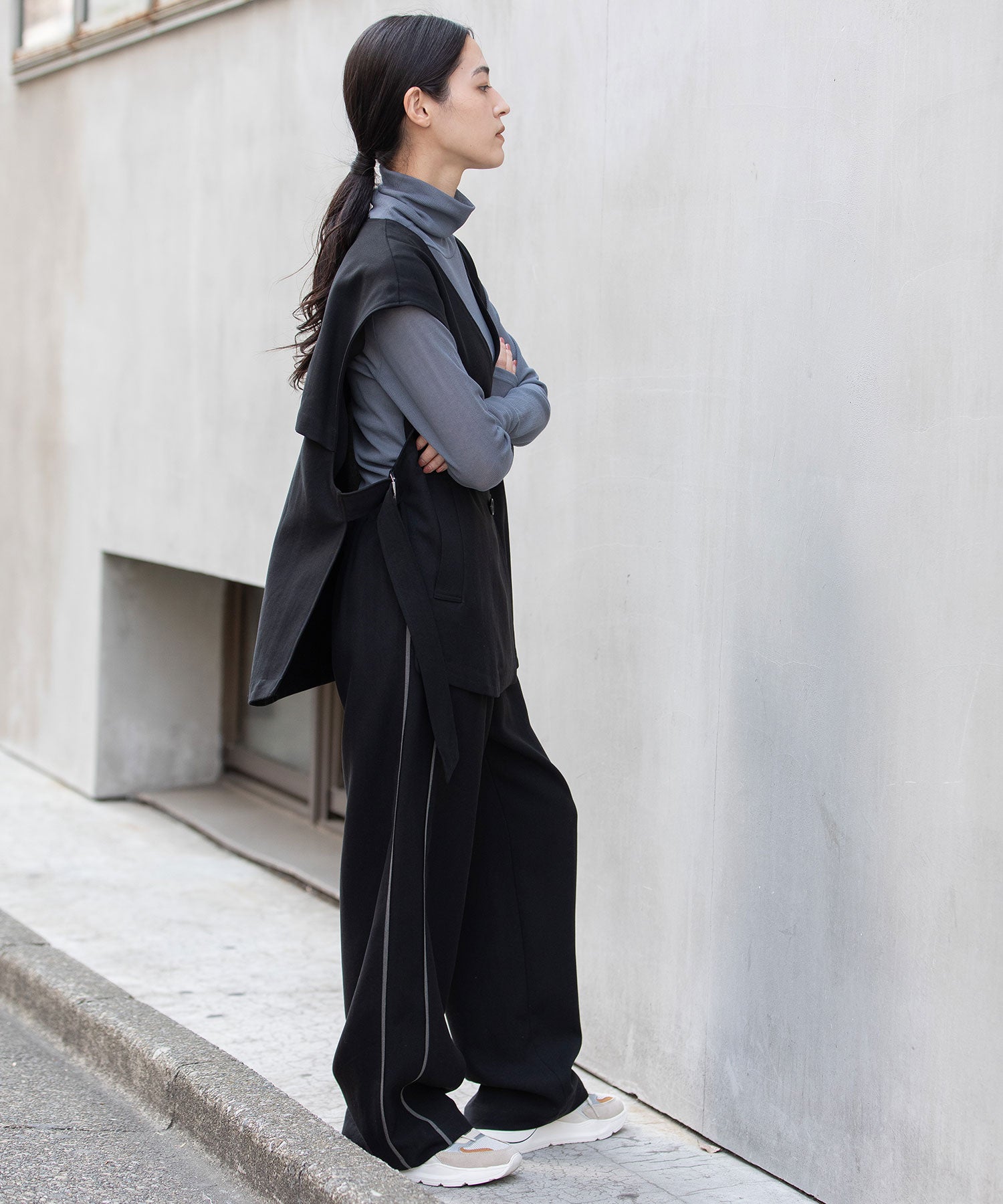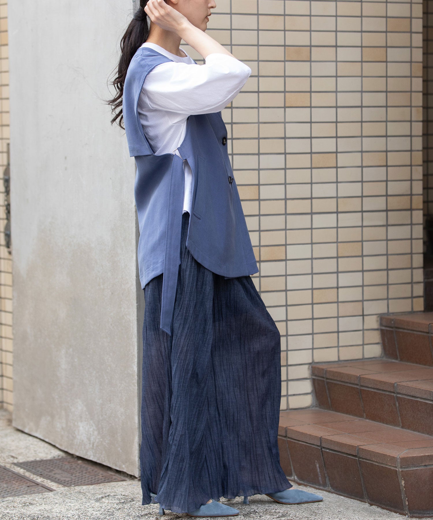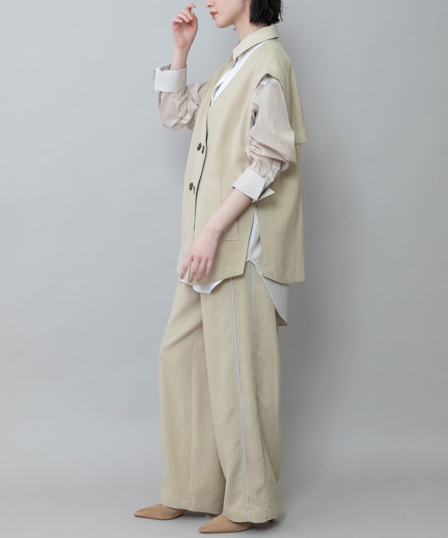ノーカラーですっきりと、キレイめに着用出来るベルテッドジレ。