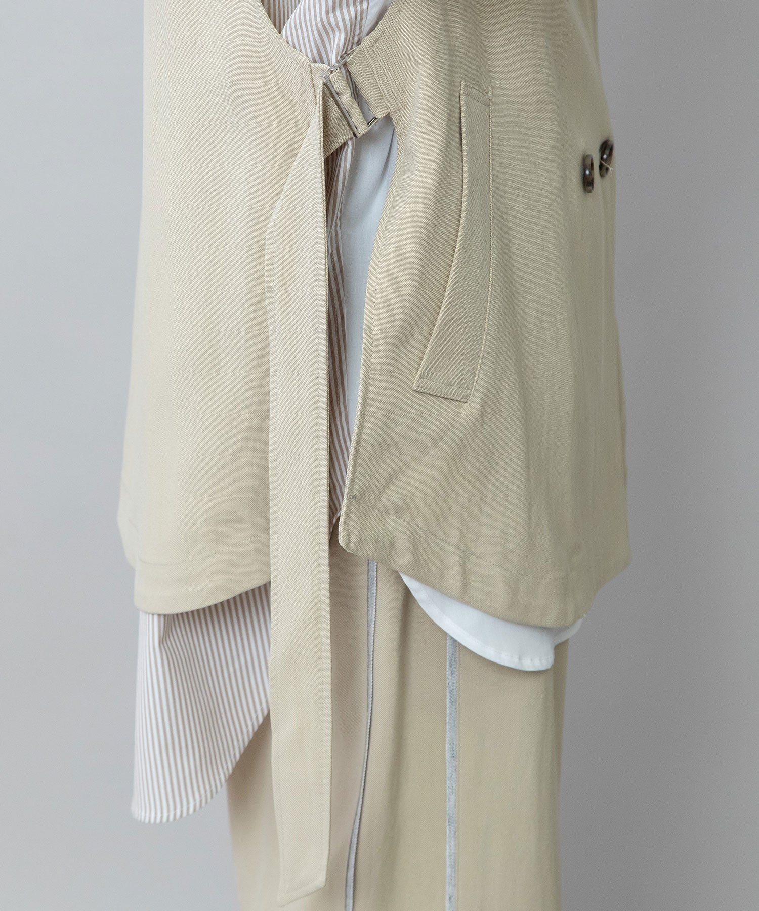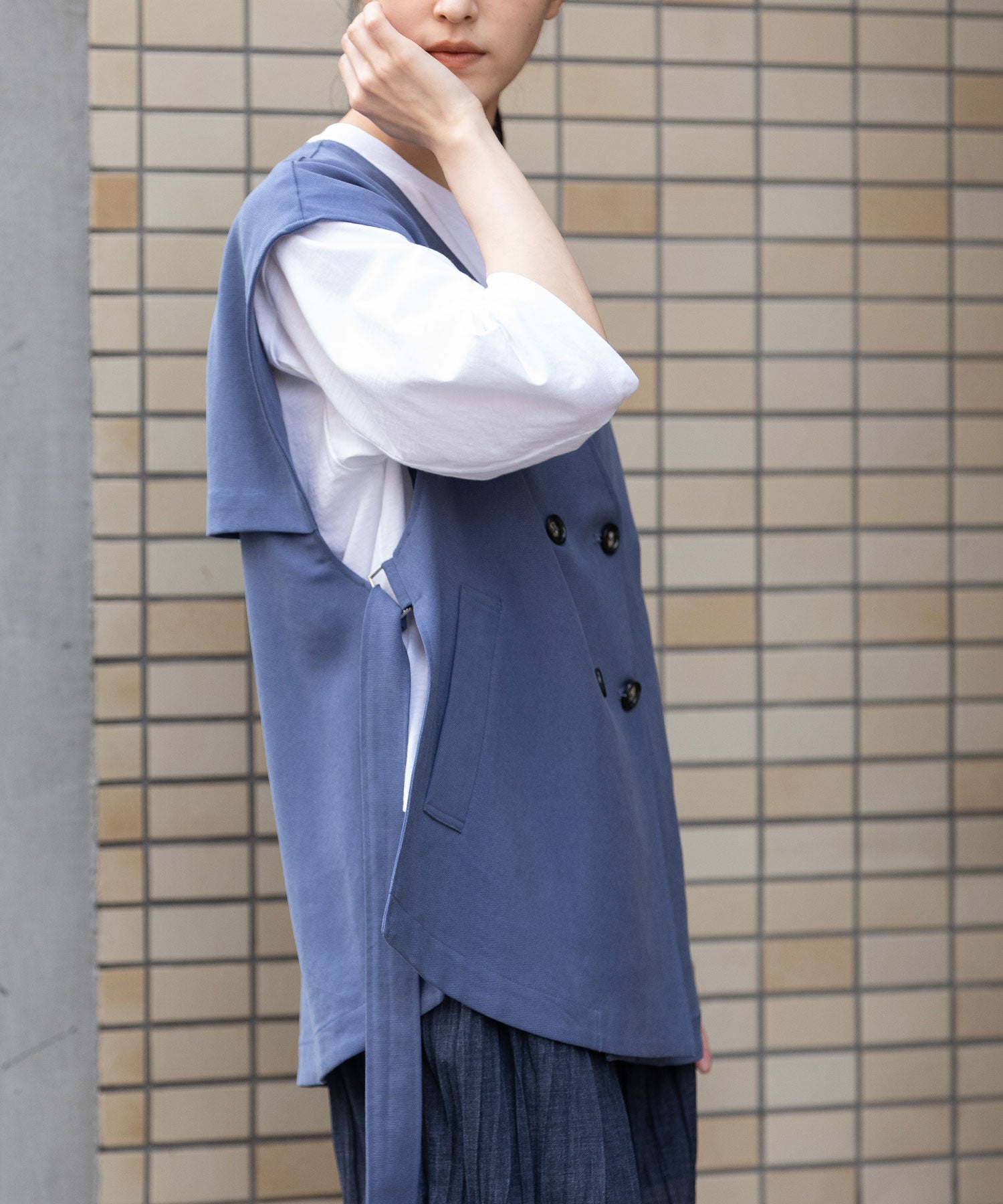 深めのVネックでダブルブレストにする事で女性らしくも、カッコ良くもこなせます。肩を覆うような裄丈と、低めのカマ底は、インナーを選ばずレイヤードができ、オールシーズン便利に使えそう。左サイドは深めのスリット、右サイドは華奢なタイプのDカン&ベルトディティールで動きのあるデザインに仕上げていて、ベルトは長めに取っているので、落ち感のある素材の雰囲気やスリット、バックスタイルの浮きヨークとあわせて、着用時の揺れる感じがスタイリングに軽さをプラスします。