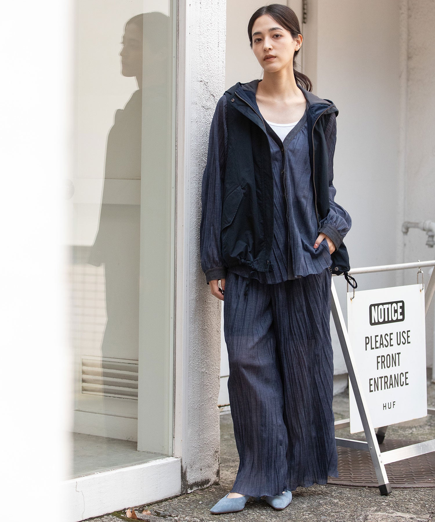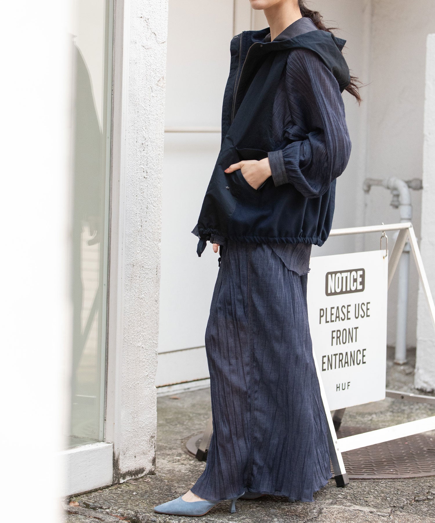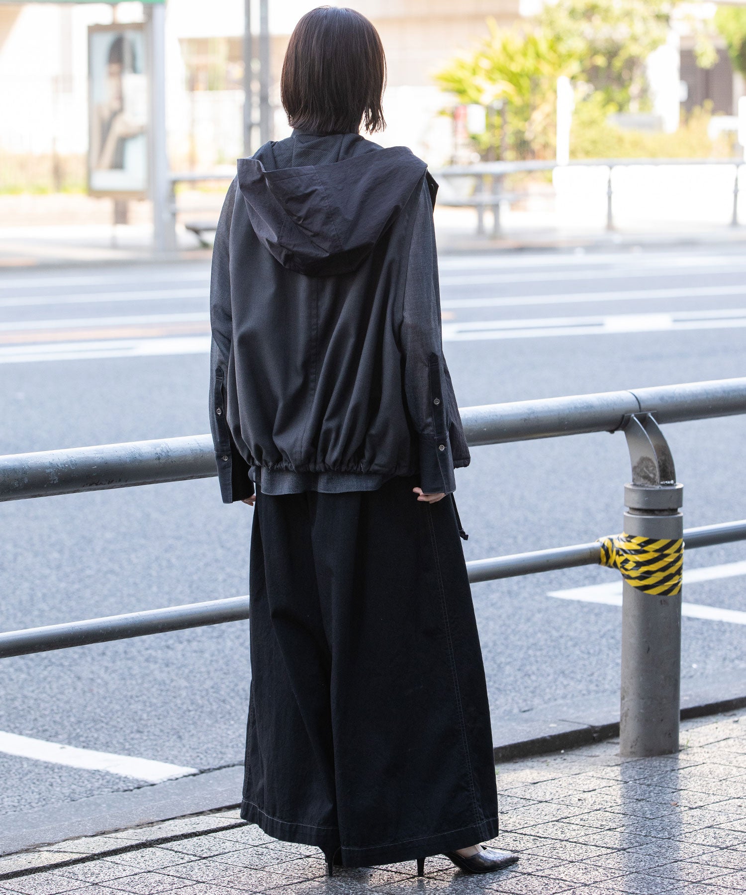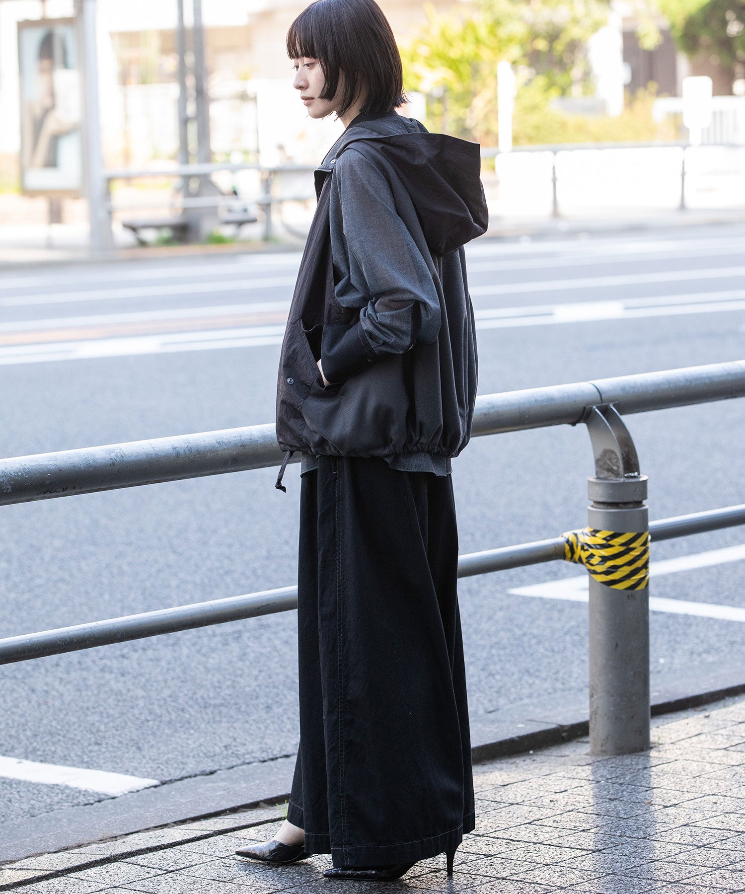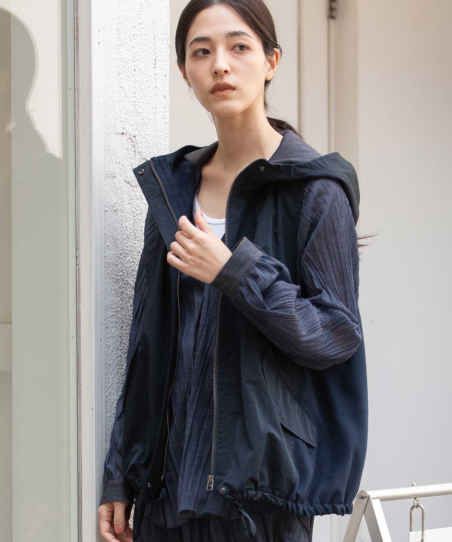 Aラインのシルエットに後ろでほんのり丸みをつけ、裾を絞ると丸みのある女性らしいフォルムに。フードはやや大きめなつくりで更に立体感をプラスしています。