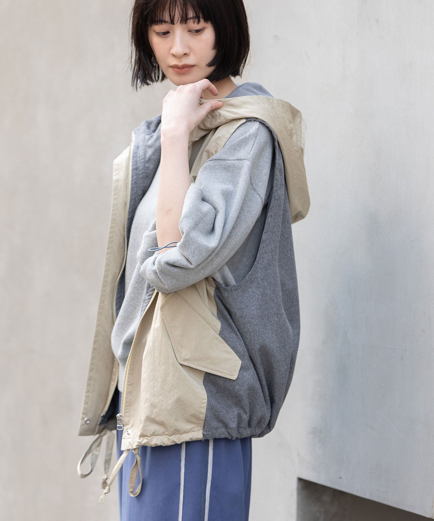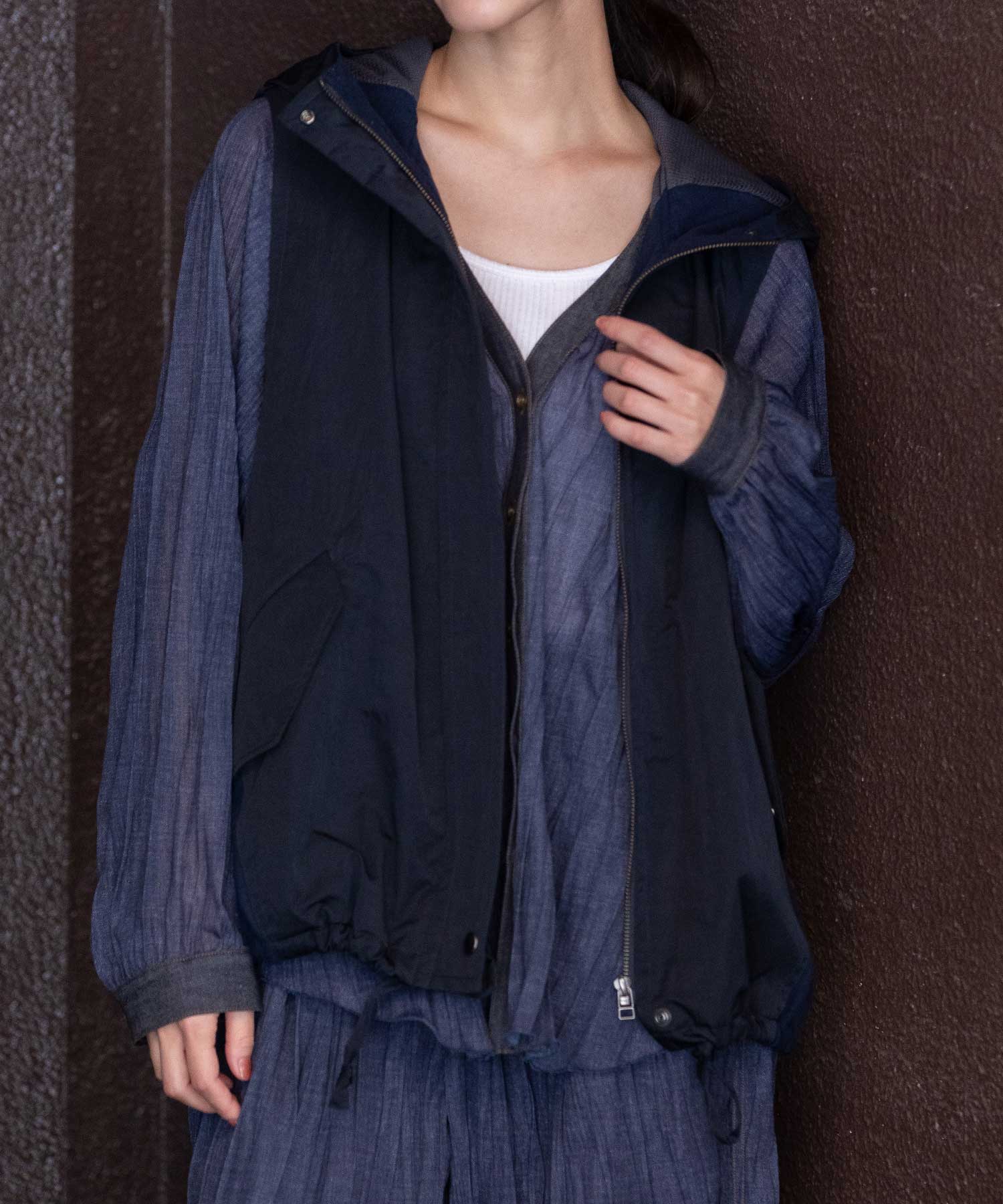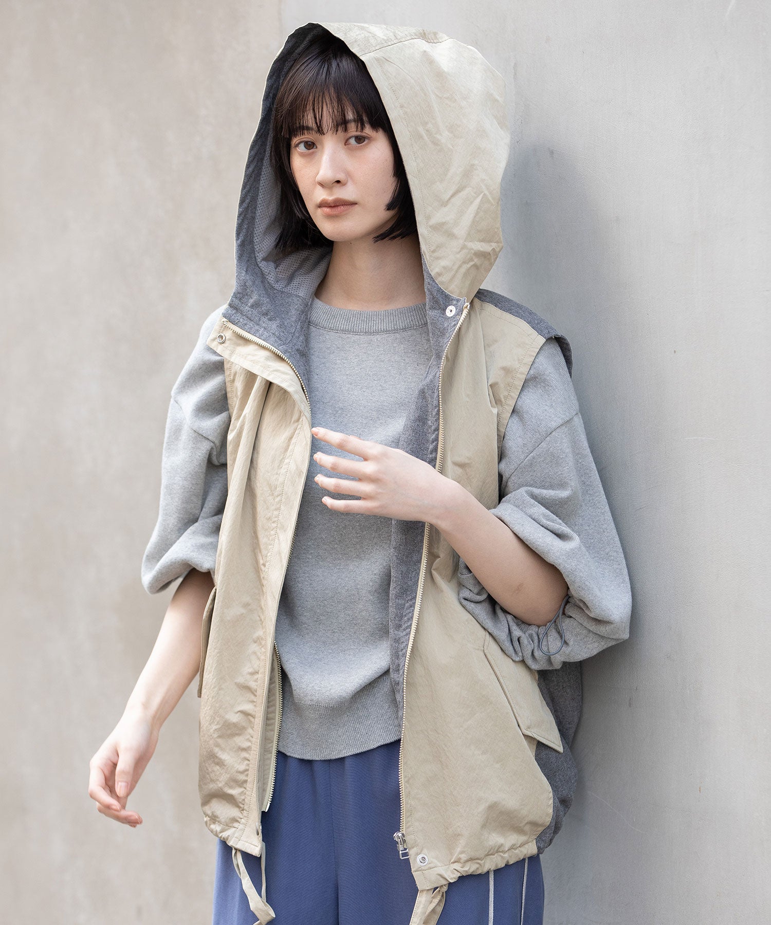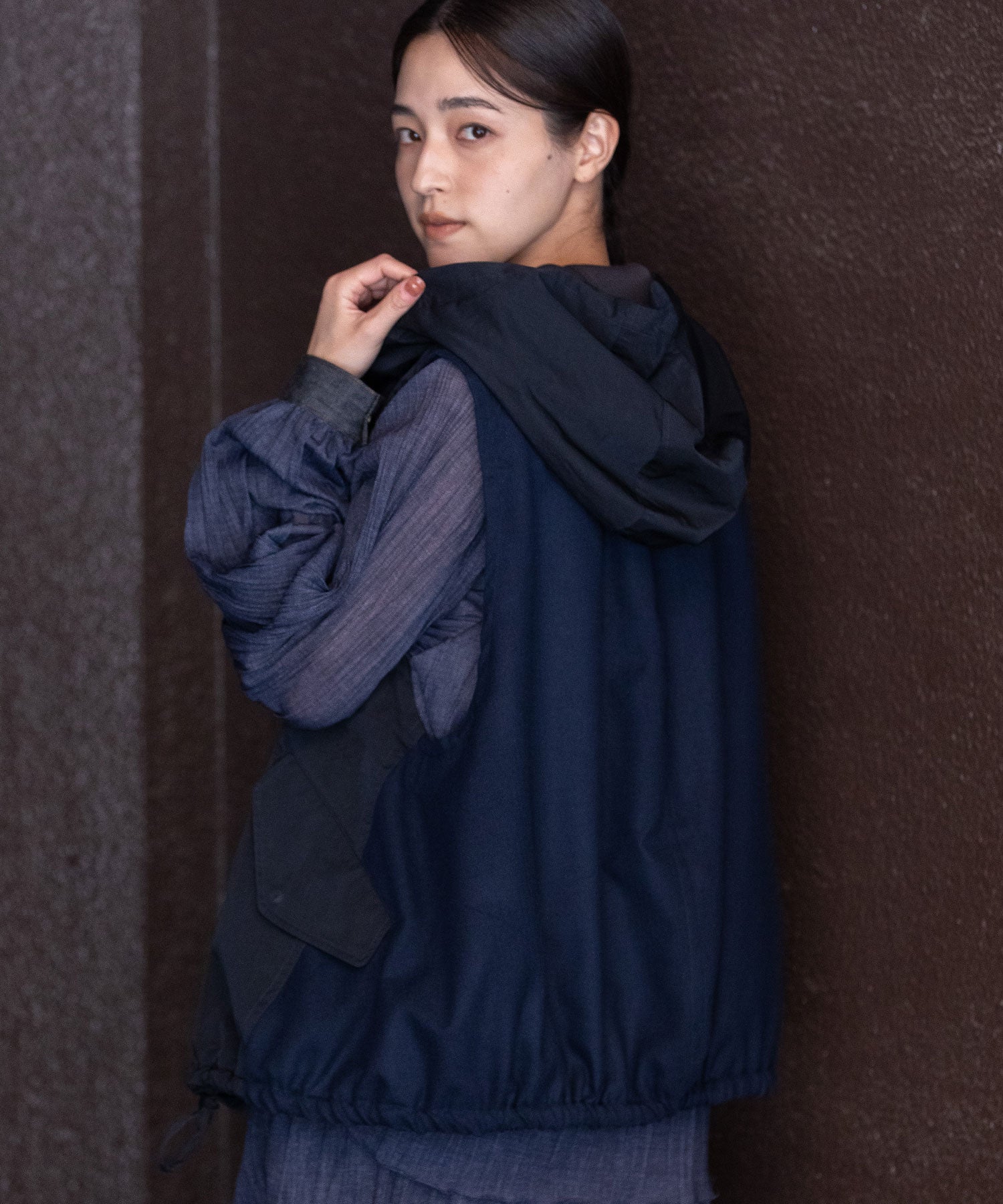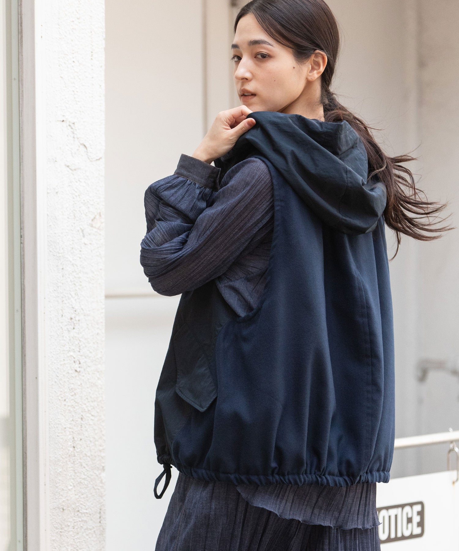 光沢感のあるツイル×梳毛調合繊の異素材をドッキングしたフーデッドベストです。