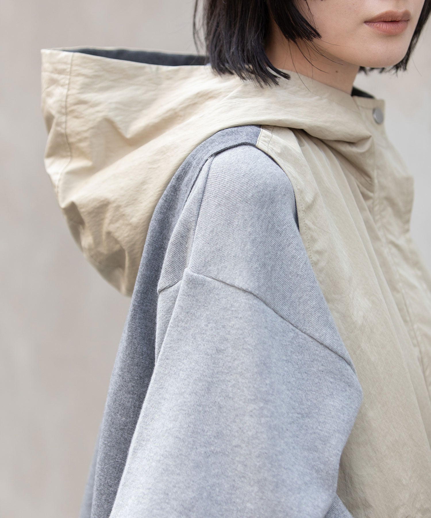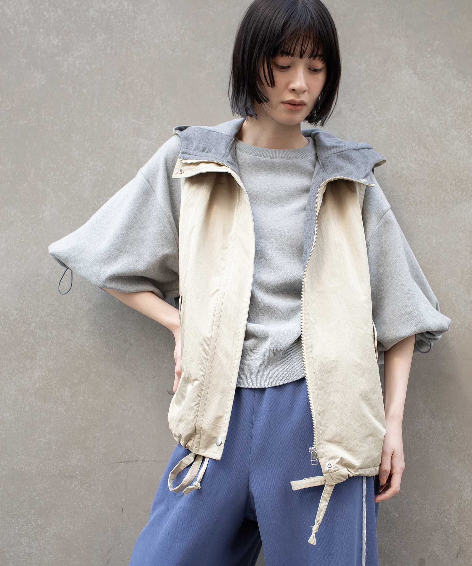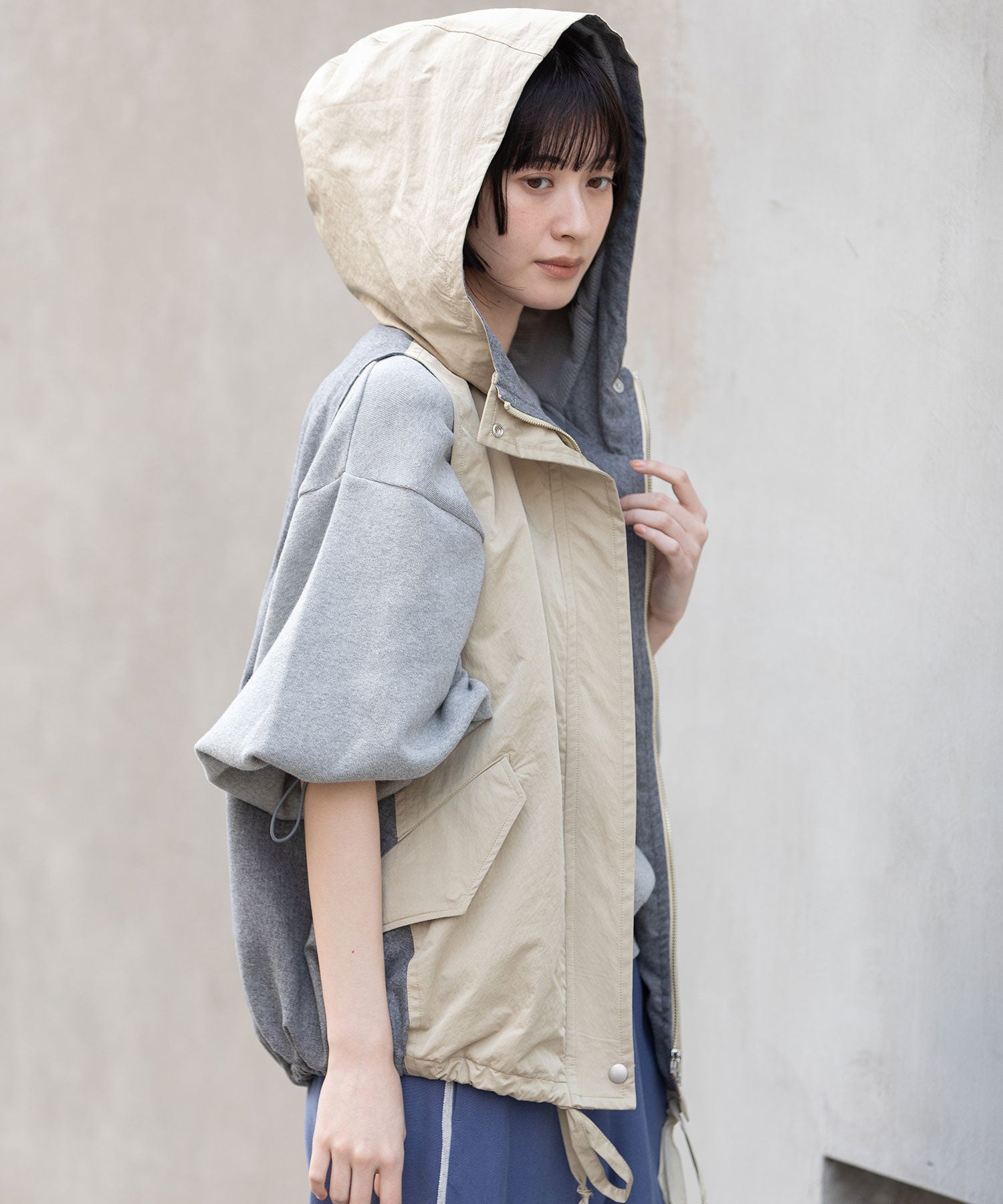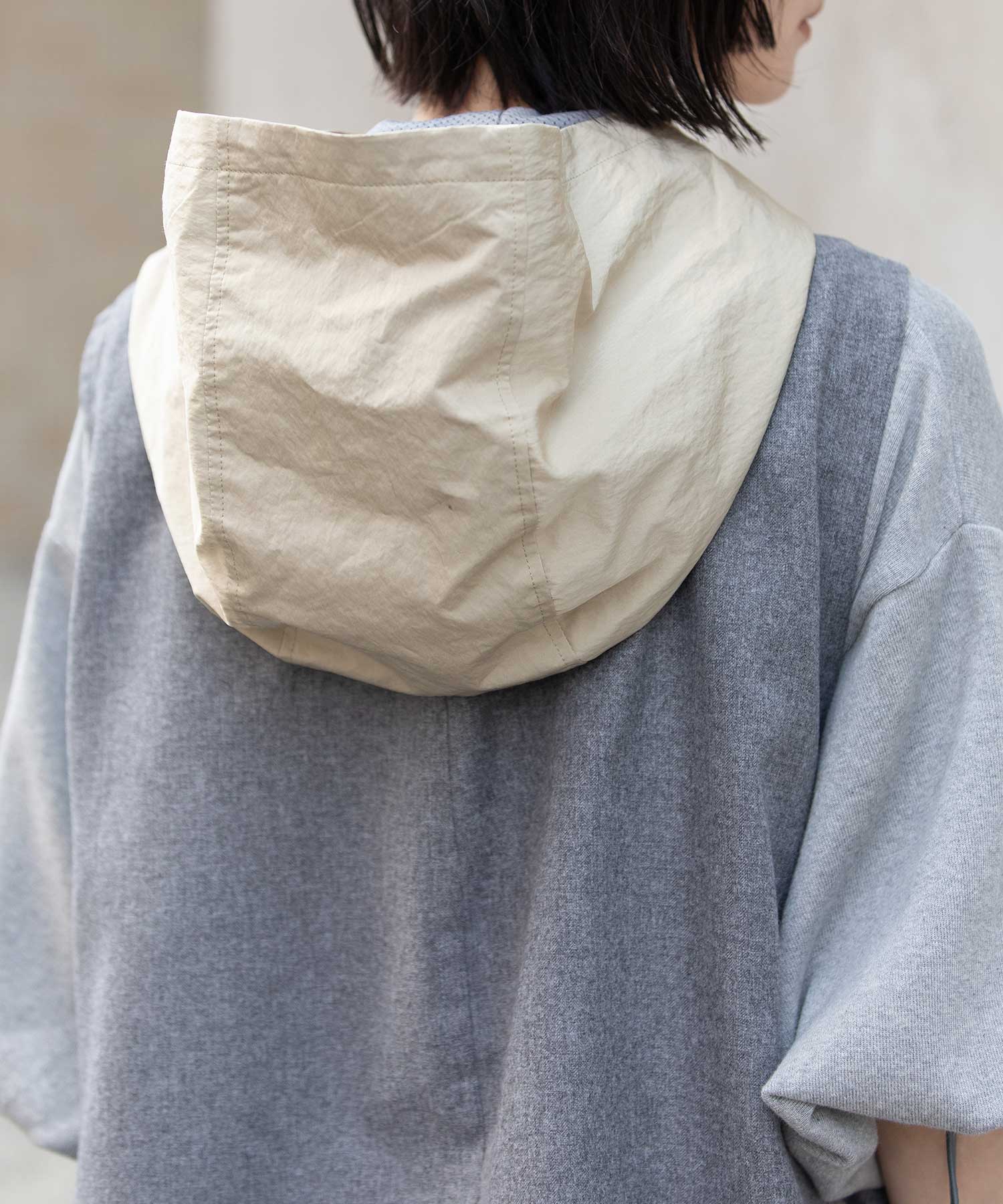 光沢感のあるツイル×梳毛調合繊の異素材をドッキングしたフーデッドベストです。