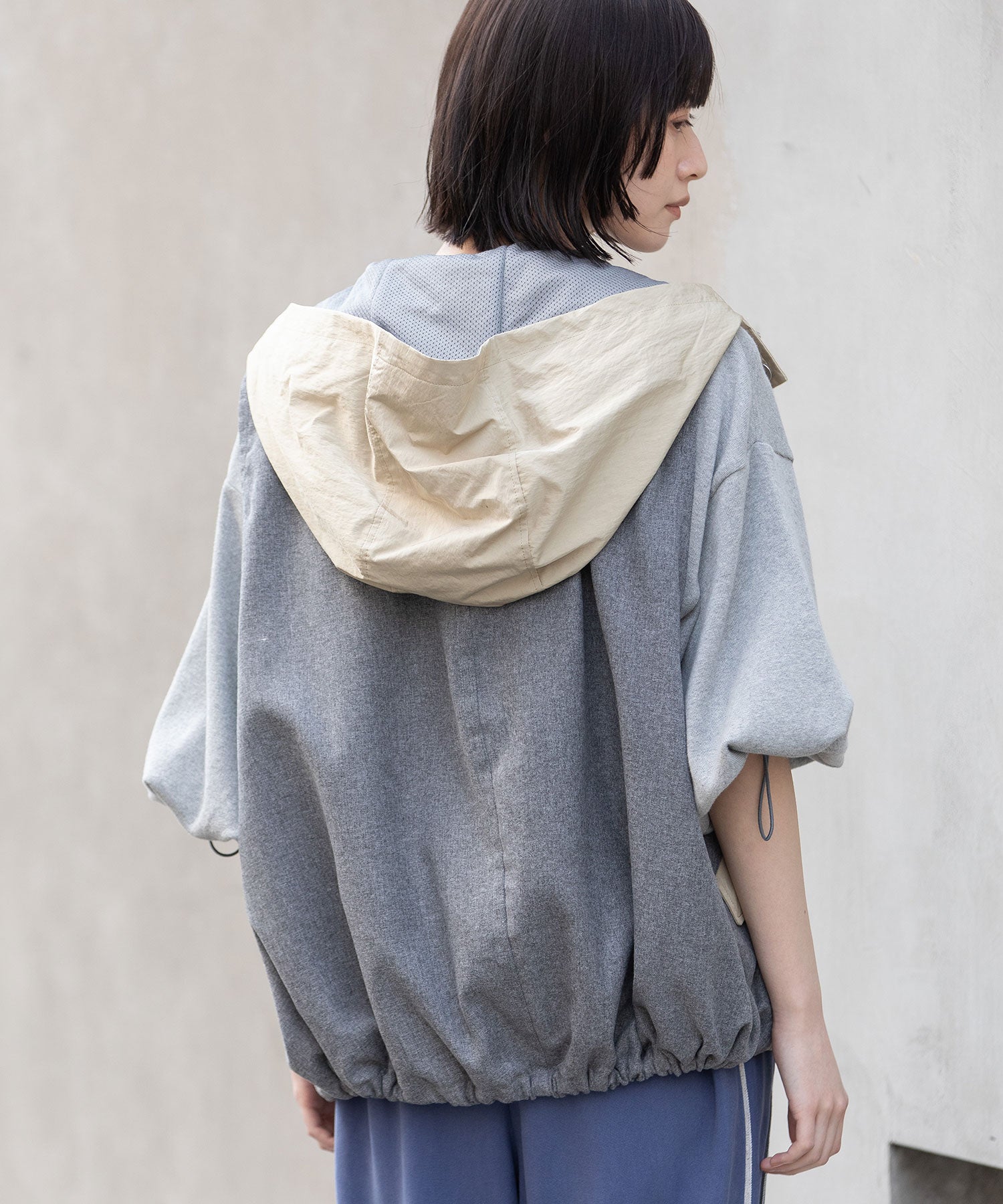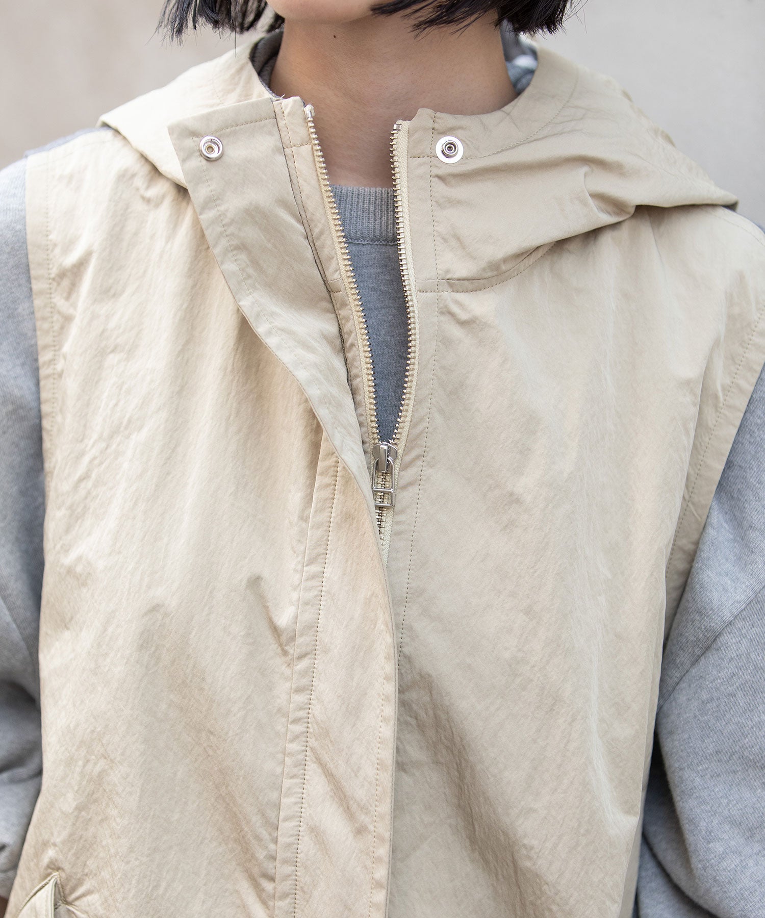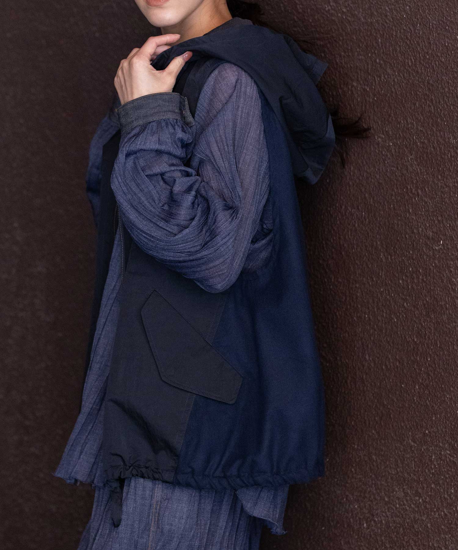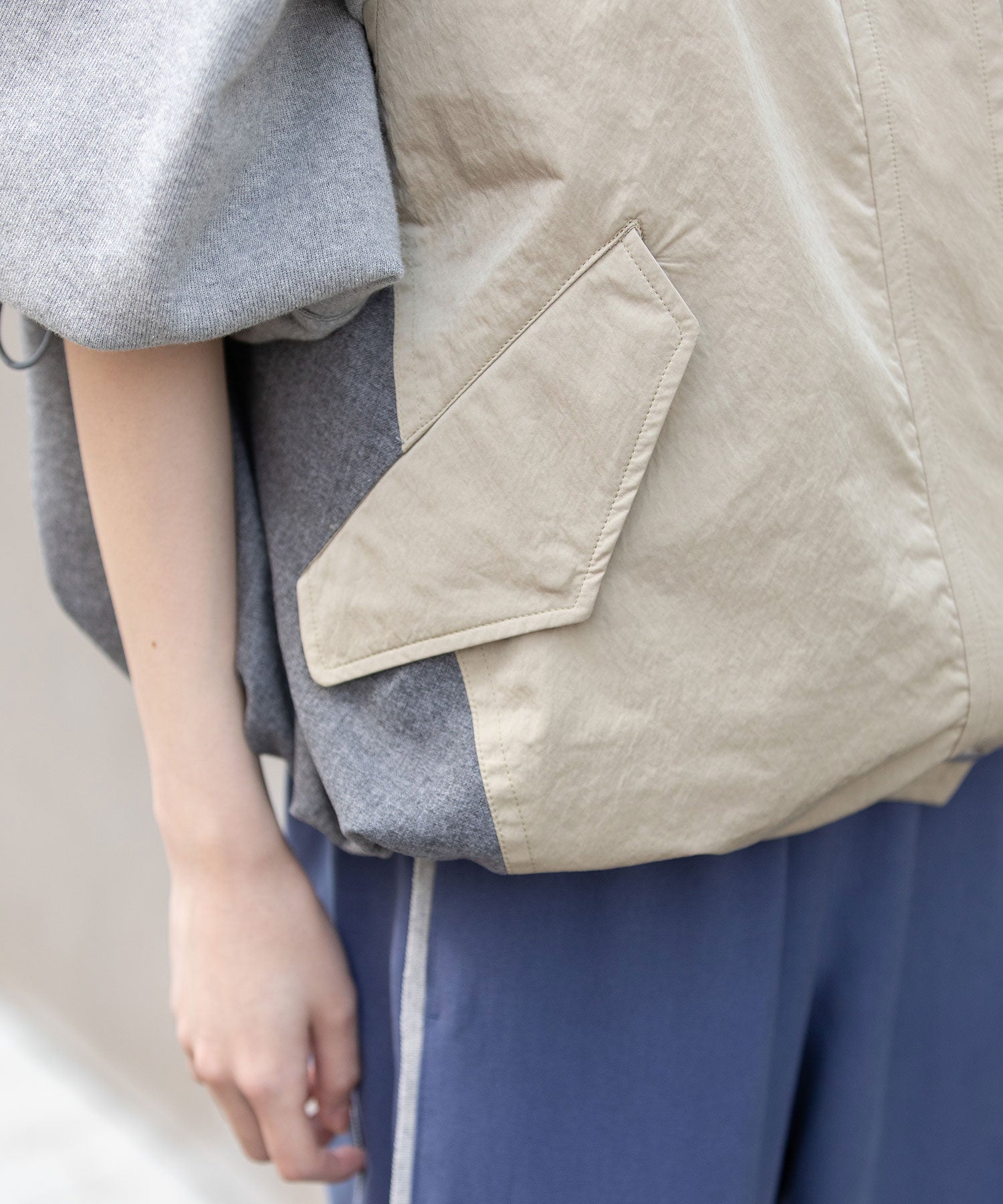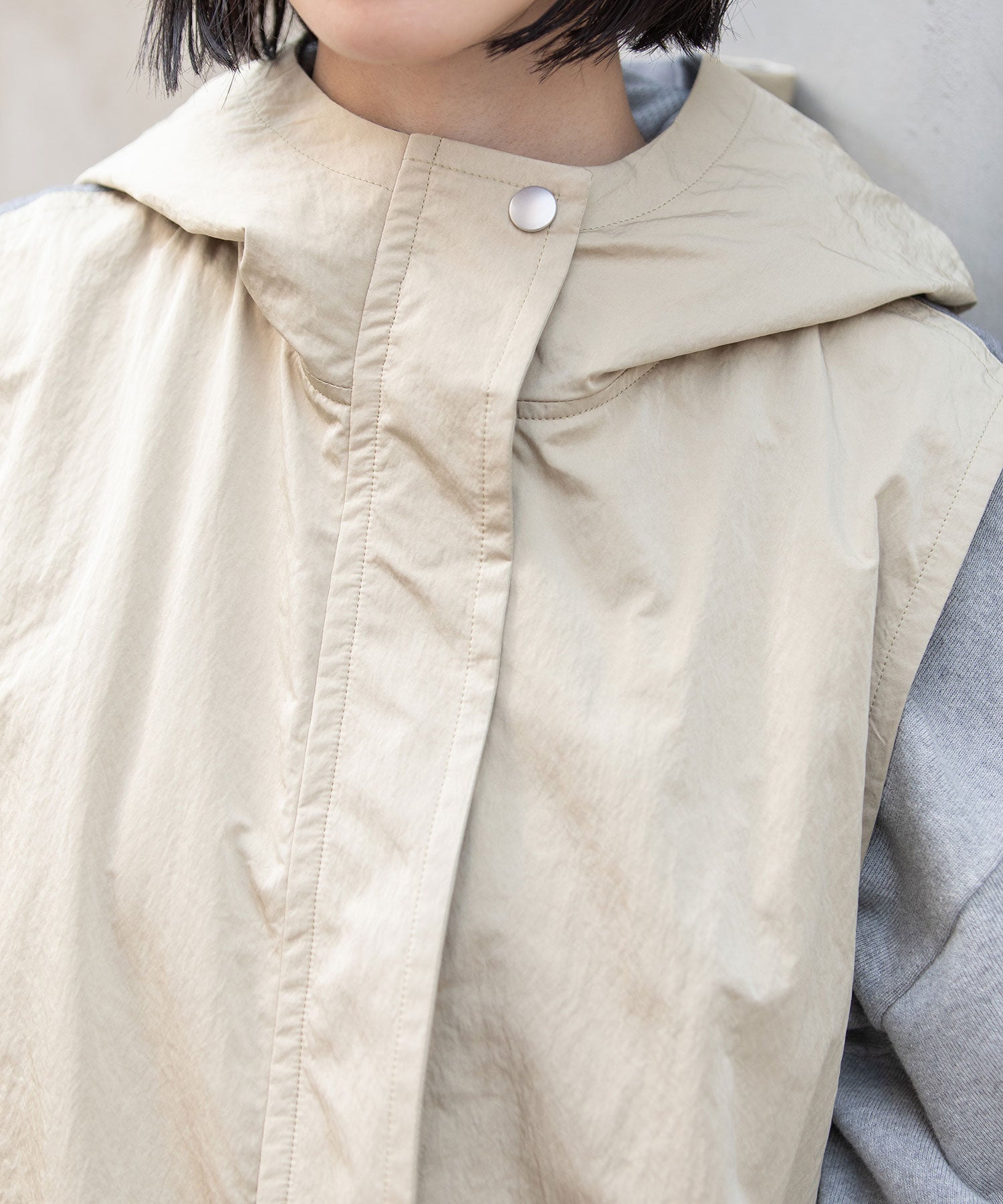 光沢感のあるツイル×梳毛調合繊の異素材をドッキングしたフーデッドベストです。