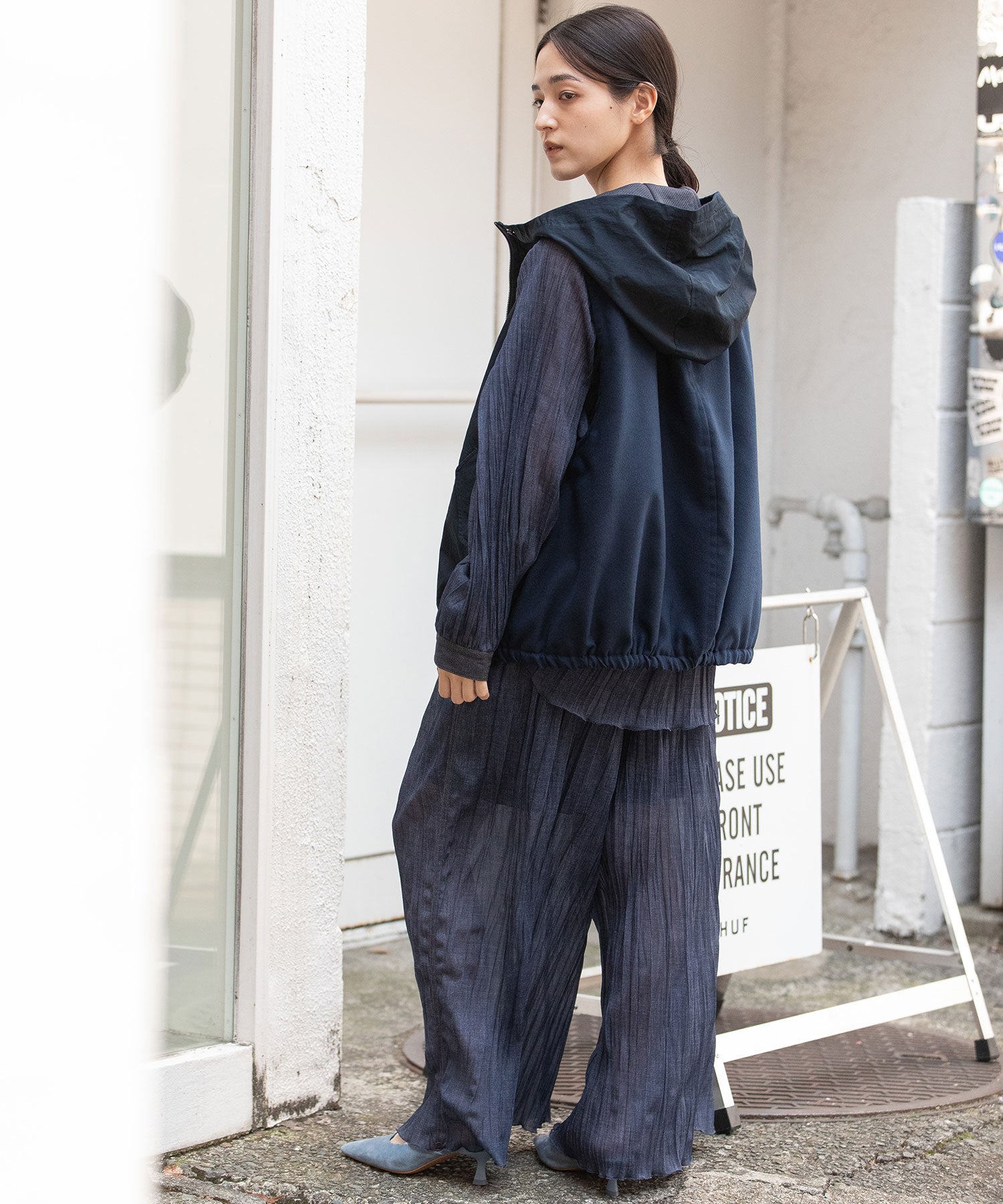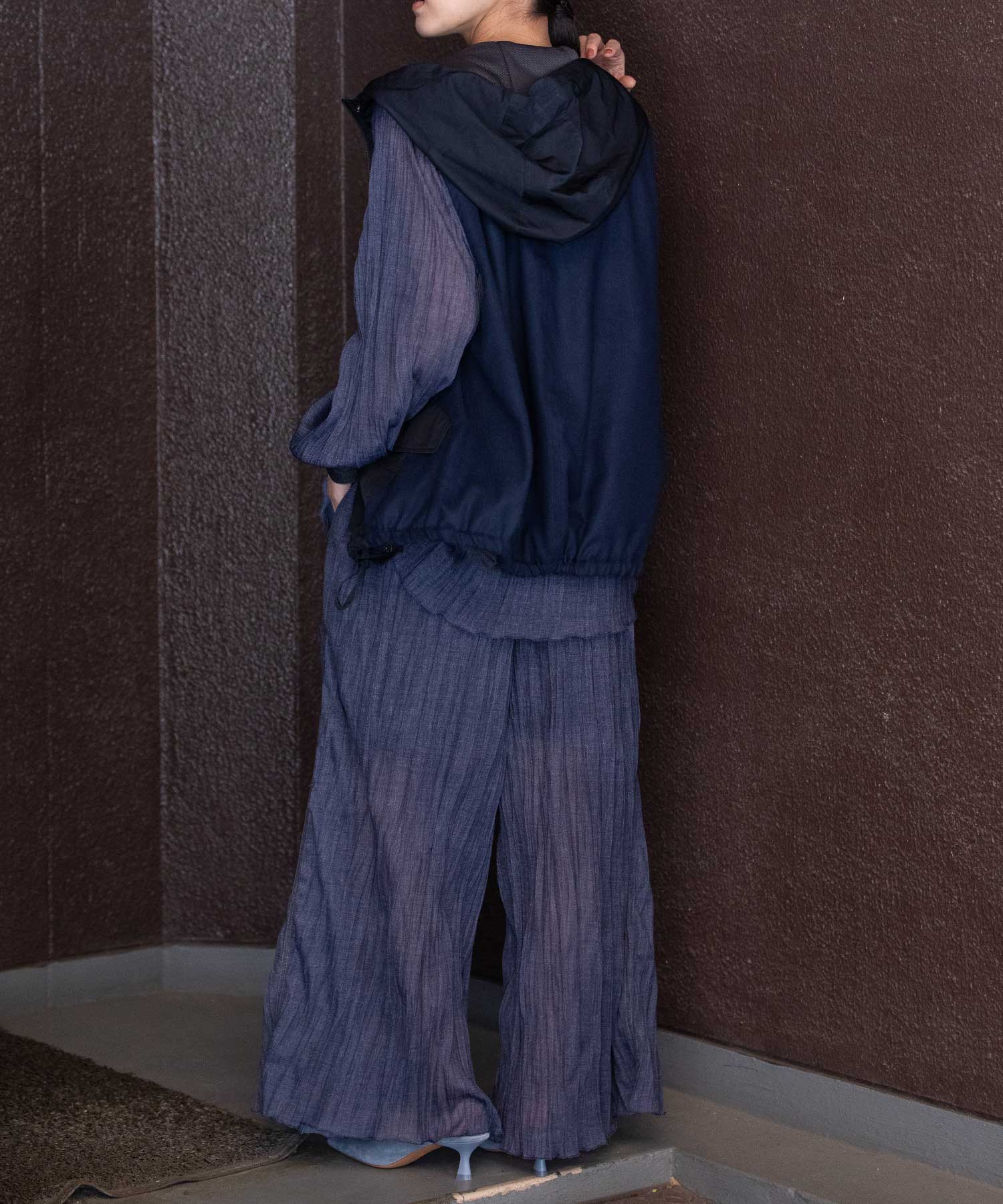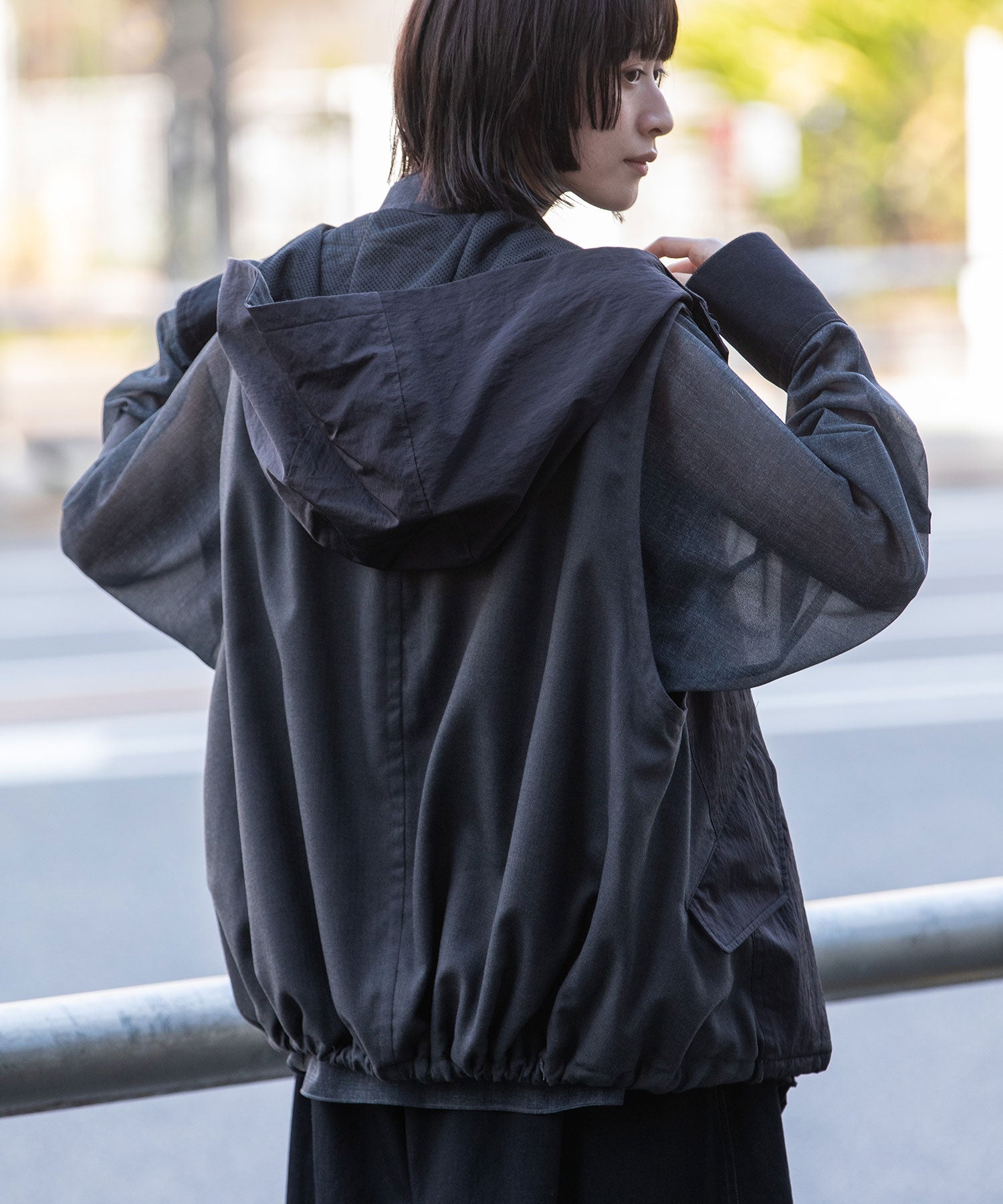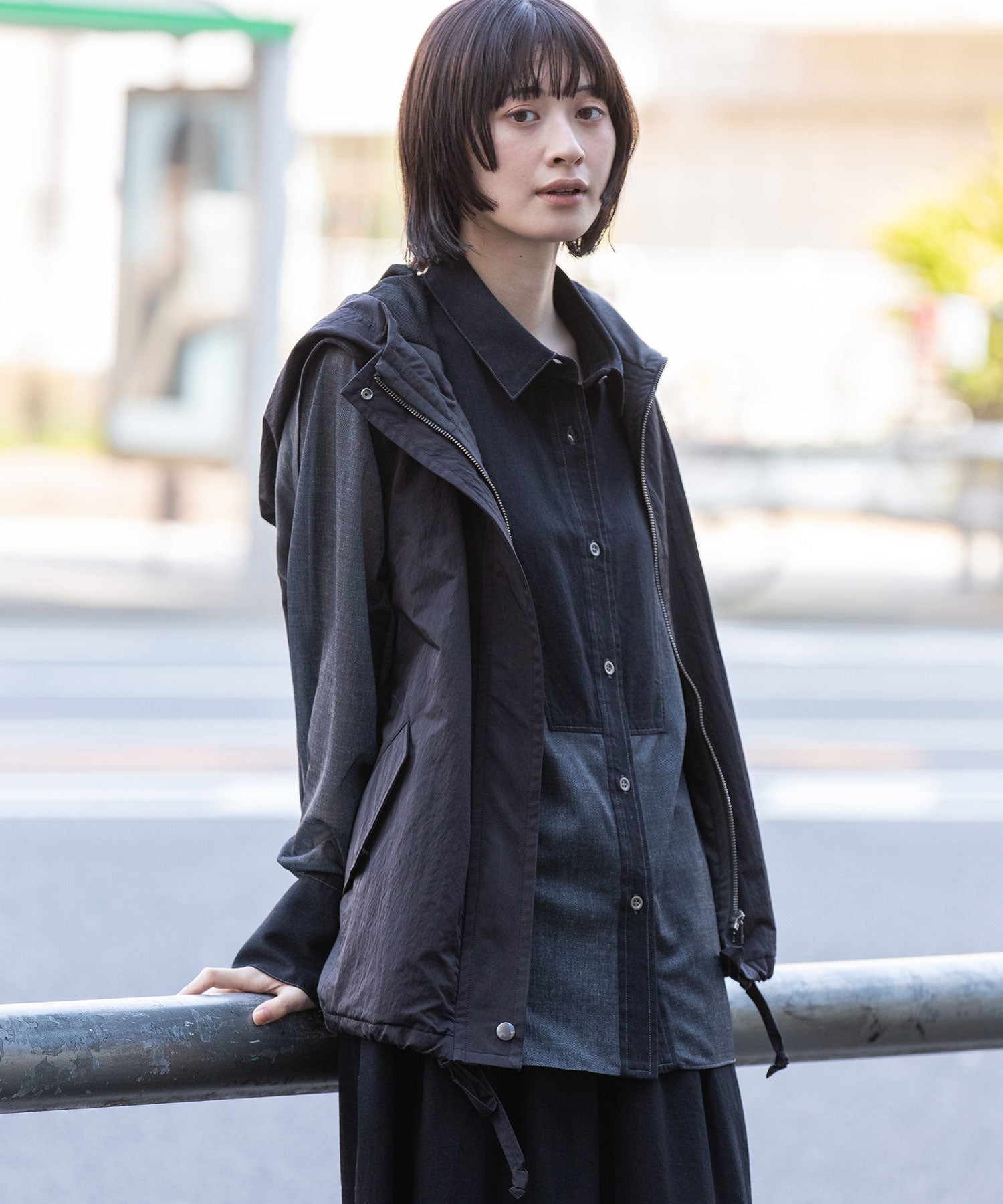 光沢感のあるツイル×梳毛調合繊の異素材をドッキングしたフーデッドベストです。