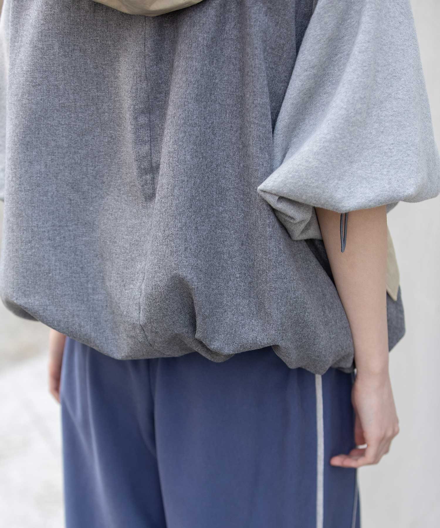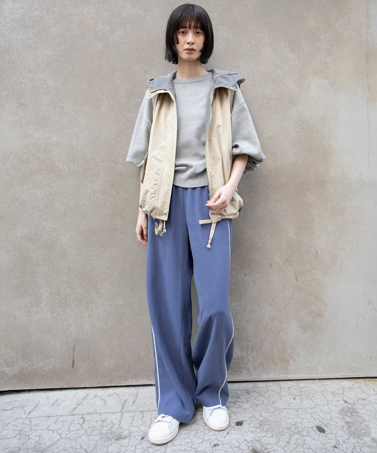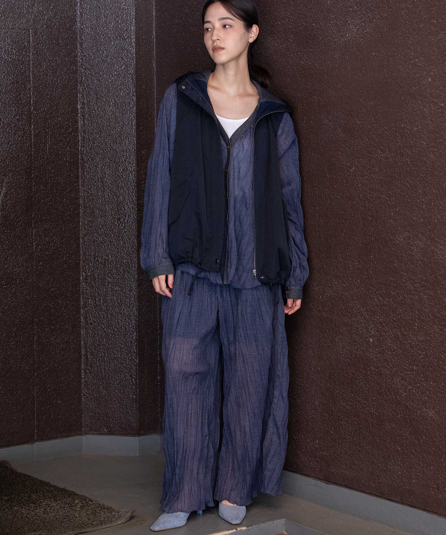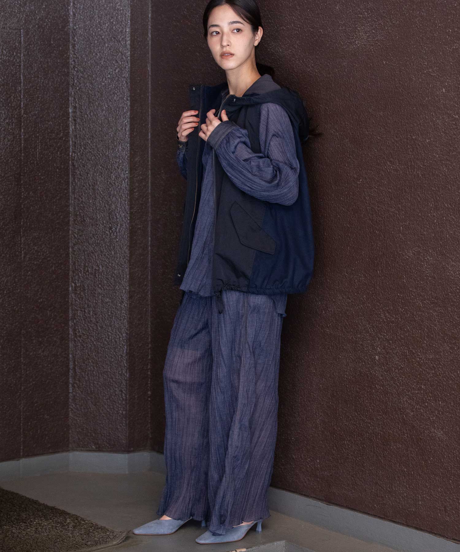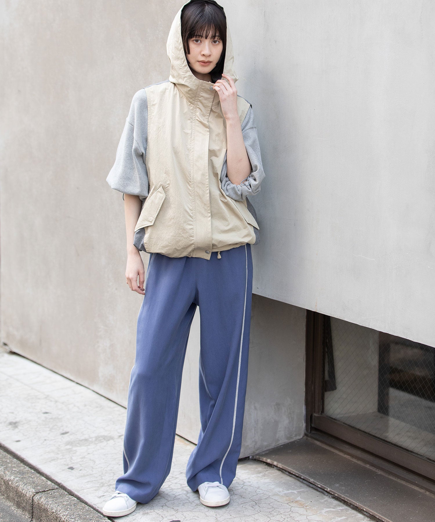 光沢感のあるツイル×梳毛調合繊の異素材をドッキングしたフーデッドベストです。