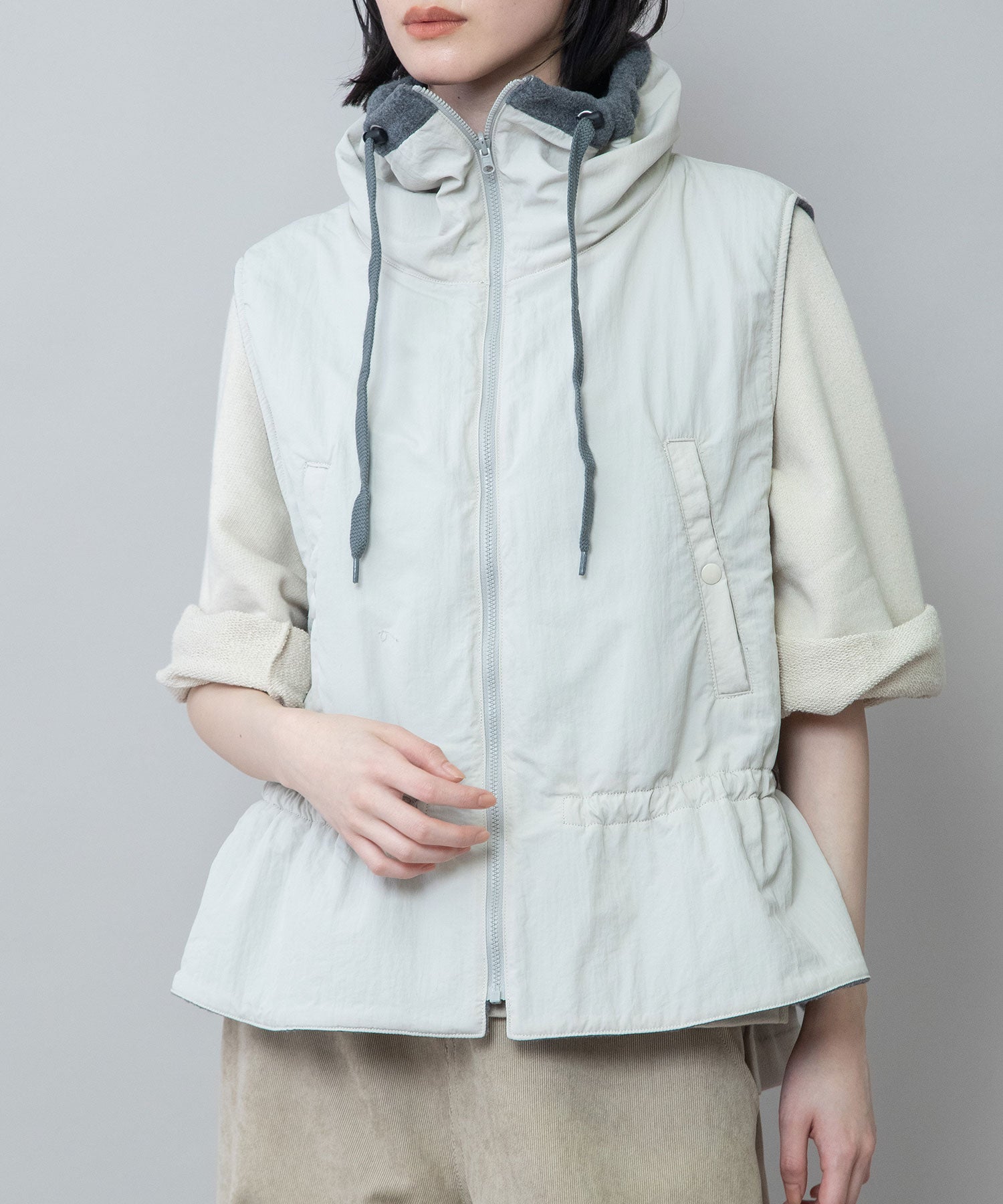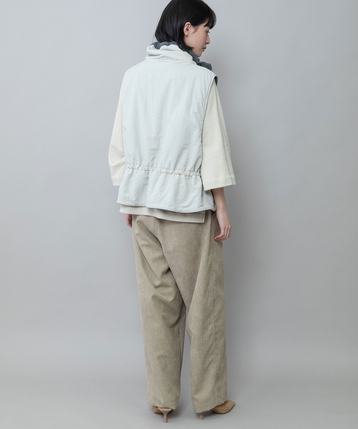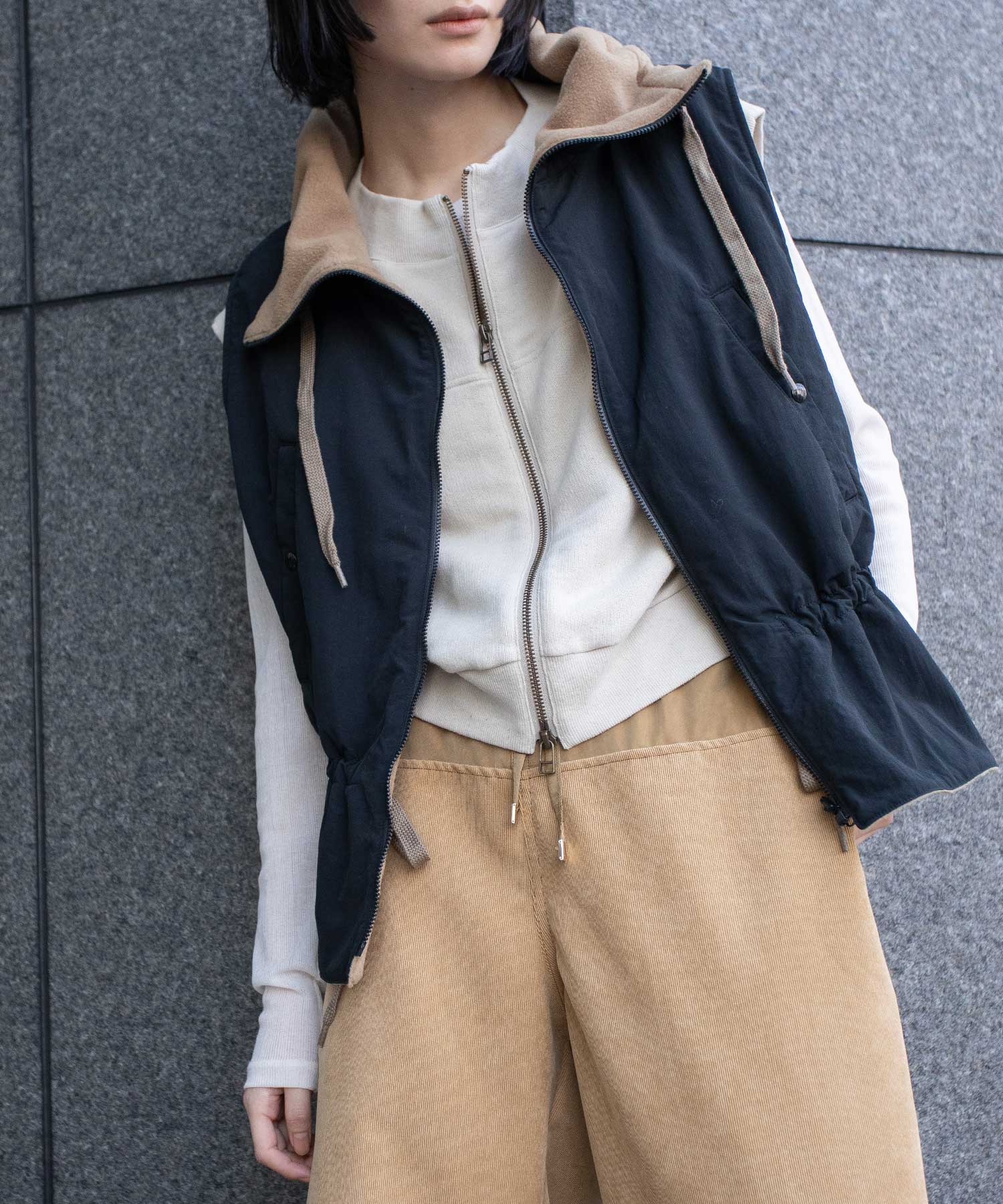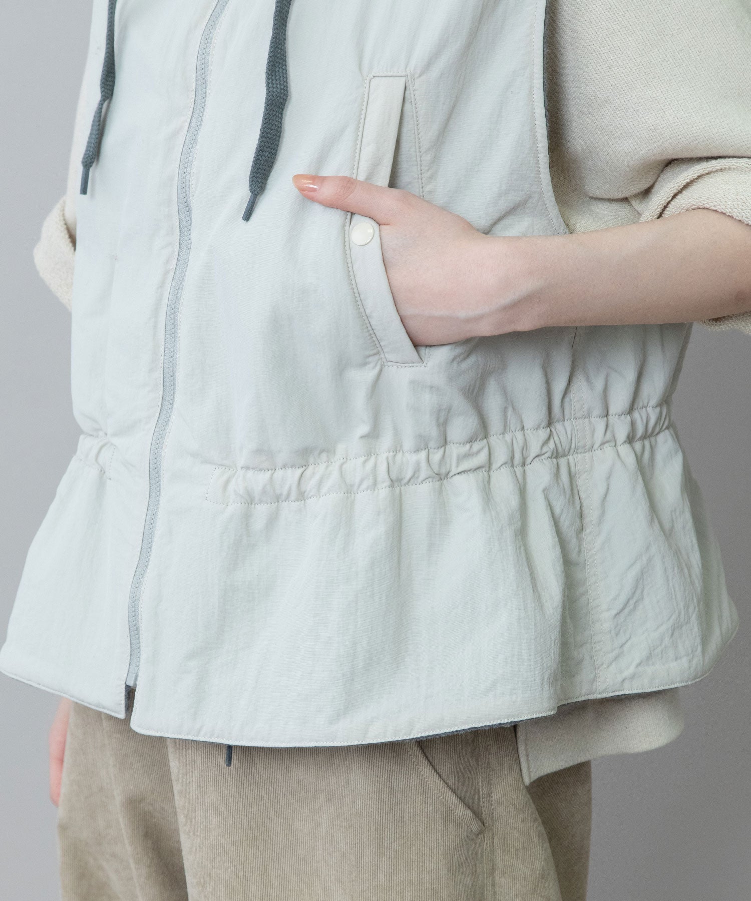 スタンドカラーとウエストがブラウジングできるスポーティなディテールのベストです。