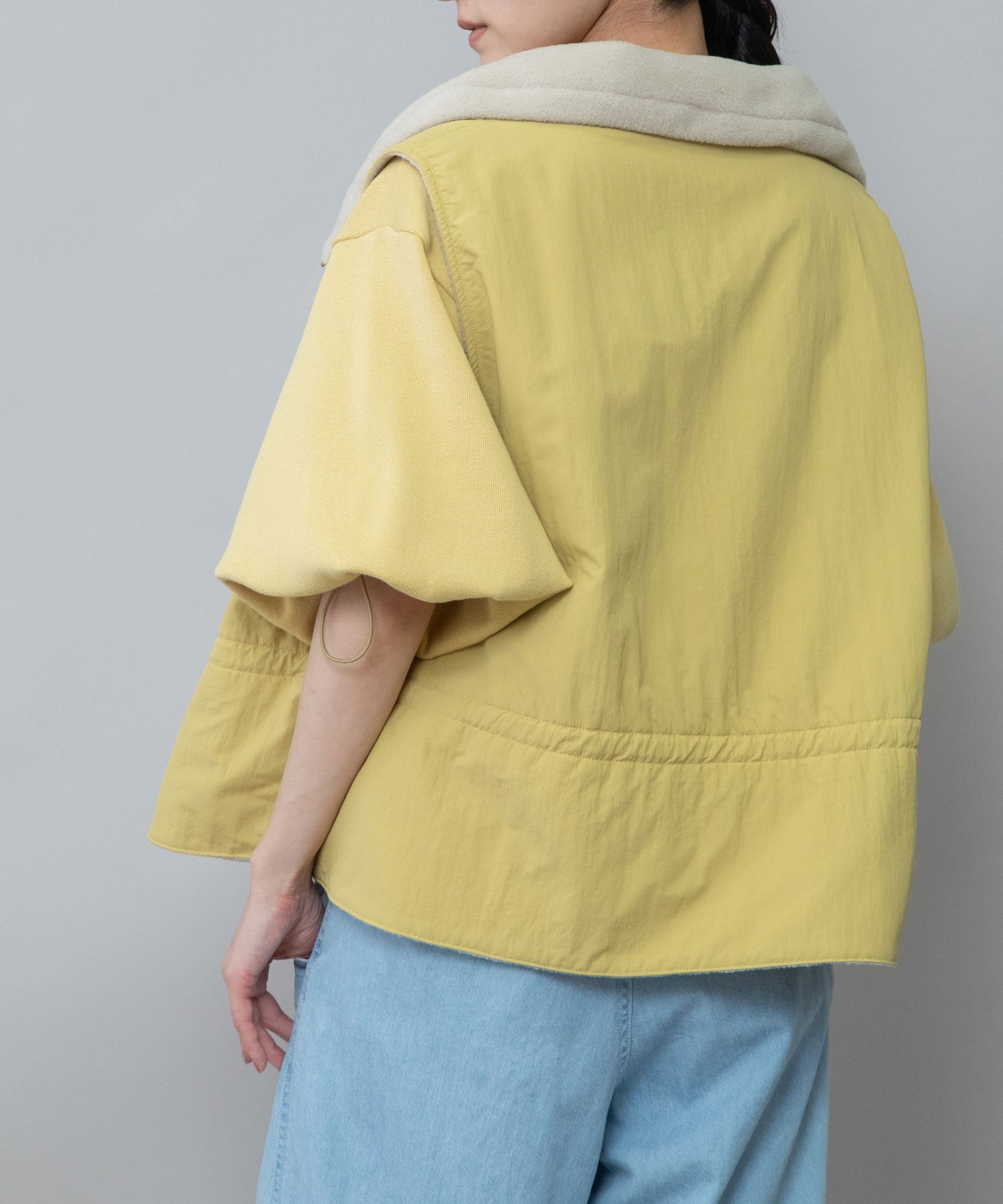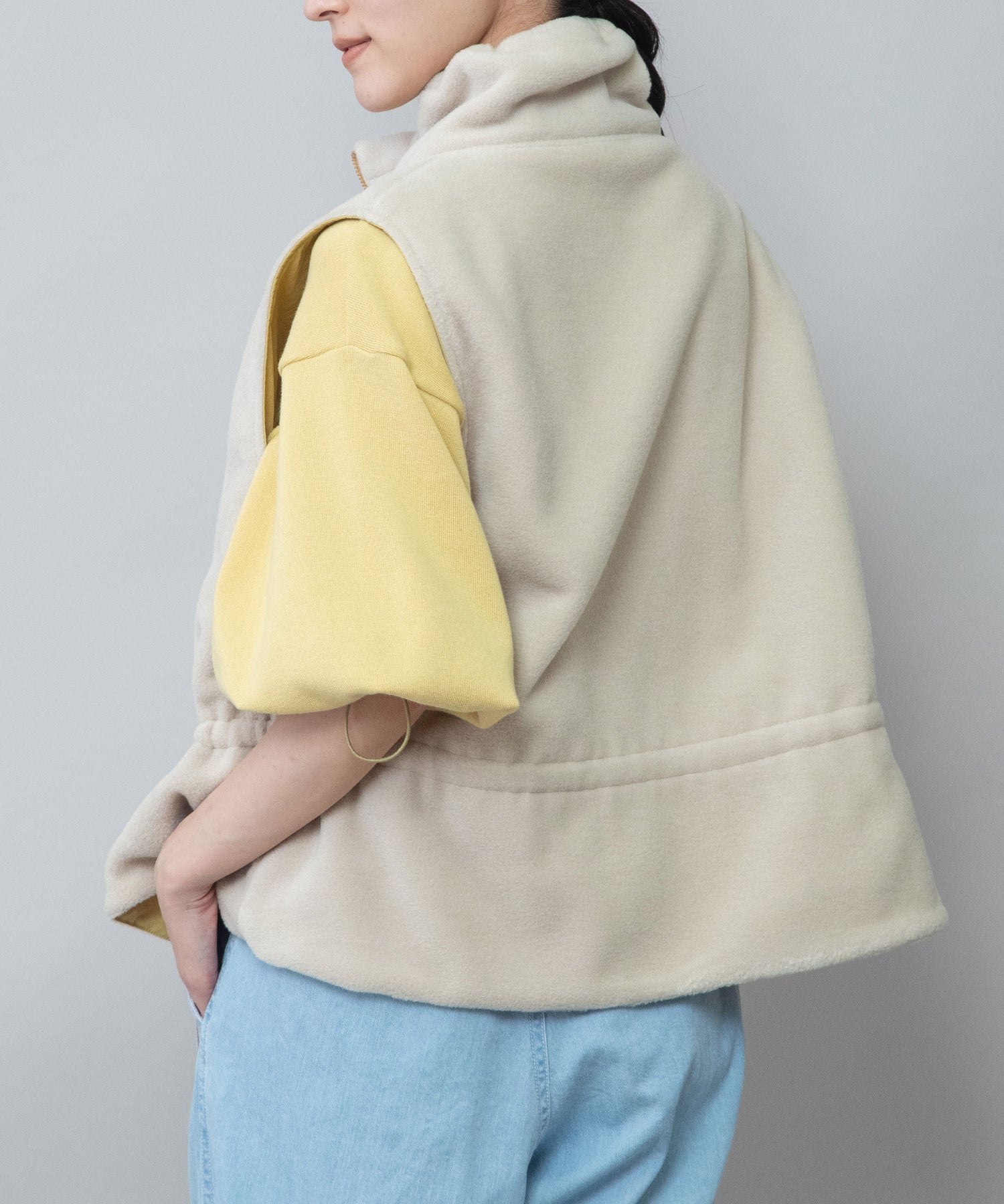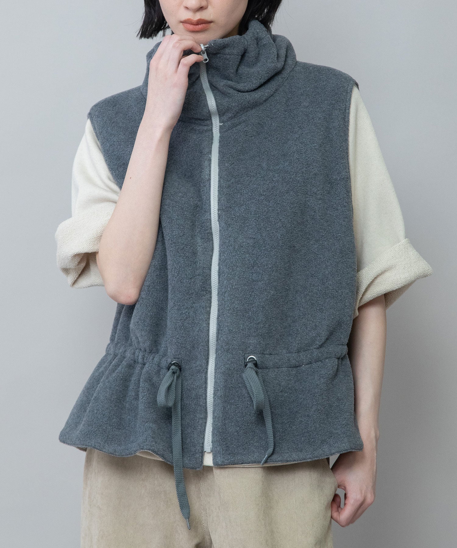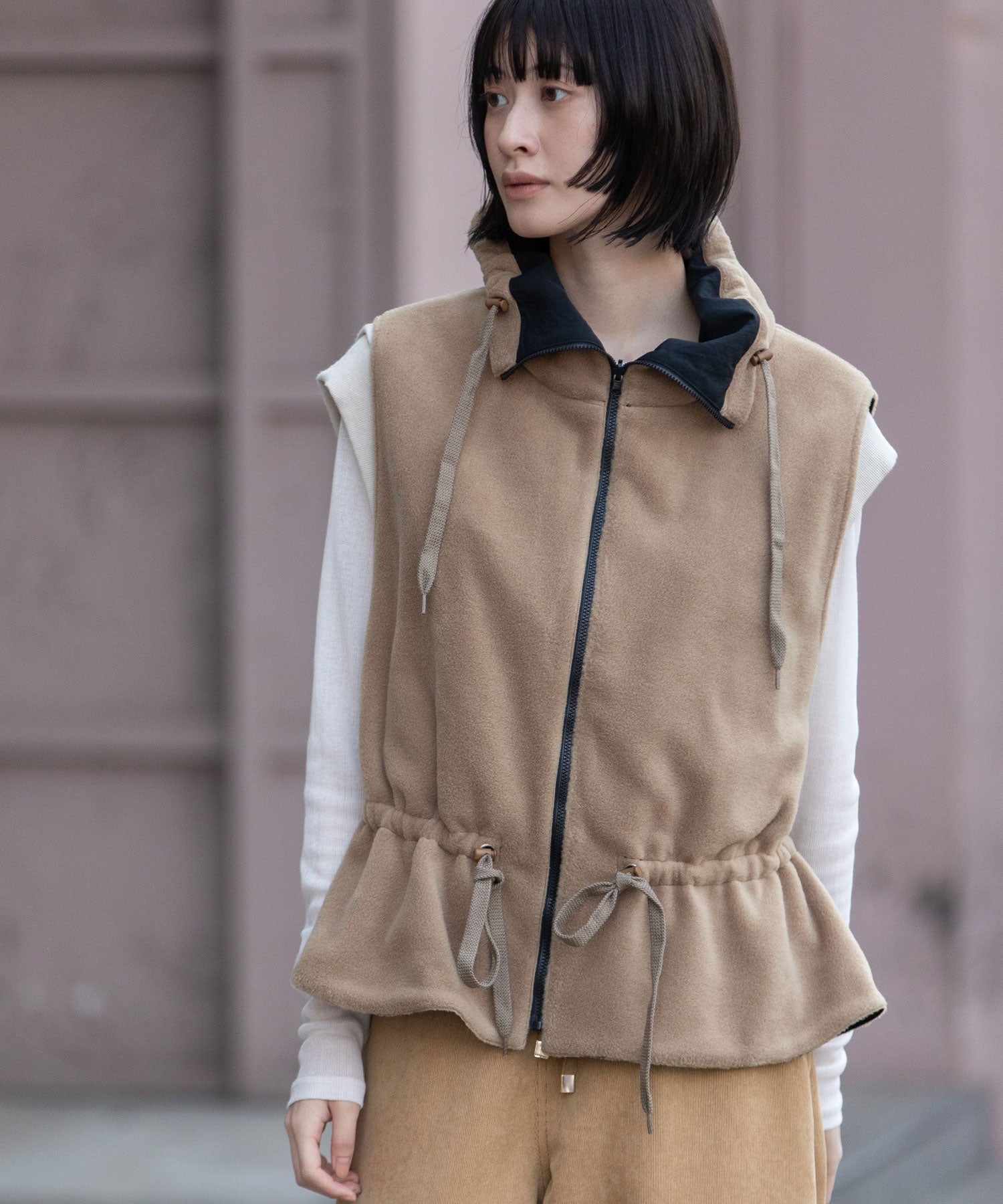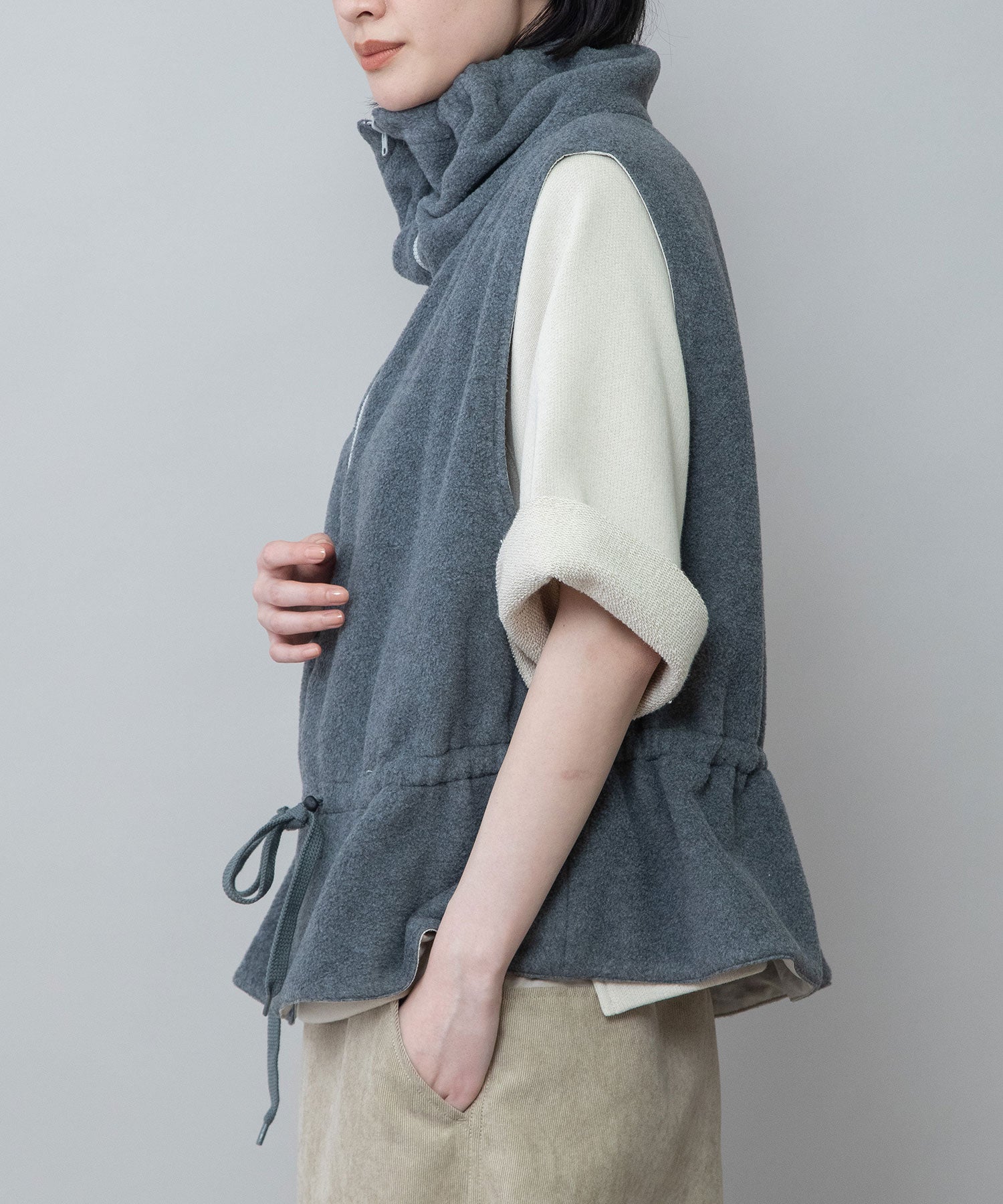 スタンドカラーとウエストがブラウジングできるスポーティなディテールのベストです。