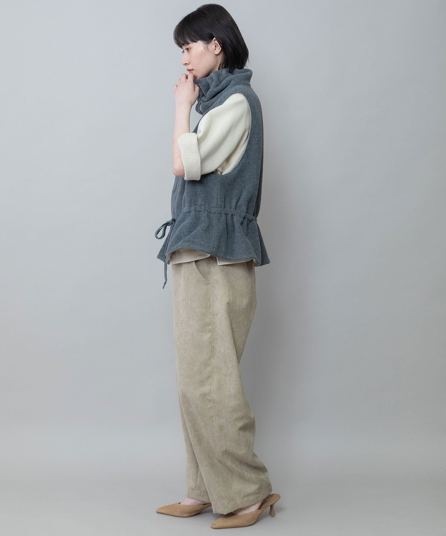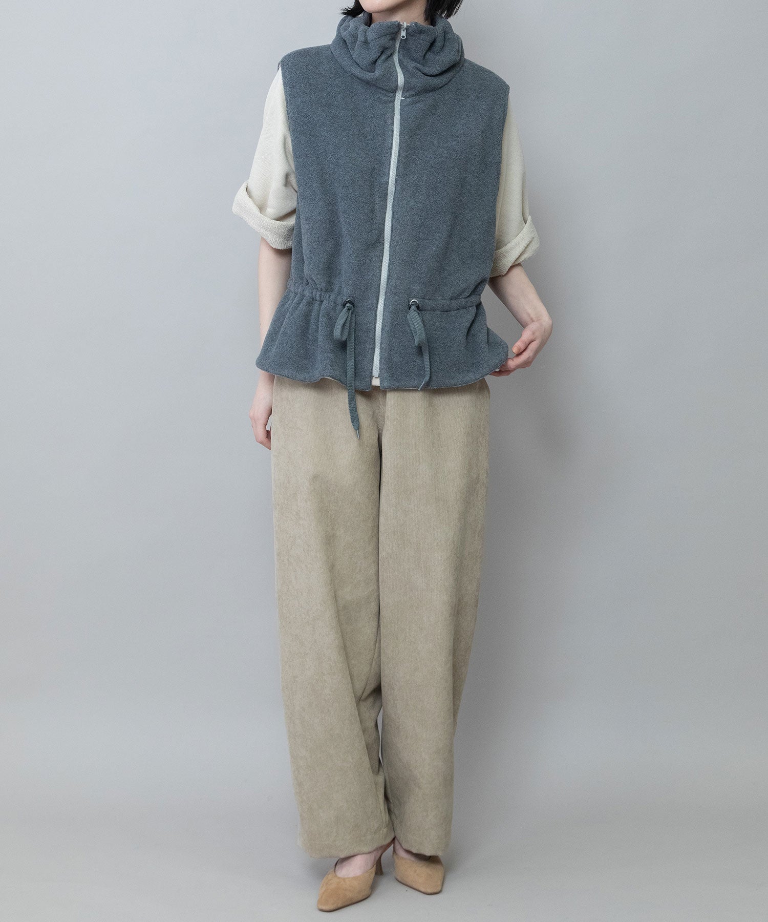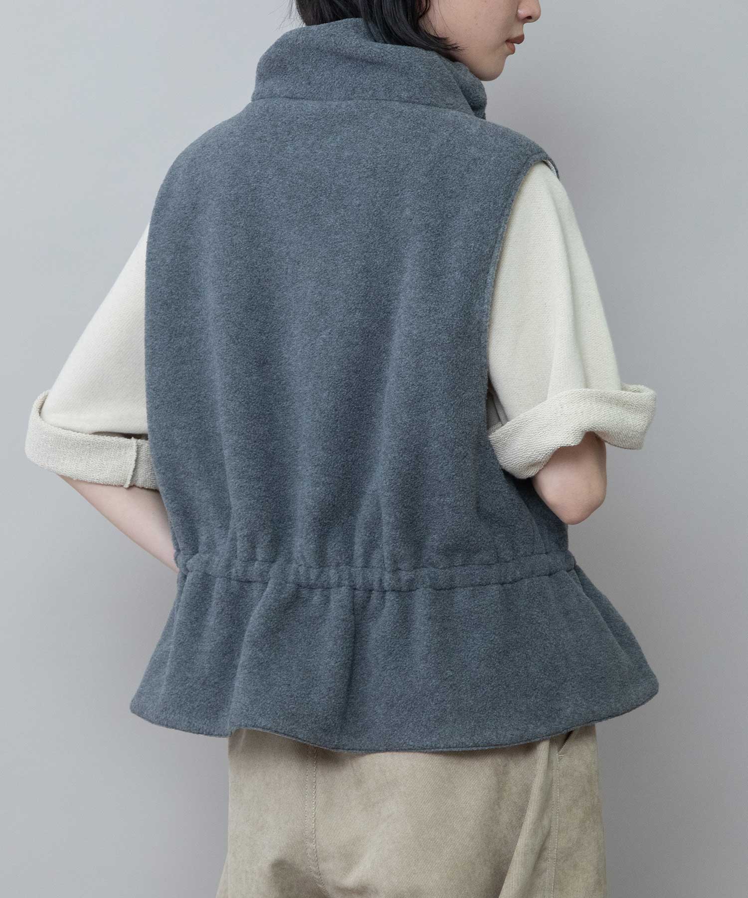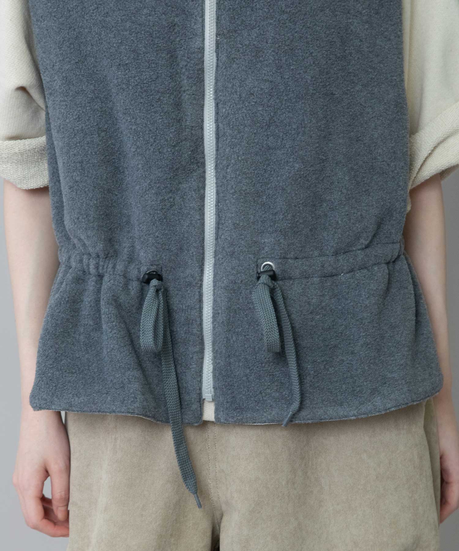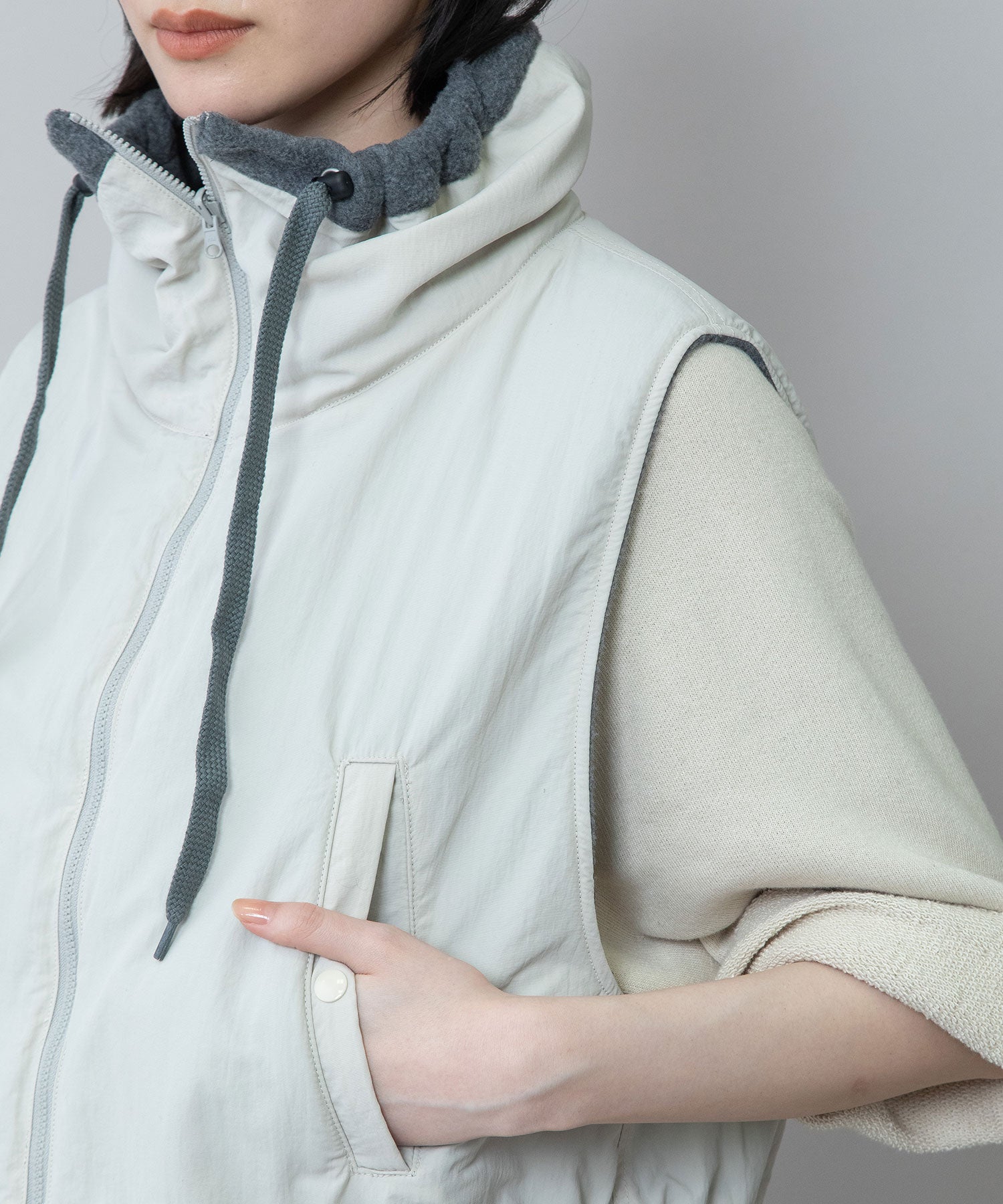 スタンドカラーとウエストがブラウジングできるスポーティなディテールのベストです。