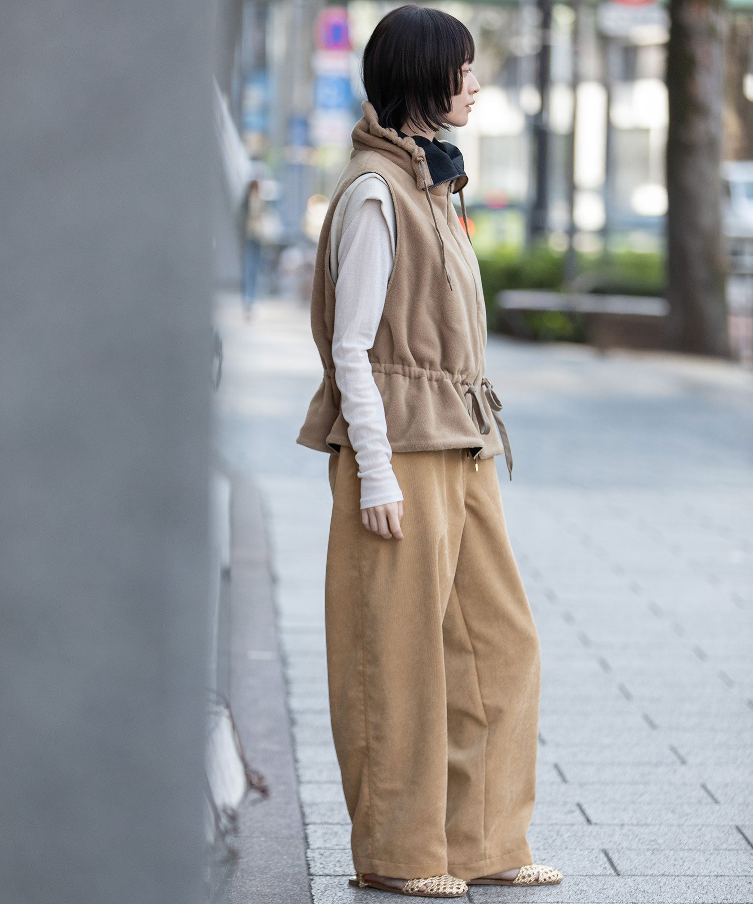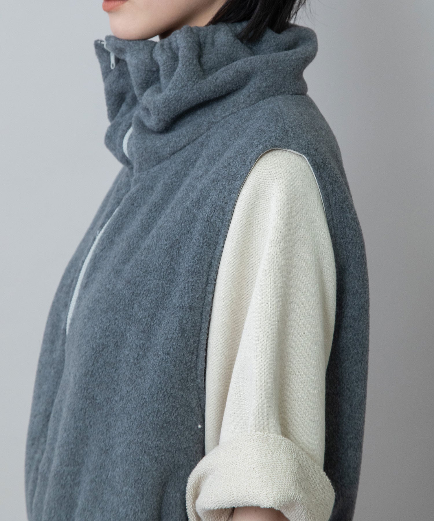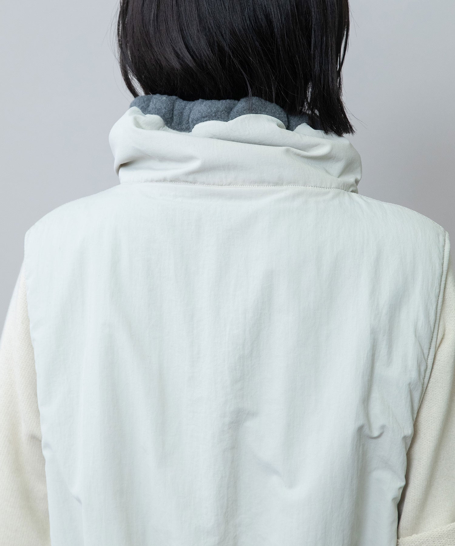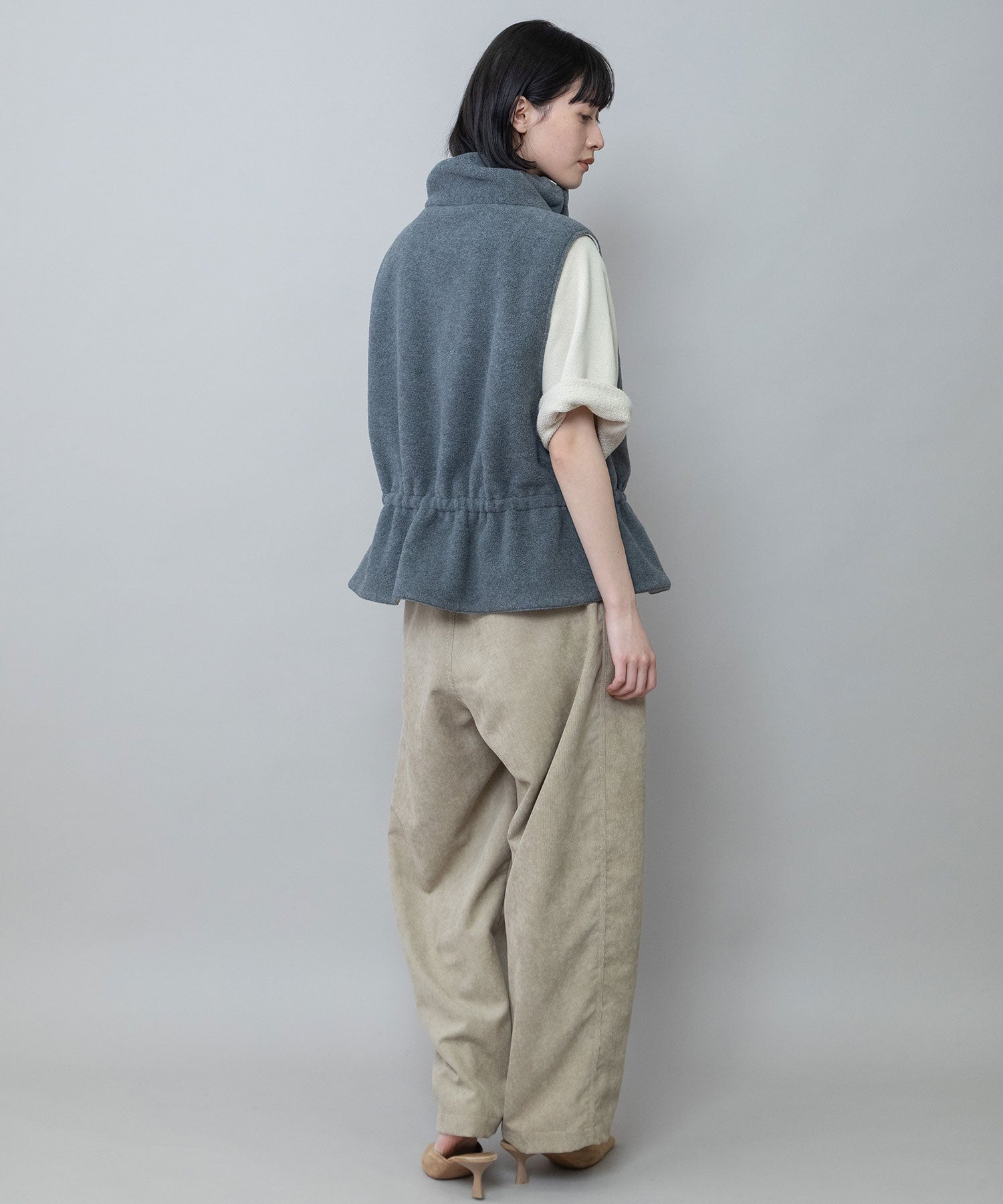 スタンドカラーとウエストがブラウジングできるスポーティなディテールのベストです。