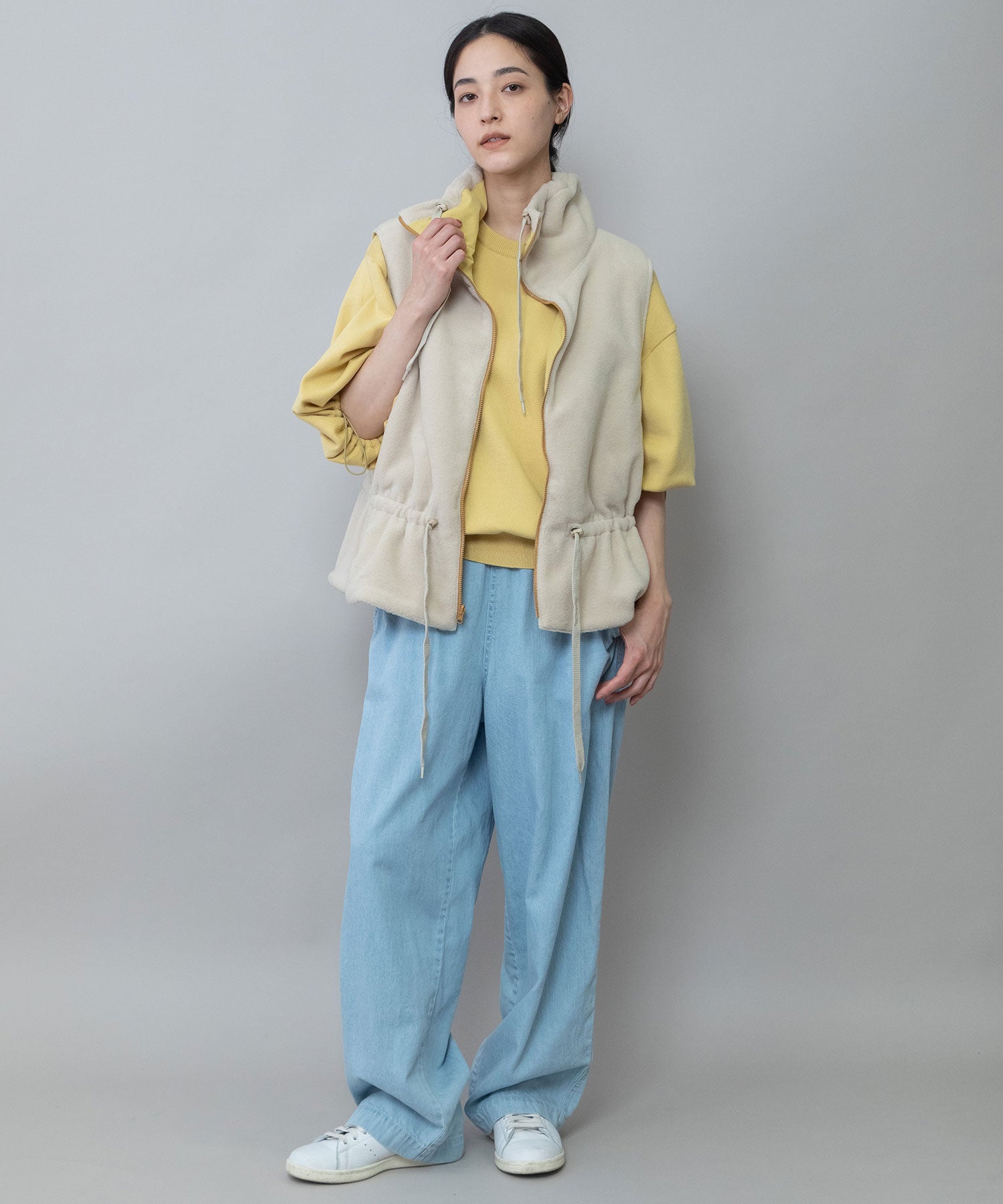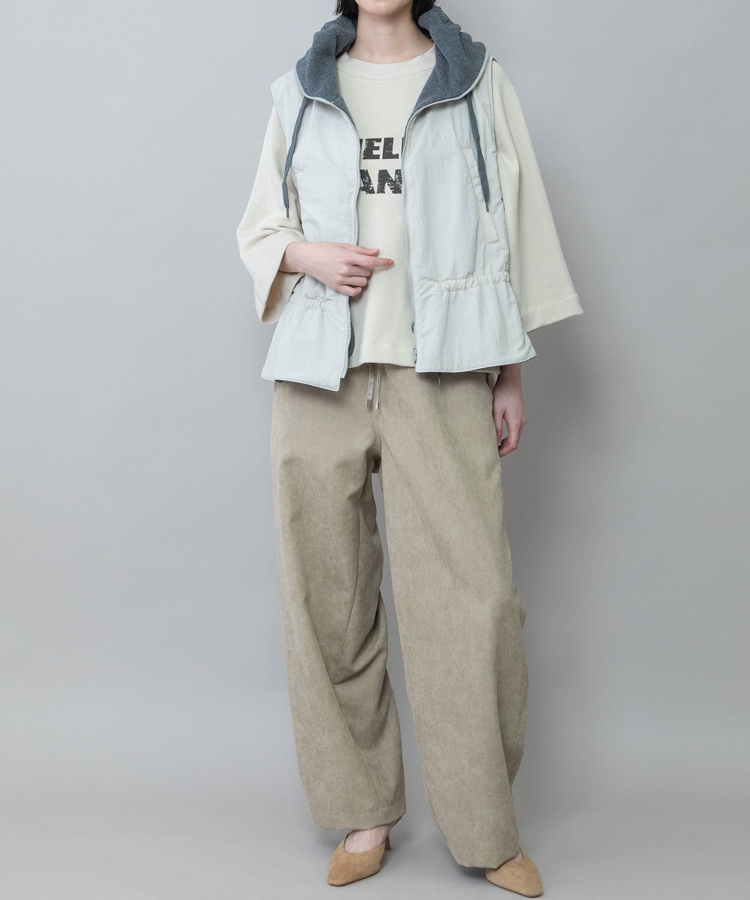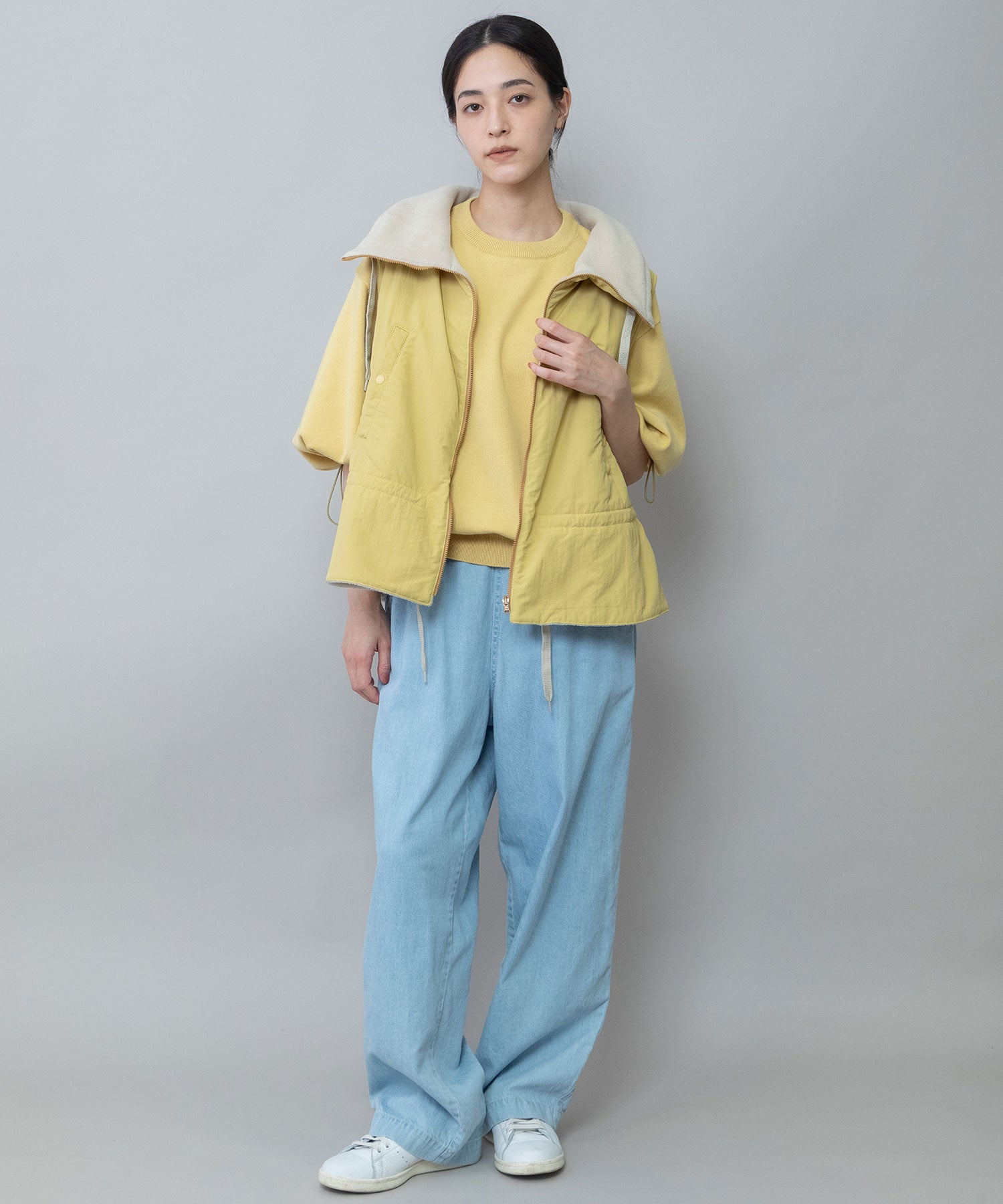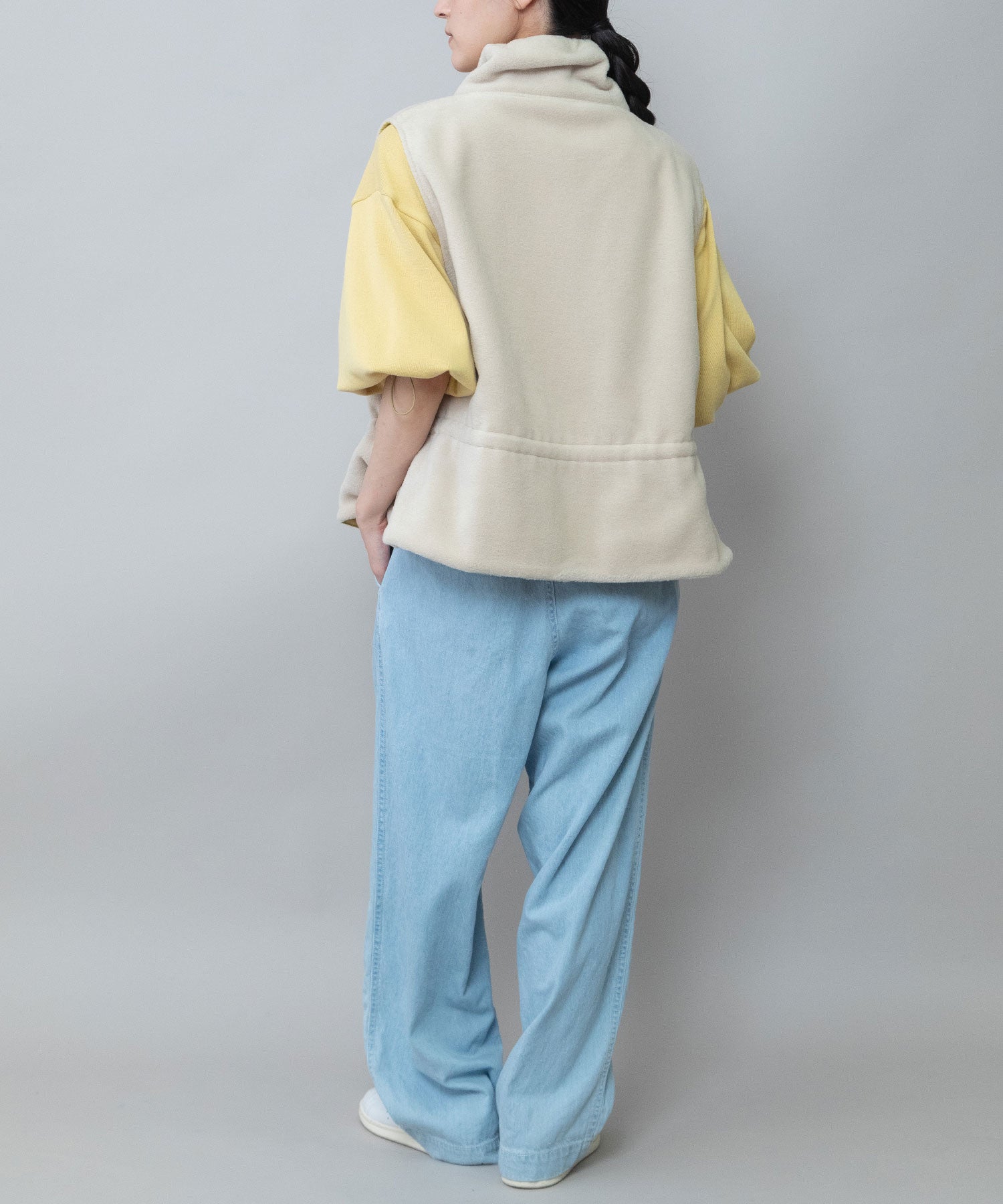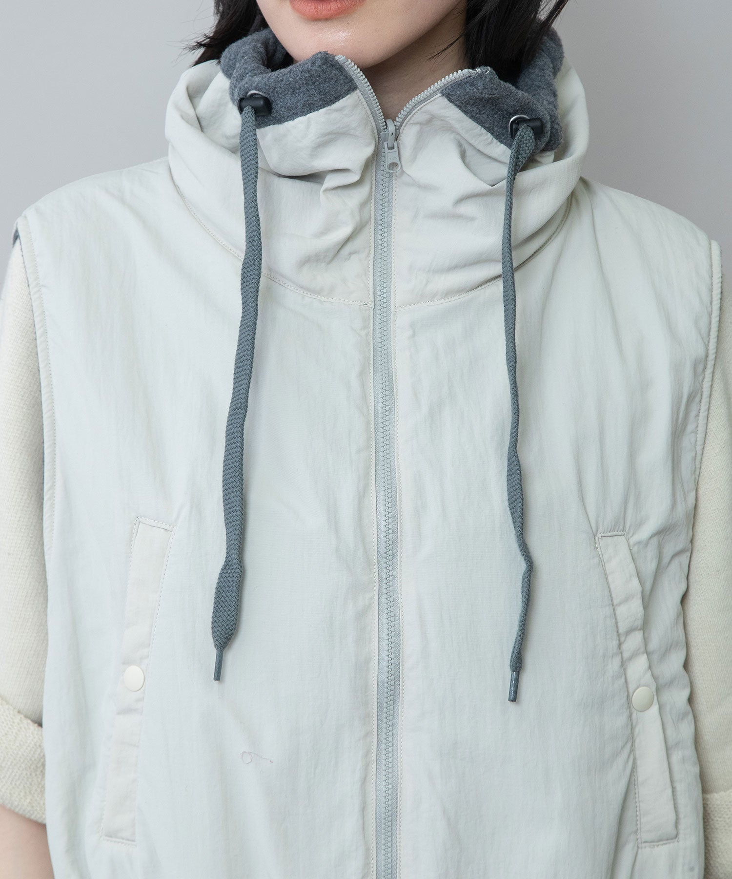 スタンドカラーとウエストがブラウジングできるスポーティなディテールのベストです。